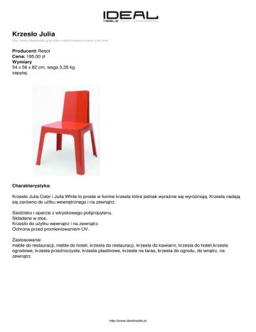 Krzesło Julia http://www.idealmeble.pl/pl/offer/meble/krzesla/krzeslo-julia.html/ Producent: Resol Cena: 195.00 zł Wymiary 54 x 56 x 82 cm, waga 3,35 kg zapytaj Charakterystyka: Krzesło Julia Color i Julia White to proste w formie krzesła które jednak wyraźnie się wyróżniają. Krzesła nadają się zarówno do użtku wewnętrznego i na zewnątrz. Siedzisko i oparcie z wtryskowego polipropylenu. Składane w stos. Krzesło do użytku wewnątrz i na zewnątrz. Ochrona przed promieniowaniem UV. Zastosowanie meble do restauracji, meble do hoteli, krzesła do restauracji, krzesła do kawiarni, krzesła do hoteli,krzesła ogrodowe, krzesła przeźroczyste, krzesła plastikowe, krzesła na taras, krzesła do ogrodu, do wnętrz, na zewnątrz. http://www.idealmeble.pl Dostępne wersje produktu: nazwa produktu Krzesło Julia warianty kolor biały cena 195.00zł dostępne Zapytaj Krzesło Julia kolor czarny 195.00zł Zapytaj Krzesło Julia kolor czerwony 195.00zł Zapytaj Krzesło Julia kolor brąz 195.00zł Zapytaj http://www.idealmeble.pl Zdjęcia produktu: http://www.idealmeble.pl Powered by TCPDF (www.tcpdf.org)
