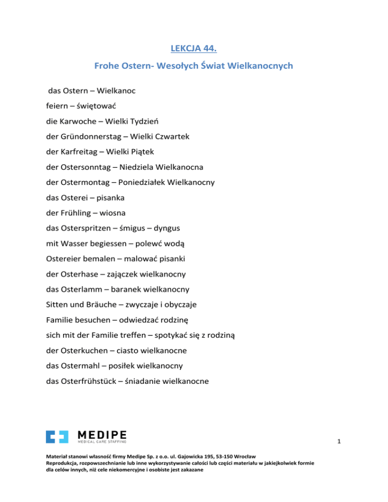 LEKCJA 44. Frohe Ostern- Wesołych Świat Wielkanocnych das Ostern – Wielkanoc feiern – świętować die Karwoche – Wielki Tydzień der Gründonnerstag – Wielki Czwartek der Karfreitag – Wielki Piątek der Ostersonntag – Niedziela Wielkanocna der Ostermontag – Poniedziałek Wielkanocny das Osterei – pisanka der Frühling – wiosna das Osterspritzen – śmigus – dyngus mit Wasser begiessen – polewć wodą Ostereier bemalen – malować pisanki der Osterhase – zajączek wielkanocny das Osterlamm – baranek wielkanocny Sitten und Bräuche – zwyczaje i obyczaje Familie besuchen – odwiedzać rodzinę sich mit der Familie treffen – spotykać się z rodziną der Osterkuchen – ciasto wielkanocne das Ostermahl – posiłek wielkanocny das Osterfrühstück – śniadanie wielkanocne 1 Materiał stanowi własność firmy Medipe Sp. z o.o. ul. Gajowicka 195, 53-150 Wrocław Reprodukcja, rozpowszechnianie lub inne wykorzystywanie całości lub części materiału w jakiejkolwiek formie dla celów innych, niż cele niekomercyjne i osobiste jest zakazane Ein Ostergedicht – wierszyk na Wielkanoc Osterhas’, Osterhas’ Komm zu mir und bring mir was! Schöne Sachen will ich sehen, Wenn ich in den Garten gehe! Ostereier will ich finden, für die netten, braven Kinder. 2 Materiał stanowi własność firmy Medipe Sp. z o.o. ul. Gajowicka 195, 53-150 Wrocław Reprodukcja, rozpowszechnianie lub inne wykorzystywanie całości lub części materiału w jakiejkolwiek formie dla celów innych, niż cele niekomercyjne i osobiste jest zakazane