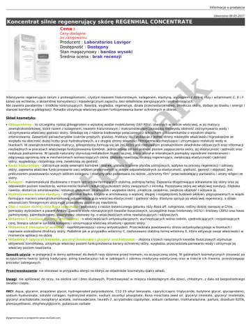 Informacje o produkcie Utworzono 08-03-2017 Koncentrat silnie regenerujący skórę REGENHIAL CONCENTRATE Cena : Ceny dostępne po zalogowaniu er m ar k Producent : Laboratorios Lavigor Dostępność : Dostępny Stan magazynowy : bardzo wysoki Średnia ocena : brak recenzji Intensywnie regenerujące serum z proteoglikanami, czystym kwasem hialuronowym, kolagenem, elastyną, wyciągiem z dzikiej róży i witaminami C, E i F. Łatwo się wchłania, o aksamitnej konsystencji i hipoalergicznym zapachu, bez składników alergizujących i podrażniających. Nie zawiera parabenów i środków koloryzujących. Nawilża, wygładza, regeneruje, działa przeciwstarzeniowo, zmiękcza skórę, dodaje jej blasku i energii i stanowi komfort w pielęgnacji. Ponadto utrzymuje właściwy poziom funkcjonowania barier ochronnych w skórze. Skład kosmetyku: ● ● ● ● ● ● at ● Glikoproteiny - to szczególny rodzaj glikogprotein o wysokiej wadze molekularnej (167 KDa), obecnych w skórze właściwej, w jej matrycy zewnątrzkomórkowej, które razem z kolagenem, kwasem hialuronowym i makromolekułami posiadają niezwykłą zdolność zatrzymywania wody i utrzymywania właściwej gęstości skóry. Składają się z rdzenia białkowego połączonego z łańcuchem glikozamikanów o wysokim stopniu zróżnicowania. Zawartość polisacharydów (cukrów prostych: glukozy, fruktozy itp.) wykazuje z jednej strony niezwykłe właściwości higroskopijne ze względu na obecność dużej liczby grup hydroksylowych, a z drugiej strony własności filmogenne wychwytujące i utrzymujące molekuły wody w tkankach. W zewnątrzkomórkowej matrycy, glikoproteiny formują się jak żel, który jest niebywałym przekaźnikiem składników odżywczych oraz informacji niezbędnych w procesach właściwego funkcjonowania komórek. Jednocześnie żel ten podnosi poziom zagęszczenia skóry, jej elastyczność i jędrność oraz redukuje podrażnienia. W sposób naturalny stymulują metabolizm tkanki łącznej, biorą udział w interakcjach pomiędzy sąsiednimi membranami i odgrywają ogromną rolę w mechanizmach wzmacniających skórę. Głęboko nawilżają, działają regenerująco, zwiększają elastyczność i jędrność skóry, wygładzają i rozjaśniają cerę, zwiększają jej gęstość. Kwas hialuronowy - zatrzymuje wodę wewnątrz komórek i tkanek, ułatwia krążenie płynów ustrojowych, wpływa na procesy regeneracji i odnowy skóry, zapewnia właściwe funkcjonowanie sieci włókien proteinowych w skórze odpowiedzialnych za elastyczność, giętkość, gęstość i objętość. Jest prekursorem powstawania nowych włókien kolagenu i elastyny oraz pozostawia na skórze „ochronny film” przeciwdziałający parowaniu i utraty wilgoci ze skóry. Kolagen - makromolekuła zbudowana z trzech łańcuchów formujących stabilną, potrójną helisę. Zapewnia długotrwające odnawianie się skóry oraz jej odpowiedni poziom nawilżenia, wzmocnienie tkanek i redukcję uszkodzeń skóry związanych z mimiką. Pozostawia skórę we właściwej kondycji. Głęboko nawilża, dostarcza aminokwasów, redukuje głębokość zmarszczek i wygładza skórę, zmiękcza, pojędrnia, zwiększa objętość i odżywia ją. Hydrolizowana forma elastyny - strukturalne białko, bogate w aminokwasy o wąskiej, długiej i rozgałęzionej budowie włókien, pogrupowanych w wiązki formujące macierz zewnątrzkomórkową, odpowiadającą za właściwą elastyczność i giętkość skóry. Elastyna sprzyja jej właściwej regeneracji, a dzięki własnościom filmogennym utrzymuje prawidłowy poziom jej nawilżenia. Olej z nasion dzikiej róży Rosa moschata - pozyskany z nasion botanicznego gatunku róży Rosa aff. rubiginosa, rośliny dzikiej rosnącej w Chile, pomiędzy wybrzeżem a pasem Andów. Zawiera wiele nienasyconych kwasów tłuszczowych, szczególnie kwas linolenowy (41%) i linolowy (39%) oraz kwas palmitynowy, palmitooleinowy, stearynowy, oleinowy itp. o właściwościach silnie rewitalizujących i odżywczych. Witamina C (sodium ascorbyl phosphate) - o właściwościach antyoksydacyjnych, wychwytujących wolne rodniki, ujednolicających i rozjaśniających cerę, biorąca udział w syntezie kolagenu i utrzymująca wlaściwą strukturę i gęstość skóry. Witamina E (tocopheryl acetate) - najefektywniejszy i cenny antyoksydant. Przeciwdziała powstawaniu stresu antyoksydacyjnego w tkankach i naprawia uszkodzone struktury skóry. Podobnie jak w przypadku witaminy C, zastosowano stabilną formę witaminy E, która aktywuje swoje właściwości w momencie aplikacji na skórę. Witamina F (glyceryl linoleate, glyceryl linolenate i glyceryl arachidonate) - złożona z trzech nasyconych kwasów tluszczowych stymuluje aktywność komórkową, utrzymuje właściwy poziom funkcjonowania bariery ochronnej skóry, wygładza, przeciwdziała parowaniu wody i utrzymuje jej właściwy poziom nawilżenia. w ● Sposób użycia: w pielęgnacji w domu aplikować do dwóch razy dziennie przed kremem, na oczyszczoną skórę. W gabinetach kosmetycznych stosować po oczyszczeniu twarzy (piling tradycyjny, piling kawitacyjny) lub w zabiegach z zakresu medycyny estetycznej oraz w trakcie ich trwania, przestrzegając procedur zabiegowych. Przeciwwskazania: nie stosować w przypadku alergii na któryś ze składników kosmetyku (patrz skład). Uwagi: nie aplikować do oczu, na okolice ust i błon śluzowych. Przechowywać w miejscu niedostępnym dla dzieci, chłodnym, z dala od bezpośredniego światła i ciepła. INCI: Aqua, glycerin, propylene glycol, hydrogenated polyisobutene, C12-15 alkyl benzoate, caprylic/capric triglyceride, butylene glycol, glycoproteins, sodium hyaluronate, soluble collagen, hydrolyzed elastin, sodium ascorbyl phosphate, Rosa moschata seed oil, glyceryl linoleate, glyceryl linolenate, glyceryl arachidonate, tocopheryl acetate, isohexadecane, laureth-7, acrylamides copolymer, sodium carbomer, triethanolamine, parfu
