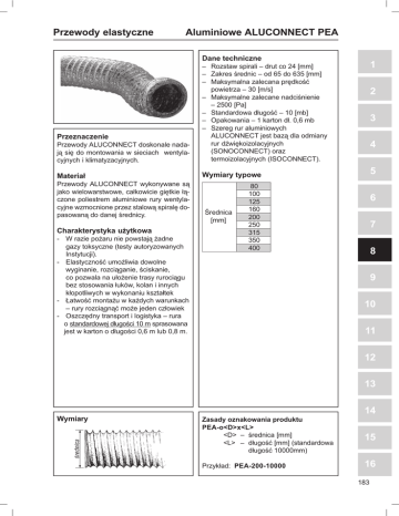 Przewody elastyczne Aluminiowe ALUCONNECT PEA Dane techniczne Przewody ALUCONNECT doskonale nadaj¹ siê do montowania w sieciach wentylacyjnych i klimatyzacyjnych. Rozstaw spirali drut co 24 [mm] Zakres rednic od 65 do 635 [mm] Maksymalna zalecana prêdkoæ powietrza 30 [m/s] Maksymalne zalecane nadcinienie 2500 [Pa] Standardowa d³ugoæ 10 [mb] Opakowania 1 karton d³. 0,6 mb Szereg rur aluminiowych ALUCONNECT jest baz¹ dla odmiany rur dwiêkoizolacyjnych (SONOCONNECT) oraz termoizolacyjnych (ISOCONNECT). Materia³ Wymiary typowe Przeznaczenie Przewody ALUCONNECT wykonywane s¹ jako wielowarstwowe, ca³kowicie giêtkie ³¹czone poliestrem aluminiowe rury wentylacyjne wzmocnione przez stalow¹ spiralê dopasowan¹ do danej rednicy. Charakterystyka u¿ytkowa - W razie po¿aru nie powstaj¹ ¿adne gazy toksyczne (testy autoryzowanych Instytucji). - Elastycznoæ umo¿liwia dowolne wyginanie, rozci¹ganie, ciskanie, co pozwala na u³o¿enie trasy ruroci¹gu bez stosowania ³uków, kolan i innych k³opotliwych w wykonaniu kszta³tek - £atwoæ monta¿u w ka¿dych warunkach rury rozci¹gn¹æ mo¿e jeden cz³owiek - Oszczêdny transport i logistyka rura o standardowej d³ugoci 10 m sprasowana jest w karton o d³ugoci 0,6 m lub 0,8 m. rednica [mm] 1 2 3 4 5 80 100 125 160 200 250 315 350 400 6 7 8 9 10 11 12 13 Wymiary Zasady oznakowania produktu PEA-o<D>x<L> <D> rednica [mm] <L> d³ugoæ [mm] (standardowa d³ugoæ 10000mm) Przyk³ad: PEA-200-10000 14 15 16 183