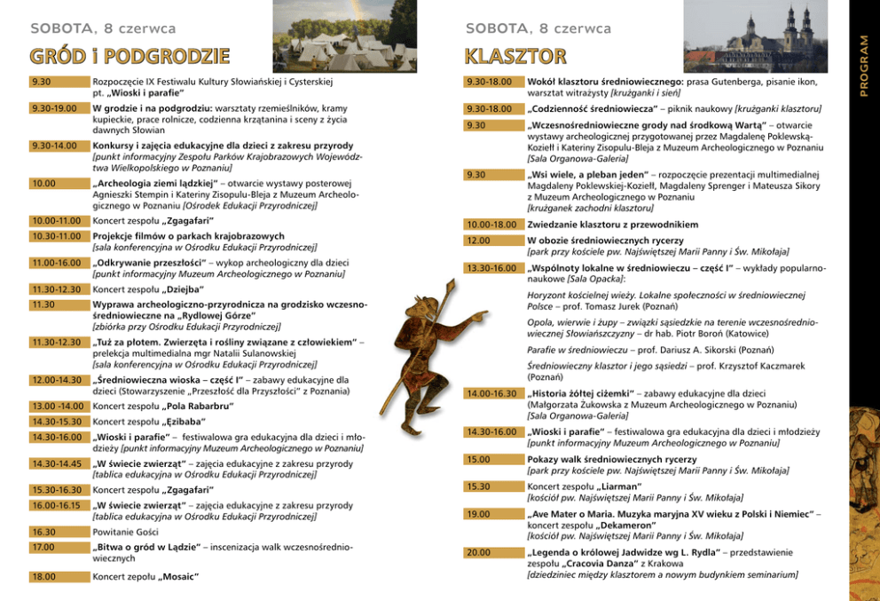 Sobota, 8 czerwca GRÓD i PODGRODZIE KLASZTOR 9.30 Rozpoczęcie IX Festiwalu Kultury Słowiańskiej i Cysterskiej pt. „Wioski i parafie” 9.30-18.00 Wokół klasztoru średniowiecznego: prasa Gutenberga, pisanie ikon, warsztat witrażysty [krużganki i sień] 9.30-19.00 W grodzie i na podgrodziu: warsztaty rzemieślników, kramy kupieckie, prace rolnicze, codzienna krzątanina i sceny z życia dawnych Słowian 9.30-18.00 „Codzienność średniowiecza” – piknik naukowy [krużganki klasztoru] 9.30-14.00 Konkursy i zajęcia edukacyjne dla dzieci z zakresu przyrody [punkt informacyjny Zespołu Parków Krajobrazowych Wojewódz- twa Wielkopolskiego w Poznaniu] 9.30 „Wczesnośredniowieczne grody nad środkową Wartą” – otwarcie wystawy archeologicznej przygotowanej przez Magdalenę Poklewską- Koziełł i Kateriny Zisopulu-Bleja z Muzeum Archeologicznego w Poznaniu [Sala Organowa-Galeria] 10.00 „Archeologia ziemi lądzkiej” – otwarcie wystawy posterowej Agnieszki Stempin i Kateriny Zisopulu-Bleja z Muzeum Archeologicznego w Poznaniu [Ośrodek Edukacji Przyrodniczej] 9.30 „Wsi wiele, a pleban jeden” – rozpoczęcie prezentacji multimedialnej Magdaleny Poklewskiej-Koziełł, Magdaleny Sprenger i Mateusza Sikory z Muzeum Archeologicznego w Poznaniu [krużganek zachodni klasztoru] 10.00-11.00 Koncert zespołu „Zgagafari” 10.00-18.00 Zwiedzanie klasztoru z przewodnikiem 10.30-11.00 Projekcje filmów o parkach krajobrazowych [sala konferencyjna w Ośrodku Edukacji Przyrodniczej] 12.00 11.00-16.00 „Odkrywanie przeszłości” – wykop archeologiczny dla dzieci [punkt informacyjny Muzeum Archeologicznego w Poznaniu] 11.30-12.30 Koncert zespołu „Dziejba” 11.30 Wyprawa archeologiczno-przyrodnicza na grodzisko wczesno- średniowieczne na „Rydlowej Górze” [zbiórka przy Ośrodku Edukacji Przyrodniczej] 11.30-12.30 „Tuż za płotem. Zwierzęta i rośliny związane z człowiekiem” – prelekcja multimedialna mgr Natalii Sulanowskiej [sala konferencyjna w Ośrodku Edukacji Przyrodniczej] 12.00-14.30 „Średniowieczna wioska – część I” – zabawy edukacyjne dla dzieci (Stowarzyszenie „Przeszłość dla Przyszłości” z Poznania) 13.00 -14.00 Koncert zespołu „Pola Rabarbru” 14.30-15.30 Koncert zespołu „Ęzibaba” 14.30-16.00 „Wioski i parafie” – festiwalowa gra edukacyjna dla dzieci i mło- dzieży [punkt informacyjny Muzeum Archeologicznego w Poznaniu] W obozie średniowiecznych rycerzy [park przy kościele pw. Najświętszej Marii Panny i Św. Mikołaja] 13.30-16.00 „Wspólnoty lokalne w średniowieczu – część I” – wykłady popularno- naukowe [Sala Opacka]: Horyzont kościelnej wieży. Lokalne społeczności w średniowiecznej Polsce – prof. Tomasz Jurek (Poznań) Opola, wierwie i żupy – związki sąsiedzkie na terenie wczesnośrednio- wiecznej Słowiańszczyzny – dr hab. Piotr Boroń (Katowice) Parafie w średniowieczu – prof. Dariusz A. Sikorski (Poznań) Średniowieczny klasztor i jego sąsiedzi – prof. Krzysztof Kaczmarek (Poznań) 14.00-16.30 „Historia żółtej ciżemki” – zabawy edukacyjne dla dzieci (Małgorzata Żukowska z Muzeum Archeologicznego w Poznaniu) [Sala Organowa-Galeria] 14.30-16.00 „Wioski i parafie” – festiwalowa gra edukacyjna dla dzieci i młodzieży [punkt informacyjny Muzeum Archeologicznego w Poznaniu] 14.30-14.45 „W świecie zwierząt” – zajęcia edukacyjne z zakresu przyrody [tablica edukacyjna w Ośrodku Edukacji Przyrodniczej] 15.00 Pokazy walk średniowiecznych rycerzy [park przy kościele pw. Najświętszej Marii Panny i Św. Mikołaja] 15.30-16.30 Koncert zespołu „Zgagafari” 15.30 Koncert zespołu „Liarman” [kościół pw. Najświętszej Marii Panny i Św. Mikołaja] 19.00 „Ave Mater o Maria. Muzyka maryjna XV wieku z Polski i Niemiec” – koncert zespołu „Dekameron” [kościół pw. Najświętszej Marii Panny i Św. Mikołaja] 20.00 „Legenda o królowej Jadwidze wg L. Rydla” – przedstawienie zespołu „Cracovia Danza” z Krakowa [dziedziniec między klasztorem a nowym budynkiem seminarium] 16.00-16.15 „W świecie zwierząt” – zajęcia edukacyjne z zakresu przyrody [tablica edukacyjna w Ośrodku Edukacji Przyrodniczej] 16.30 Powitanie Gości 17.00 „Bitwa o gród w Lądzie” – inscenizacja walk wczesnośrednio- wiecznych 18.00 Koncert zepołu „Mosaic” PROGRAM Sobota, 8 czerwca NIEDZIELA, 9 czerwca GRÓD i PODGRODZIE KLASZTOR 9.30-17.00 W grodzie i na podgrodziu: warsztaty rzemieślników, kramy kupieckie, prace rolnicze, codzienna Krzątanina i sceny z życia dawnych Słowian 9.30-17.00 Wokół klasztoru średniowiecznego: prasa Gutenberga, pisanie ikon, warsztat witrażysty [krużganki i sień] 9.30-10.00 Projekcje filmów o parkach krajobrazowych [sala konferencyjna w Ośrodku Edukacji Przyrodniczej] 9.30-17.00 „Codzienność średniowiecza” – piknik naukowy [krużganki] 9.30-14.00 Konkursy i zajęcia edukacyjne dla dzieci z zakresu przyrody [punkt informacyjny Zespołu Parków Krajobrazowych Województwa Wielkopolskiego w Poznaniu] 10.00 Wyprawa archeologiczno-przyrodnicza na grodzisko wczesnośredniowieczne na „Rydlowej Górze” [zbiórka przy Ośrodku Edukacji Przyrodniczej] 10.00 -11.00 Koncert zespołu „Pola Rabarbru” 10.30-13.00 „Średniowieczna wioska – część II” – zabawy edukacyjne dla dzieci (Stowarzyszenie „Przeszłość dla Przyszłości” z Poznania) 10.30-12.00 „Wspólnoty lokalne w średniowieczu – część II” – wykłady populano naukowe [sala konferencyjna w Ośrodku Edukacji Przyrodniczej]: 10.00-16.30 Zwiedzanie klasztoru z przewodnikiem 11.00 „Miłość z nich jest największa” – spektakl grupy teatralnej WSDTS w Lądzie [dziedziniec między klasztorem a nowym budynkiem seminarium] 11.00 W obozie średniowiecznych rycerzy [park przy kościele pw. Najświętszej Marii Panny i Św. Mikołaja] 12.00-14.00 „Historia żółtej ciżemki” – zabawy edukacyjne dla dz