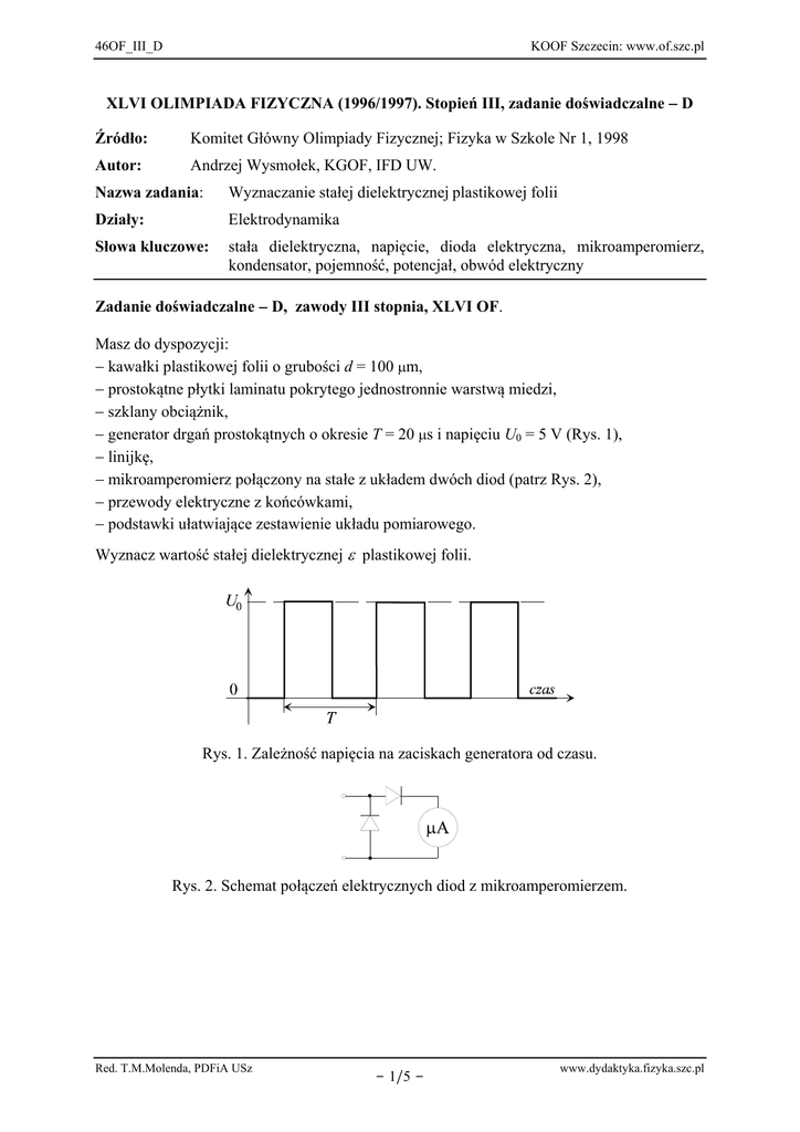 46OF_III_D KOOF Szczecin: www.of.szc.pl XLVI OLIMPIADA FIZYCZNA (1996/1997). Stopień III, zadanie doświadczalne − D Źródło: Komitet Główny Olimpiady Fizycznej; Fizyka w Szkole Nr 1, 1998 Autor: Andrzej Wysmołek, KGOF, IFD UW. Nazwa zadania: Wyznaczanie stałej dielektrycznej plastikowej folii Działy: Elektrodynamika Słowa kluczowe: stała dielektryczna, napięcie, dioda elektryczna, mikroamperomierz, kondensator, pojemność, potencjał, obwód elektryczny Zadanie doświadczalne − D, zawody III stopnia, XLVI OF. Masz do dyspozycji: − kawałki plastikowej folii o grubości d = 100 μm, − prostokątne płytki laminatu pokrytego jednostronnie warstwą miedzi, − szklany obciążnik, − generator drgań prostokątnych o okresie T = 20 μs i napięciu U0 = 5 V (Rys. 1), − linijkę, − mikroamperomierz połączony na stałe z układem dwóch diod (patrz Rys. 2), − przewody elektryczne z końcówkami, − podstawki ułatwiające zestawienie układu pomiarowego. Wyznacz wartość stałej dielektrycznej ε plastikowej folii. Rys. 1. Zależność napięcia na zaciskach generatora od czasu. Rys. 2. Schemat połączeń elektrycznych diod z mikroamperomierzem. Red. T.M.Molenda, PDFiA USz - 1/5 - www.dydaktyka.fizyka.szc.pl 46OF_III_D KO OF Szczecin: www.of.szc.pl Uwagi: 1. Mikroamperomierz dostępny w układzie wskazuje średnią wartość ładunku przepływającego przez niego w jednostce czasu (tzn. średnią wartość natężenia prądu). 2. Przyjmij, że diody dostępne w układzie wykazują zerowy opór po przyłożeniu do nich napięcia w kierunku przewodzenia i nieskończony opór dla kierunku zaporowego. 3. Załóż, że pojemności złącz diod D1 oraz D2 są pomijalnie małe. 4. Przyjmij ponadto, że oporności wewnętrzne generatora i mikroamperomierza są bliskie zera. Przed włączeniem zasilania należy poprosić asystenta o sprawdzenie połączeń w układzie pomiarowym. Rozwiązanie Część teoretyczna Rozwiązanie zadania polega na wykorzystaniu zależności pojemności kondensatora płaskiego od stałej dielektrycznej ε izolatora znajdującego się między jego okładkami. Kondensator taki można zbudować wsuwając między płytki z laminatu (ułożonymi warstwami miedzi do środka) plastikową folię (Rys. 1). Rys. 1. Kondensator z laminatu pokrytego miedzią i folii plastikowej. Między okładkami można umieścić więcej warstw folii. Pojemność Ck kondensatora płaskiego zależy od stałej dielektrycznej folii ε Ck = εS nd , (1) gdzie S − powierzchnia okładek, d − grubość folii, n − liczba warstw folii umieszczonych między okładkami. Wzór (1) obowiązywałby w przypadku, gdyby powierzchnia okładek z laminatu była idealnie równa. Dostępny w sprzedaży laminat jest jednak zwykle pokrzywiony i nierówny, dlatego obliczając pojemność zbudowanego przy jego użyciu kondensatora należy wprowadzić dodatkową, dołączoną szeregowo pojemność C0, odpowiedzialną za nierówności okładek. Wypadkowa pojemność kondensatora spełniać będzie związek: 1 1 1 = + C C k C0 (2) lub po skorzystaniu ze wzoru (1) Red. T.M.Molenda, PDFiA USz - 2/5 - www.dydaktyka.fizyka.szc.pl 46OF_III_D KO OF Szczecin: www.of.szc.pl 1 nd 1 = + C ε S C0 (3) Pomiary pojemności można wykonać w układzie, którego schemat przedstawiony jest na Rys. 2. Rys. 2. Schemat układu pomiarowego. C − badany kondensator, D1, D2 – diody, G – generator, μA – mikroamperomierz. Załóżmy, że różnica potencjałów U między zaciskami 1 i 2 generatora zmienia się tak jak to przedstawiono na Rys. 3. Rys. 3. Od chwili t1 (Rys. 3) prąd z generatora płynie przez diodę D1 i mikroamperomierz. Dzieje się tak do momentu gdy napięcie między okładkami kondensatora C nie osiągnie wartości napięcia na wyjściu generatora U0. Na kondensatorze zgromadzi się wtedy ładunek Q = CUo. W chwili t2 napięcie na zaciskach generatora spadnie do zera i kondensator zacznie rozładowywać się przez diodę D2. Przez mikroamperomierz nie będzie wtedy płynął prąd, gdyż dioda D1 będzie wtedy spolaryzowana zaporowo. W kolejnych okresach czasu T sytuacja będzie się powtarzać, a średni prąd I przepływający przez mikroamperomierz wyniesie I= Q CU 0 = T T (4) Łącząc wyrażenia (3) i (4) dostajemy: Red. T.M.Molenda, PDFiA USz - 3/5 - www.dydaktyka.fizyka.szc.pl 46OF_III_D KO OF Szczecin: www.of.szc.pl 1 Td T = n+ I U 0ε S U 0C0 (5) 1 = An + B I (6) lub gdzie A= Td T , B= . U 0 C0 U 0ε S Ze związku (6) wynika, że odwrotność prądu w obwodzie (1/I) jest proporcjonalna do liczby n warstw folii plastikowej umieszczonej między okładkami kondensatora Ck. Tak więc wyznaczenie stałej A pozwala to na obliczenie stałej dielektrycznej folii ε, niezależnie od wartości pojemności C0 związanej z nierównościami laminatu. Część doświadczalna Należy zbudować obwód elektryczny według schematu przedstawionego na Rys. 2. Przed wykonaniem właściwych pomiarów należy zastanowić się nad możliwością wystąpienia niepożądanych efektów związanych z pojemnościami pasożytniczymi. W szczególności, aby można było zastosować wzory wyprowadzone w części teoretycznej, pojemności pasożytnicze dołączone równolegle do badanego kondensatora płaskiego muszą być pomijalnie małe. Można to sprawdzić mierząc prąd płynący przez mikroamperomierz przy rozsuniętych okładkach kondensatora. W dostępnym dla zawodników układach doświadczalnych pojemność ta była rzeczywiście znikoma mała (prąd płynący przez mikroamperomierz był na poziomie szumów). W tej sytuacji pojemności pasożytnicze dołączone szeregowo do badanego kondensatorem (pojemność doprowadzeń, mikroamperomierza itp.) nie wpływają na wartość współczynnika A, a zatem i na wyznaczaną wartość stałej dielektrycznej ε. Wykonujemy pomiary prądu I z różną liczbą warstw folii między okładkami z laminatu. Dociskamy okładki kondensatora szklanym obciążnikiem. 