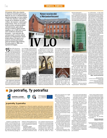 Gliwice, Zabrze 4 29 kwietnia 1816 roku otwarto w Gliwicach katolickie gimnazjum. Mieściło się ono w zabudowaniach sekularyzowanego na mocy edyktu z 1810 roku klasztoru reformatów. Uczyła się tu młodzież nie tylko z Gliwic, ale również z okolicznych miejscowości. Wraz ze wzrostem liczby uczniów narastał problem zakwaterowania, gdyż jakość stancji w mieście często bywała wątpliwa. Już w 1830 roku rozważano możliwość zbudowania konwiktu – czyli internatu dla zamiejscowych uczniów. Jednak dopiero po kilkudziesięciu latach ksiądz Johann Chrząszcz przy poparciu dyrekcji gimnazjum stworzył fundusz jego budowy. Pierwszy datek w 1888 roku wyniósł 20 fenigów. 15 lipca 1893 roku powstało przy Gimnazjum Towarzystwo Budowy Konwiktu dla dojeżdżających oraz niezamożnych uczniów. Na budowę przeznaczono teren obok placu sportowego gimnaz jum (w narożniku dzisiejszych ulic Kozielskiej i Styczyńskiego), który odkupiono od gminy katolickiej i 19 marca 1901 roku położono tam kamień węgielny. Nowe wycieczki z Metamorfozami egzamin dojrzałości.... Sale miały elektryczne oświetlenie, w sypialniach umieszczono umywalki, ogrzewanie było gazowe, ale w pokojach znajdowały się również piece kaflowe, z których jeden zachował się do dziś. IV LO lani Phillipp i Zimmermann. Jest to trzykondygnacyjny budynek oparty na rzucie litery „L”, wzniesiony z surowej cegły z użyciem ciemniejszej cegły glazurowanej dla podkreślenia charakterystycznych elementów. Symetrię elewacji podkreślono ryzalitami. Główne wejście zostało ulokowane w ryzalicie od strony ulicy Kozielskiej (d. Coselerstrasse) i zaakcentowane schodkowym szczytem ze sterczynami. Całość nakryto stromym czterospadowym dachem krytym dachówką, z doświetlającymi lukarnami. Również wnętrza zostały zaprojektowane w stylu neogotyckim. Zwraca uwagę reprezentacyjny hol oraz sklepienia korytarzy. Na parterze konwiktu znajdowały się jadalnia i sala muzyczna, na piętrach mieściły się sypialnie i sale wykładowe, natomiast w podpiwniczeniu znalazły miejsce kuchnia, piekarnia, pralnia z suszarnią, magazyny, kotłownia i mieszkanie dozorcy. Jak większość gliwickich szkół, obiekt został zbudowany w stylu neogotyckim. Projekt wykonali mistrzowie budow- W skrzydłach ulokowano mieszkania prefektów i sióstr boromeuszek, które prowadziły gospodarstwo. Na drugim piętrze w prawym skrzydle znajdowała się dziewięciometrowej wysokoś ci kaplica przekryta drewnianym ostrołukowym sklepieniem wspartym na zastrzałach, zbudowanym przez mistrza budowlanego Jellina. Na ścianach kaplicy znajdowały się freski, a w oknach umieszczono witraże. Wyposażono ją również w organy. Obecnie kaplica pełni funkcję auli. Do czasu wybudowania sali gimnastycznej w latach 70. odbywały się tu zajęcia wychowania fizycznego. Wielu gliwiczan pisało w tej sali Koszt budowy obiektu, wraz z jego wyposażeniem wyniósł 150 tysięcy marek. Internat mógł pomieścić 150 uczniów, jednak nie był w pełni wykorzystany. Uczniowie płacili za pobyt 400 marek rocznie, przy czym biedniejsi korzystali z ulg. Uroczyste poświęcenie konwiktu św. Józefa miało miejsce 16 kwietnia 1903 roku. Jego oficjalna nazwa brzmiała „Fürstbischof lisches Knaben-Konvikt“ czyli „Arcybiskupi Konwikt dla Chłopców“. W czasie I wojny światowej internat służył jako lazaret dla rannych żołnierzy. Później jego gospodarze zmieniali się jak w kalejdoskopie, ale nieodmiennie służył gliwickiemu szkolnictwu. Budynek, w którym mieściło się gimnazjum – dawny klasz- kiem, lecz popycha nas ciągle do nowych działań. To działanie, które wykonujemy z silną wewnętrzną motywacją. Sama pasja może być także motywacją do działania. Jeżeli mamy pasje w życiu to mamy cel do realizowania, który wręcz zmusza nas do ciągłego rozwoju, nie pozwala nam stać w miejscu. Nie jest najważniejsze co jest przedmiotem naszej pasji, najważniejsze wydaje się tu nasze zaangażowanie i zyski, które nam ona daje, bo daje nam wiele. Rozwija nas wszechstronnie dając spojrzenie z wielu stron, gdyż jak poszukujemy to widzimy, zauważamy więcej. A to uczy tolerancji, szacunku do innych opinii i przekonań. Pozwala nam poznać samego siebie lepiej. Mierzymy się z własnymi ograniczeniami, ale też poznajemy własne zasoby. Podwyższa poczucie własnej wartości. Możemy czuć się w czymś naprawdę dobrzy i wartościowi, wiele wiemy i potrafimy, choćby w małym wycinku rzeczywistości. Pozwala nam łatwiej znosić stresy i napięcia dnia codziennego, bo mamy swój świat, gdzie czujemy się bezpieczni i spełnieni. Nierzadko ułatwia nam kontakty społeczne, pozwala poznawać nowych ludzi, zaistnieć w środowisku dzięki wiedzy czy umiejętnościom. Polepsza sa mopoczuc ie na co dzień, gdy czujemy zapał, energię i moc w sobie. Podwyższa nasze umiejętności, rozwija intelektualnie. ,,Zyski” każdego człowieka z posiadania pasji są niezaprzeczalne, trudno je przecenić zarówno w aspekcie intelektualnym jak i emocjonalnym. Pamiętajmy, że najlepiej uczyć przykładem, przekażmy dziecku zaangażowanie w swoją pasję, w swój przedmiot. Ciekawość jest zaraźliwa! tor reformatów – w 1921 roku został przez miasto przekazany Ojcom Redemptorystom. Rozpoczęto budowę nowego gmachu gimnazjum wraz z przylegającym do niego nowym budynkiem konwiktu. Zabudowania te istnieją do dziś w rejonie ulic Łużyckiej, Bolesława Krzywoustego i Akademickiej. Budynek gimnazjum to dzisiejszy gmach Wydziału Elektrycznego Politechniki Śląskiej, nowy gmach konwiktu to obecna siedziba Kurii, zaś kaplica to obecny kościół p.w. Św. Michała, którego plebania to dawny dom mieszkalny dla nauczycieli gimnazjum. W odkupionym przez miasto budynku starego konwiktu Św. Józefa (ostatecznie opuszczonym w 1927 roku) umieszczono przejściowo (1928-1930) Liceum Miejskie („Eichendorff-Schule. Städtisches Lyzeum und