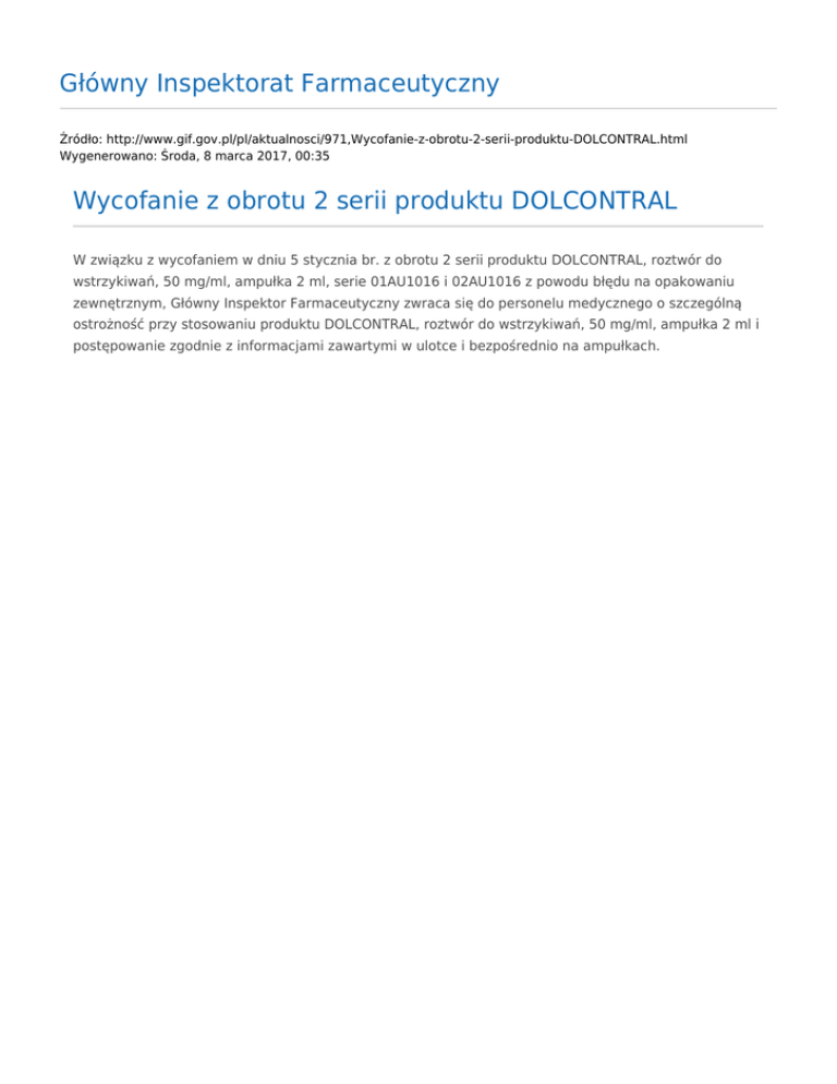 Główny Inspektorat Farmaceutyczny Źródło: http://www.gif.gov.pl/pl/aktualnosci/971,Wycofanie-z-obrotu-2-serii-produktu-DOLCONTRAL.html Wygenerowano: Środa, 8 marca 2017, 00:35 Wycofanie z obrotu 2 serii produktu DOLCONTRAL W związku z wycofaniem w dniu 5 stycznia br. z obrotu 2 serii produktu DOLCONTRAL, roztwór do wstrzykiwań, 50 mg/ml, ampułka 2 ml, serie 01AU1016 i 02AU1016 z powodu błędu na opakowaniu zewnętrznym, Główny Inspektor Farmaceutyczny zwraca się do personelu medycznego o szczególną ostrożność przy stosowaniu produktu DOLCONTRAL, roztwór do wstrzykiwań, 50 mg/ml, ampułka 2 ml i postępowanie zgodnie z informacjami zawartymi w ulotce i bezpośrednio na ampułkach.