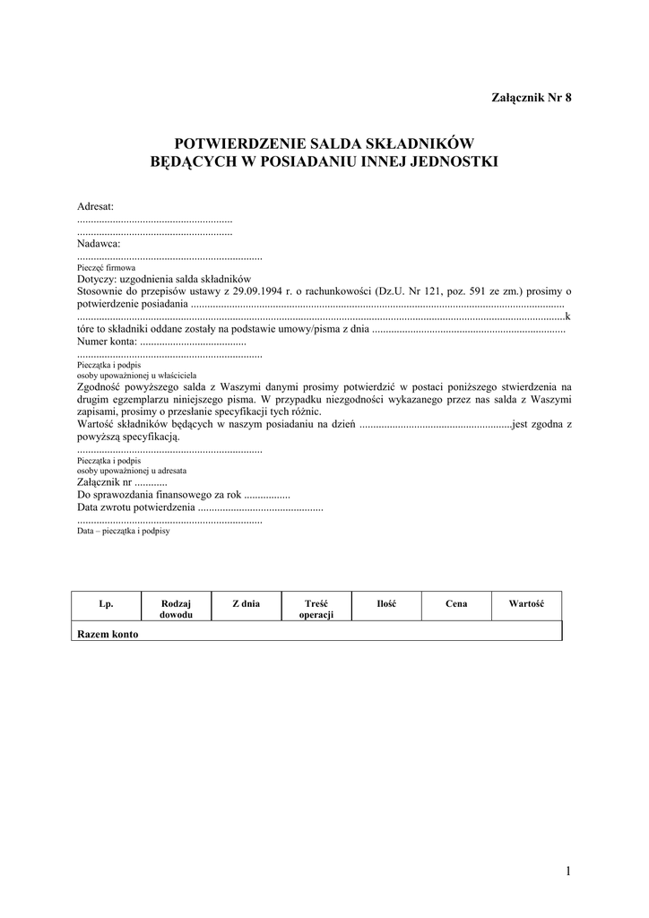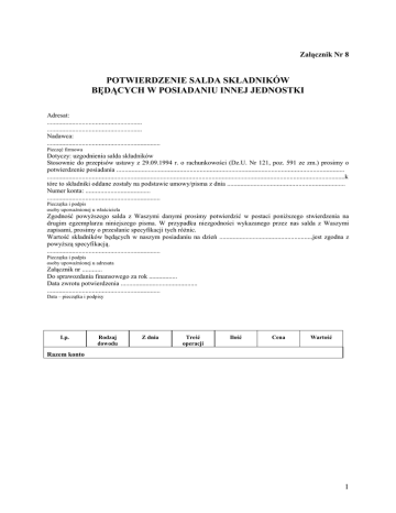 Załącznik Nr 8 POTWIERDZENIE SALDA SKŁADNIKÓW BĘDĄCYCH W POSIADANIU INNEJ JEDNOSTKI Adresat: ......................................................... ......................................................... Nadawca: .................................................................... Pieczęć firmowa Dotyczy: uzgodnienia salda składników Stosownie do przepisów ustawy z 29.09.1994 r. o rachunkowości (Dz.U. Nr 121, poz. 591 ze zm.) prosimy o potwierdzenie posiadania ......................................................................................................................................... ...................................................................................................................................................................................k tóre to składniki oddane zostały na podstawie umowy/pisma z dnia ....................................................................... Numer konta: ....................................... .................................................................... Pieczątka i podpis osoby upoważnionej u właściciela Zgodność powyższego salda z Waszymi danymi prosimy potwierdzić w postaci poniższego stwierdzenia na drugim egzemplarzu niniejszego pisma. W przypadku niezgodności wykazanego przez nas salda z Waszymi zapisami, prosimy o przesłanie specyfikacji tych różnic. Wartość składników będących w naszym posiadaniu na dzień ........................................................jest zgodna z powyższą specyfikacją. .................................................................... Pieczątka i podpis osoby upoważnionej u adresata Załącznik nr ............ Do sprawozdania finansowego za rok ................. Data zwrotu potwierdzenia .............................................. .................................................................... Data – pieczątka i podpisy Lp. Rodzaj dowodu Z dnia Treść operacji Ilość Cena Wartość Razem konto 1