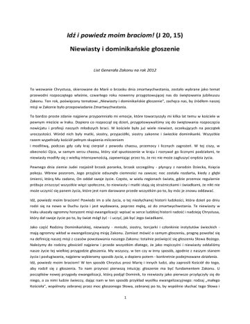 Idź i powiedz moim braciom! (J 20, 15) Niewiasty i dominikańskie głoszenie List Generała Zakonu na rok 2012 To wezwanie Chrystusa, skierowane do Marii o brzasku dnia zmartwychwstania, zostało wybrane jako temat przewodni rozpoczętego właśnie, czwartego roku nowenny przygotowującej nas do świętowania jubileuszu Zakonu. Ten rok, poświęcony tematowi „Niewiasty i dominikańskie głoszenie", zachęca nas, by źródłem naszej misji w Zakonie było przepowiadanie Zmartwychwstania. To bardzo proste zdanie najpierw przypomniało mi emocje, które towarzyszyły mi kilka lat temu w kościele w pewnym mieście w Iraku. Dopiero co rozpoczął się dzień, przygotowywaliśmy się do świętowania rozpoczęcia nowicjatu i profesji naszych młodszych braci. W kościele było już wiele niewiast, oczekujących na początek uroczystości. Wśród nich były matki, siostry, przyjaciółki, siostry zakonne i świeckie dominikanki. Wszystkie razem wypełniały kościół pełnym skupienia milczeniem i modlitwą, podczas gdy cały kraj cierpiał z powodu chaosu, przemocy i licznych zagrożeń. W tej ciszy, w obecności Ojca, w samym sercu chaosu, który siał spustoszenie w kraju i rozrywał go licznymi podziałami, te niewiasty modliły się z wielką intensywnością, zapewniając przez to, że nic nie może zagłuszyć orędzia życia. Pewnego dnia ziemie Judei rozjaśnił brzask poranka, brzask szczególny - płynący z narodzin Dziecka, Księcia pokoju. Wbrew pozorom, Jego przyjście odsunęło ciemności na zawsze; noc została rozdarta, kiedy z głębi śmierci, którą Mu zadano, On oddał swoje życie. Często, w wielu regionach świata, gdzie przemoc regularnie próbuje zniszczyć wszystkie więzi społeczne, to niewiasty i matki stają się strażniczkami i świadkami, że nikt nie może uczynić się panem życia, które jest nam darowane przede wszystkim po to, by móc je znowu oddawać. Idź, powiedz moim braciom! Powiedz im o sile życia, o tej niesłychanej historii ludzkości, która dzień po dniu rodzi się na nowo w Duchu życia i jest wydawana, poprzez mękę, aż do zmartwychwstania. Te niewiasty w Iraku ukazały ogromny horyzont misji ewangelizacji: wpisać w serce ludzkiej historii radość i nadzieję Chrystusa, który dał swoje życie po to, by świat mógł żyć - i uczyć, jak być Jego świadkami. Jako część Rodziny Dominikańskiej, niewiasty - mniszki, siostry, tercjarki i członkinie instytutów świeckich mają ogromny wkład w ewangelizacyjną misję Zakonu. Zamiast mówić o samym głoszeniu, pragnę powołać się na definicję naszej misji z czasów powstawania naszego Zakonu: totalnie poświęcić się głoszeniu Słowa Bożego. Należymy do rodziny głosicieli najpierw i przede wszystkim dlatego, że jako mężczyźni i niewiasty oddaliśmy nasze życie tej wielkiej przygodzie głoszenia. My wszyscy, w ten czy w inny sposób, zgodnie z naszym stanem życia i posługiwania, najpierw wybieramy sposób życia, a dopiero potem - konkretnie podejmowane działania. Idź, powiedz moim braciom! W ten sposób Chrystus prosi Marię i innych ludzi, aby zaprosili Kościół do tego, aby rodził się z głoszenia. To nam przynosi pierwszą intuicję: głoszenie ma być fundamentem Zakonu. U początków nowej przygody ewangelizacji, którą podjął Dominik, to niewiasty jako pierwsze przyłączyły się do niego, a za nimi ludzie świeccy, dając nam w ten sposób przykład wysiłku ewangelizacyjnego: rodzaj „małego Kościoła", wspólnoty zebranej przez moc głoszonego Słowa, zebranej po to, by wspólnie słuchać tego Słowa i 1 by nieść je światu. Tak jak to było z Jezusem, według opisu św. Łukasza (Łk 8, 1-4), ta gromadząca się wspólnota ma intuicję, by stać się „wspólnotą dla ewangelizacji". Od samego początku, jakkolwiek dziwne może się to wydawać zwłaszcza w tamtych czasach, niewiasty stanowiły część wspólnoty zgromadzonej wokół Jezusa. Gdy chodzi o bycie uczniem, nie ma miejsca na światowe kategorie. Wyobraźmy sobie tę wspólnotę, która formowała się idąc za Jezusem na tej pierwszej drodze ewangelizacji. Szli pomimo słabości, upadków, grzechów i kruchości, które mogły być uzdrowione jedynie przez Jezusa. Święte głoszenie zostało rozpoczęte przez Niego z powodu Jego miłosierdzia, odczuwanego na tak wiele różnych sposobów. Widząc, jak On żył i nauczał, uczniowie prawdopodobnie mieli wiele okazji, by dzielić się doświadczeniem ich osobistych spotkań z Jezusem. A ewangeliczne niewiasty miały okazję dawać świadectwo Słowu, które On do nich kierował: Słowu obwieszczającemu zmartwychwstanie, rozpoznającemu wiarę i dającemu obietnicę zbawienia, Słowu życia i przebaczenia, Słowu uzdrowienia i zaufania. Jezus mówił do nich w sposób serdeczny, biorąc pod uwagę ich niewieścią naturę i umiejętność dawania życia. Pamiętał o ich zdolności troszczenia się i chronienia kruchego życia, o sile ich zaufania w kreatywność i wytrzymałości wobec życiowych trudności. Niewiasty szły z Nim przez całą drogę aż na Kalwarię; czuwały w ogrodzie nieopodal Jego grobu, a potem znowu wyruszyły na drogi i bezdroża, by donieść Apostołom o tym, że On zmartwychwstał. Misja ewangelizacji potrzebuje tego świadectwa, aby pomóc światu usłyszeć Słowo, które niesie w sobie życie. Od samego powstania, kiedy pierwsze niewiasty przyłączyły się do Dominika, dając początek świętemu głoszeniu w Prouilhe, nasza własna wspólnota dla ewangelizacji, Rodzina Dominikańska, musi być złożona z mężczyzn i niewiast, zakonników i świeckich, tak aby była obrazem tej pierwszej wspólnoty, która podążała za Jezusem, ucząc się od Niego, jak kochać i jak mówić do świata, jak szukać we wszystkim Ojca, wszystko otrzymując od Niego. My wszyscy, z naszą różnorodnością i komplementarnością, z wzajemnym szacunkiem dla różnic i dla wspólnej nam woli dzielenia s