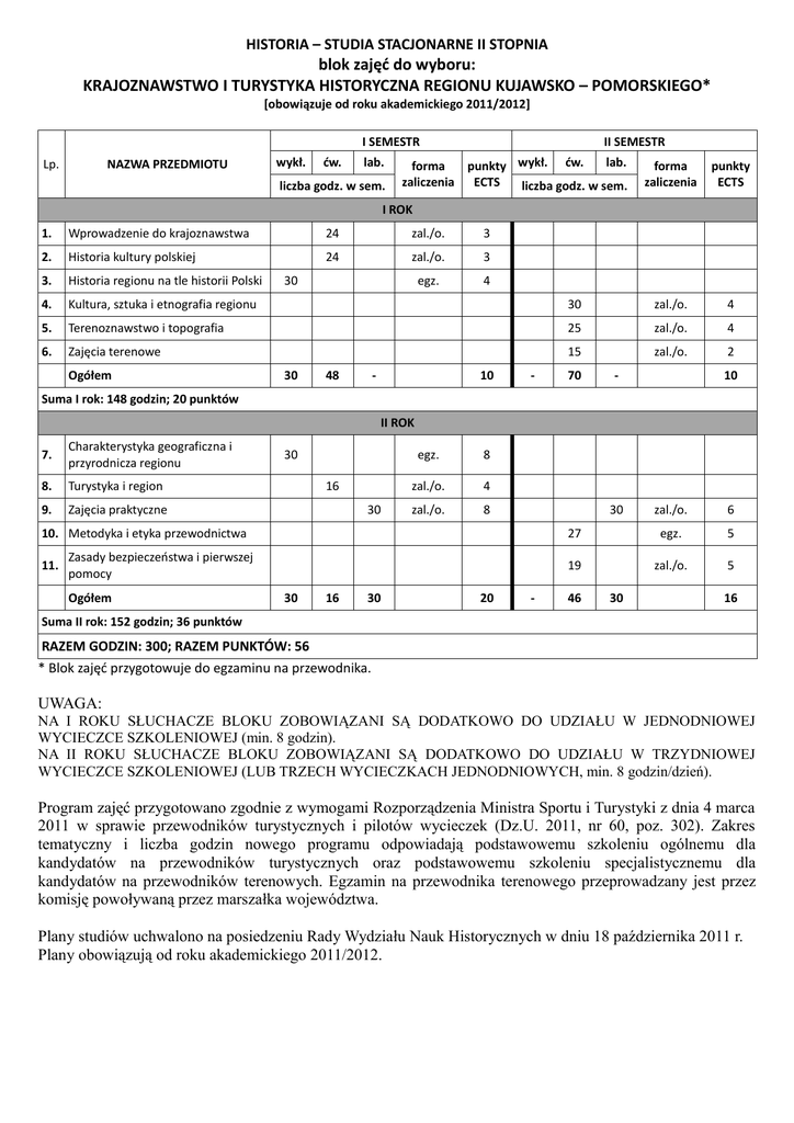 HISTORIA – STUDIA STACJONARNE II STOPNIA blok zajęć do wyboru: KRAJOZNAWSTWO I TURYSTYKA HISTORYCZNA REGIONU KUJAWSKO – POMORSKIEGO* [obowiązuje od roku akademickiego 2011/2012] I SEMESTR Lp. NAZWA PRZEDMIOTU wykł. ćw. lab. liczba godz. w sem. II SEMESTR lab. forma punkty wykł. ćw. zaliczenia ECTS liczba godz. w sem. forma zaliczenia punkty ECTS I ROK 1. Wprowadzenie do krajoznawstwa 24 zal./o. 3 2. Historia kultury polskiej 24 zal./o. 3 3. Historia regionu na tle historii Polski egz. 4 4. Kultura, sztuka i etnografia regionu 30 zal./o. 4 5. Terenoznawstwo i topografia 25 zal./o. 4 6. Zajęcia terenowe 15 zal./o. 2 Ogółem 30 30 48 - 10 - 70 - 10 Suma I rok: 148 godzin; 20 punktów II ROK 7. Charakterystyka geograficzna i przyrodnicza regionu 8. Turystyka i region 9. Zajęcia praktyczne 30 16 30 egz. 8 zal./o. 4 zal./o. 8 30 10. Metodyka i etyka przewodnictwa 11. Zasady bezpieczeństwa i pierwszej pomocy Ogółem 30 16 30 20 - zal./o. 6 27 egz. 5 19 zal./o. 5 46 30 16 Suma II rok: 152 godzin; 36 punktów RAZEM GODZIN: 300; RAZEM PUNKTÓW: 56 * Blok zajęć przygotowuje do egzaminu na przewodnika. UWAGA: NA I ROKU SŁUCHACZE BLOKU ZOBOWIĄZANI SĄ DODATKOWO DO UDZIAŁU W JEDNODNIOWEJ WYCIECZCE SZKOLENIOWEJ (min. 8 godzin). NA II ROKU SŁUCHACZE BLOKU ZOBOWIĄZANI SĄ DODATKOWO DO UDZIAŁU W TRZYDNIOWEJ WYCIECZCE SZKOLENIOWEJ (LUB TRZECH WYCIECZKACH JEDNODNIOWYCH, min. 8 godzin/dzień). Program zajęć przygotowano zgodnie z wymogami Rozporządzenia Ministra Sportu i Turystyki z dnia 4 marca 2011 w sprawie przewodników turystycznych i pilotów wycieczek (Dz.U. 2011, nr 60, poz. 302). Zakres tematyczny i liczba godzin nowego programu odpowiadają podstawowemu szkoleniu ogólnemu dla kandydatów na przewodników turystycznych oraz podstawowemu szkoleniu specjalistycznemu dla kandydatów na przewodników terenowych. Egzamin na przewodnika terenowego przeprowadzany jest przez komisję powoływaną przez marszałka województwa. Plany studiów uchwalono na posiedzeniu Rady Wydziału Nauk Historycznych w dniu 18 października 2011 r. Plany obowiązują od roku akademickiego 2011/2012.