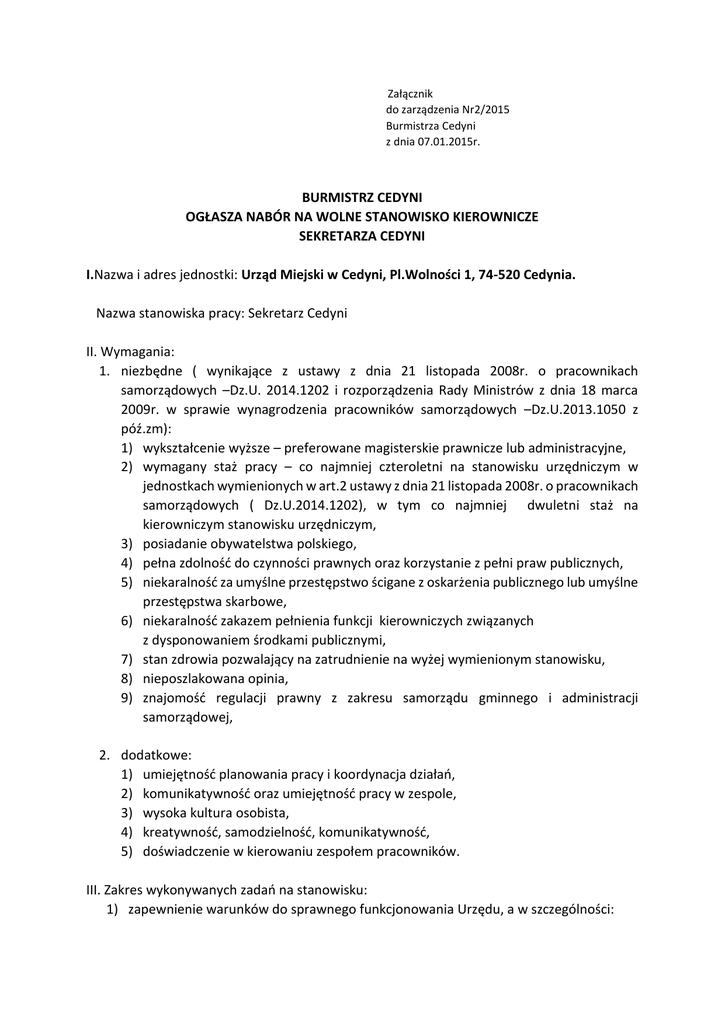 Załącznik do zarządzenia Nr2/2015 Burmistrza Cedyni z dnia 07.01.2015r. BURMISTRZ CEDYNI OGŁASZA NABÓR NA WOLNE STANOWISKO KIEROWNICZE SEKRETARZA CEDYNI I.Nazwa i adres jednostki: Urząd Miejski w Cedyni, Pl.Wolności 1, 74-520 Cedynia. Nazwa stanowiska pracy: Sekretarz Cedyni II. Wymagania: 1. niezbędne ( wynikające z ustawy z dnia 21 listopada 2008r. o pracownikach samorządowych –Dz.U. 2014.1202 i rozporządzenia Rady Ministrów z dnia 18 marca 2009r. w sprawie wynagrodzenia pracowników samorządowych –Dz.U.2013.1050 z póź.zm): 1) wykształcenie wyższe – preferowane magisterskie prawnicze lub administracyjne, 2) wymagany staż pracy – co najmniej czteroletni na stanowisku urzędniczym w jednostkach wymienionych w art.2 ustawy z dnia 21 listopada 2008r. o pracownikach samorządowych ( Dz.U.2014.1202), w tym co najmniej dwuletni staż na kierowniczym stanowisku urzędniczym, 3) posiadanie obywatelstwa polskiego, 4) pełna zdolność do czynności prawnych oraz korzystanie z pełni praw publicznych, 5) niekaralność za umyślne przestępstwo ścigane z oskarżenia publicznego lub umyślne przestępstwa skarbowe, 6) niekaralność zakazem pełnienia funkcji kierowniczych związanych z dysponowaniem środkami publicznymi, 7) stan zdrowia pozwalający na zatrudnienie na wyżej wymienionym stanowisku, 8) nieposzlakowana opinia, 9) znajomość regulacji prawny z zakresu samorządu gminnego i administracji samorządowej, 2. dodatkowe: 1) umiejętność planowania pracy i koordynacja działań, 2) komunikatywność oraz umiejętność pracy w zespole, 3) wysoka kultura osobista, 4) kreatywność, samodzielność, komunikatywność, 5) doświadczenie w kierowaniu zespołem pracowników. III. Zakres wykonywanych zadań na stanowisku: 1) zapewnienie warunków do sprawnego funkcjonowania Urzędu, a w szczególności: a) organizacja pracy Urzędu i koordynowanie działań podejmowanych przez poszczególne komórki organizacyjne, b) opracowywanie projektów regulaminów i instrukcji obowiązujących w Urzędzie i ich aktualizacja, c) nadzór nad terminowym i należytym załatwianiem skarg i wniosków kierowanych do Burmistrza i Urzędu, d) nadzór nad przestrzeganiem porządku i dyscypliny pracy pracowników, e) nadzór nad prawidłowym postępowaniem z dokumentacją, zgodnie z instrukcją kancelaryjną i stosowanym w Urzędzie jednolitym, rzeczowym wykazem akt, f) nadzór nad rzetelnym, terminowym i zgodnym z prawem załatwianiem spraw, g) nadzór nad przygotowywaniem projektów uchwał , h) inicjowanie oraz tworzenie warunków do podnoszenia kwalifikacji pracowników, i) wykonywanie zadań Urzędnika Wyborczego, j) koordynacja i organizacja praz związanych ze spisami statystycznymi, k) nadzór nad zawartością merytoryczną strony internetowej oraz BIP-u, l) wykonywanie innych zadań na polecenie lub z upoważnienia Burmistrza. IV. Informacja o warunkach pracy na stanowisku: Praca w pełnym wymiarze czasu pracy, w siedzibie Urzędu (możliwe prowadzenie czynności kontrolnych poza Urzędem), związana z obsługa komputera powyżej 4 godzin dziennie. W budynku jednostki są bezpieczne warunki pracy z występowaniem barier architektonicznych. V. Wskaźnik zatrudnienia osób niepełnosprawnych w grudniu 2014r. – 0%. VI. Wymagane dokumenty: 1) list motywacyjny, 2) CV z dokładnym opisem przebiegu pracy zawodowej, 3) kwestionariusz osobowy, 4) kopie dokumentów potwierdzających staż pracy , 5) aktualne zaświadczenie o stanie zdrowia, 6) kopie dokumentów potwierdzających kwalifikacje i wykształcenie zawodowe, 7) oświadczenie kandydata o niekaralności za przestępstwo popełnione umyślnie z oskarżenia publicznego lub umyślne przestępstwo skarbowe, 8) oświadczenie kandydata o posiadaniu pełnej zdolności do czynności prawnych oraz o korzystaniu z pełni praw publicznych, 9) oświadczenie, że kandydat nie był karany zakazem pełnienia funkcji kierowniczych związanych z dysponowaniem środkami publicznymi, o których mowa w art.31 ust.1 pkt.4 ustawy z dnia 17 grudnia 2004r. o odpowiedzialności za naruszenie dyscypliny finansów publicznych, 10) kopia dowodu osobistego lub innego dokumentu, potwierdzającego tożsamość oraz poświadczającego obywatelstwo kandydata. Dokumenty aplikacyjne: list motywacyjny, CV powinny być opatrzone klauzulą: „Wyrażam zgodę na przetwarzanie moich danych osobowych dla potrzeb niezbędnych do realizacji procesu rekrutacji zgodnie z ustawą z dnia 29 sierpnia 1997r. o ochronie danych osobowych ( Dz.U.2014.1182 z póź.zm.) oraz ustawą z dnia 21 listopada 2008r. o pracownikach samorządowych (Dz.U.2014.1202). Wymagane dokumenty aplikacyjne należy składać lub przesłać w terminie do dnia 19 stycznia 2015r. do godz.16.00 na adres: Urząd Miejski w Cedyni, Pl.Wolności 1, 74-520 Cedynia, w zamkniętej kopercie, z adresem kandydata i z dopiskiem: „Nabór na stanowisko Sekretarza Cedyni. Aplikacje, które wpłyną do Urzędu po wyżej określonym terminie nie będą rozpatrywane. Otwarcie ofert nastąpi w Urzędzie Miejskim w Cedyni w dniu 20 stycznia 2014r. o godz. 14.00., w sali posiedzeń. Z Regulaminem naboru można zapoznać się w Urzędzie Miejskim w Cedyni Pl.Wolności 1,pokój nr 1 oraz na stronie internetowej BIP ( www.bip.cedynia.pl). Dodatkowe informacje można uzyskać pod numerem telefonu: 91 4 317 819. Lista kandydatów spełniających wymogi formalne i dopuszczonych do II etapu wraz z terminem rozmowy kwalifikacyjnej zostanie ogłoszona w BIP-ie. Informacja o wynikach naboru będzie umieszczona na stronie internetowej Biuletynu Informacji Publicznej ( www.bip.cedynia.pl) oraz na tablicy informacyjnej Urzędu Miejskiego w Cedyni przy ul.Pl.Wolności 1, 74-520 Cedynia.