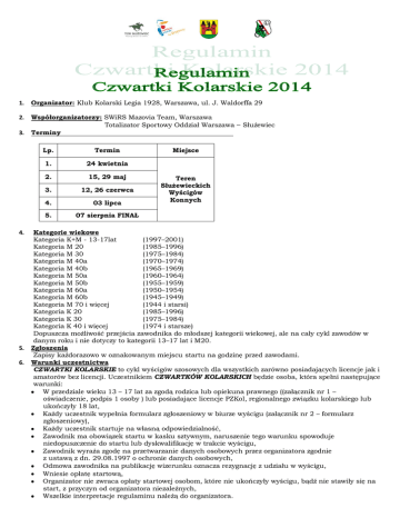 1. Organizator: Klub Kolarski Legia 1928, Warszawa, ul. J. Waldorffa 29 2. Współorganizatorzy: SWiRS Mazovia Team, Warszawa Totalizator Sportowy Oddział Warszawa – Służewiec Terminy 3. 4. 5. 6. Lp. Termin 1. 24 kwietnia 2. 15, 29 maj 3. 12, 26 czerwca 4. 03 lipca 5. 07 sierpnia FINAŁ Miejsce Teren Służewieckich Wyścigów Konnych Kategorie wiekowe Kategoria K+M - 13-17lat (1997–2001) Kategoria M 20 (1985–1996) Kategoria M 30 (1975–1984) Kategoria M 40a (1970–1974) Kategoria M 40b (1965–1969) Kategoria M 50a (1960–1964) Kategoria M 50b (1955–1959) Kategoria M 60a (1950–1954) Kategoria M 60b (1945–1949) Kategoria M 70 i więcej (1944 i starsi) Kategoria K 20 (1985–1996) Kategoria K 30 (1975–1984) Kategoria K 40 i więcej (1974 i starsze) Dopuszcza możliwość przejścia zawodnika do młodszej kategorii wiekowej, ale na cały cykl zawodów w danym roku i nie dotyczy to kategorii 13–17 lat i M20. Zgłoszenia Zapisy każdorazowo w oznakowanym miejscu startu na godzinę przed zawodami. Warunki uczestnictwa CZWARTKI KOLARSKIE to cykl wyścigów szosowych dla wszystkich zarówno posiadających licencje jak i amatorów bez licencji. Uczestnikiem CZWARTKÓW KOLARSKICH będzie osoba, która spełni następujące warunki: W przedziale wieku 13 – 17 lat za zgodą rodzica lub opiekuna prawnego ((załącznik nr 1 – oświadczenie, podpis 1 osoby ) lub posiadające licencje PZKol, regionalnego związku kolarskiego lub ukończyły 18 lat, Każdy uczestnik wypełnia formularz zgłoszeniowy w biurze wyścigu (załącznik nr 2 – formularz zgłoszeniowy), Każdy uczestnik startuje na własną odpowiedzialność, Zawodnik ma obowiązek startu w kasku sztywnym, naruszenie tego warunku spowoduje niedopuszczenie do startu lub dyskwalifikację w trakcie wyścigu, Zawodnik wyraża zgodę na przetwarzanie danych osobowych przez organizatora zgodnie z ustawą z dn. 29.08.1997 o ochronie danych osobowych, Odmowa zawodnika na publikację wizerunku oznacza rezygnację z udziału w wyścigu, Wniesie opłatę startową, Organizator nie zwraca opłaty startowej osobom, które nie ukończyły wyścigu, bądź nie stawiły się na start, z przyczyn od organizatora niezależnych, Wszelkie interpretacje regulaminu należą do organizatora. 7. Sposób przeprowadzenia wyścigów: Podział na grupy startowe 1. MTB 2. (M60 – K open – M70 i więcej – kategoria 13–17 lat) 3. (M20–M30) 4. (M40–M50) Początek zawodów o godz. 17.30 dla 1 grupy startowej. Grupa 2 startuje o 18.00 Grupa 3,4 startuje o 18.40 i odpowiednio do ilości startujących zawodników z tych grup będzie stosowany handicap czasowy. Wyścigi każdorazowo odbędą się przy ruchu zamkniętym na pętli ok. 2500 m. Zawody będą rozgrywane jako kryterium, co drugie okrążenie punktowane. Zasady zostaną podane na pierwszych zawodach 24.04.2014. UWAGA! Godziny startów mogą ulec zmianie w zależności od ilości startujących 8. 9. Zasady finansowania Organizator i sponsorzy pokrywają koszty organizacji wyścigów i koszty nagród. Opłaty startowe Opłata startowa w kategorii masters wynosi 30 zł. W kategorii wiekowej 13–17 lat opłata startowa wynosi 10 zł Organizator wprowadza możliwość wykupienia karnetu na start we wszystkich wyścigach, którego koszt łączny startowego wynosił będzie 50%. 10. Nagrody Na każdej edycji CZWARTKÓW KOLARSKICH w każdej grupie startowej za m-ca 1-3 zostaną wręczone trofea sportowe i dyplomy, w każdej kategorii wiekowej za 1-sze miejsce trofeum sportowe + dyplom. W klasyfikacji końcowej generalnej: w każdej kategorii za m-ca 1 – 3 dyplomy, trofea sportowe, za m-ce 1-sze nagroda rzeczowa. 11. Klasyfikacja końcowa generalna Na każdej edycji wyścigu dla każdej kategorii miejsca końcowe od I do VIII będą następująco punktowane: 9, 7, 6, 5, 4, 3, 2, 1. Suma punktów wyłoni klasyfikację generalną, przy równej ilości punktów decyduje miejsce zajęte w wyścigu finałowym, Klasyfikowani będą zawodniczki i zawodnicy którzy wezmą udział w minimum 5 wyścigach, w danej kategorii do klasyfikacji końcowej musi być co najmniej 6 uczestników. 12. Postanowienia końcowe Podczas wyścigu obowiązują przepisy PZKOL, Organizator nie ubezpiecza zawodników, Organizatorzy nie ponoszą odpowiedzialności za wypadki spowodowane przez uczestników, ani za zaginiony bądź uszkodzony sprzęt, Organizator nie ponosi odpowiedzialności za wypadki losowe podczas dojazdu i powrotu uczestników na zawody i powrotu z nich, Wyścig odbędzie się bez względu na warunki atmosferyczne, Organizator nie ponosi odpowiedzialności za rzeczy zaginione w trakcie trwania wyścigu, Wszyscy zawodnicy proszeni są o nie zaśmiecanie trasy wyścigu i troskę o środowisko naturalne, Zawodnik ma obowiązek przyczepić numery startowe zgodnie z zaleceniem sędziów i organizatora, Uczestnik wyścigu podpisując kartę zgłoszeniową i uiszczając opłatę startową akceptuje warunki niniejszego regulaminu, Organizator wraz z sędzią głównym zastrzega sobie prawo do interpretacji Regulaminu i do jego zmian. ZAWODY DOFINANSOWANE PRZEZ DZIELNICĘ WARSZAWA – URSYNÓW M.ST. WARSZAWY