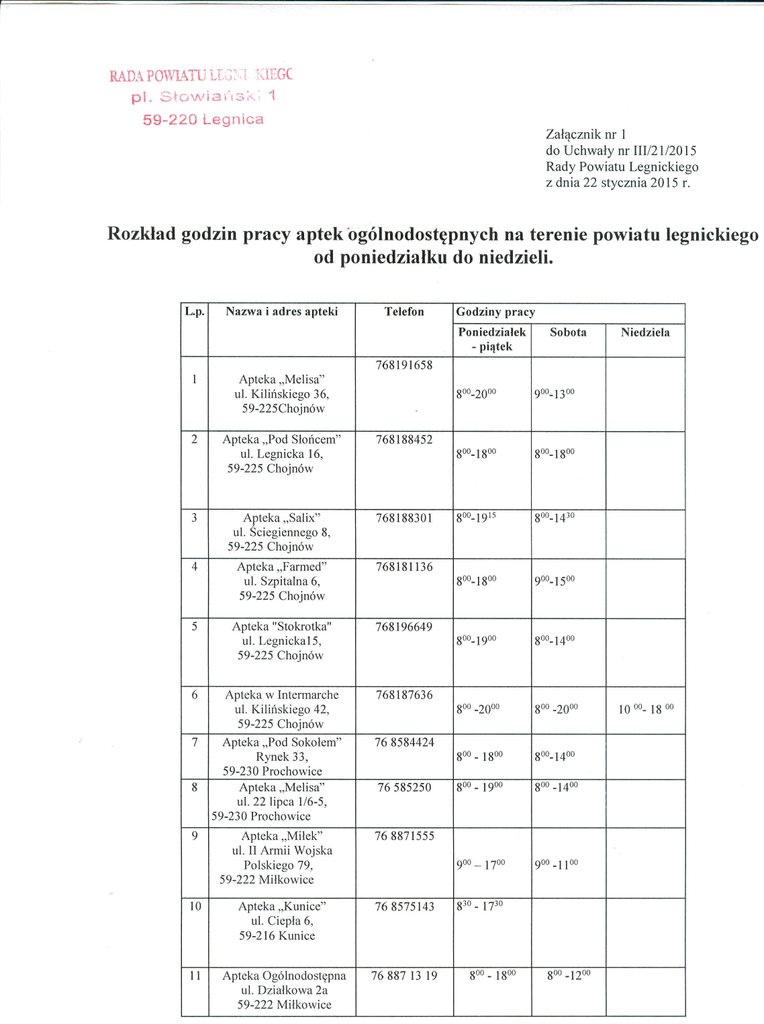 RADA POWIATIJ LE::;: -[ \lEGC pl. SIo\lvi a (13 ;,,_, 1 59-220 Legnica Załącznik nr 1 do Uchwały nr III/21/2015 Rady Powiatu Legnickiego z dnia 22 stycznia 2015 r. Rozkład godzin pracy aptek ogólnodostępnych na terenie powiatu legnickiego od poniedziałku do niedzieli. L.p. Nazwa i adres apteki Telefon Godziny pracy Poniedziałek - piątek Sobota Niedziela 768191658 I 2 Apteka "Melisa" ul. Ki1ińskiego 36, 59-225Chojnów Apteka "Pod Słońcem" ul. Legnicka l6, 59-225 Chojnów 768188452 3 Apteka "Salix" ul. Sciegiennego 8, 59-225 Chojnów 768188301 4 Apteka "Farmed" ul. Szpitalna 6, 59-225 Chojnów 768181136 Apteka "Stokrotka" ul. Legnickal5, 59-225 Chojnów 768196649 Apteka w Intermarche ul. Kilińskiego 42, 59-225 Chojnów 768187636 5 6 7 8 9 Apteka "Pod Sokołem" Rynek 33, 59-230 Prochowice Apteka "Melisa" ul. 22 lipca 1/6-5, 59-230 Prochowice 768584424 Apteka "Miłek" ul. II Armii Wojska Polskiego 79, 59-222 Miłkowice 768871555 10 Apteka "Kunice" ul. Ciepła 6, 59-216 Kunice II Apteka Ogólnodostępna ul. Działkowa 2a 59-222 Miłkowice 76585250 768575143 7688713 19 800_2000 900_1300 800_1800 800_1800 800_1915 800_1430 800_1800 900_1500 800_1900 800_1400 800 _2000 800 _2000 800 _ 1800 800_1400 800 _ 1900 800 _1400 900 _ 1700 900 _1100 830 _ 800 1730 _ 1800 800_1200 1000_1800