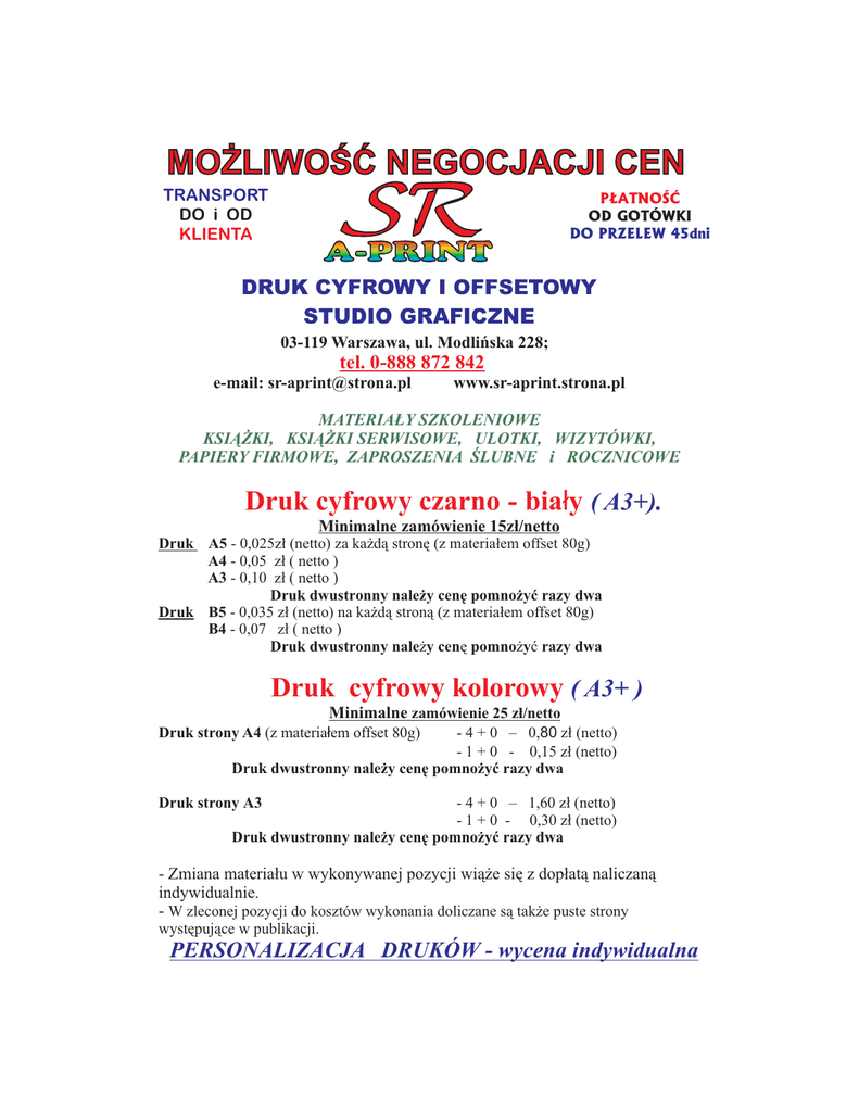 MOŻLIWOŚĆ NEGOCJACJI CEN TRANSPORT DO i OD KLIENTA A-PRINT PŁATNOŚĆ OD GOTÓWKI DO PRZELEW 45dni DRUK CYFROWY I OFFSETOWY STUDIO GRAFICZNE 03-119 Warszawa, ul. Modlińska 228; tel. 0-888 872 842 e-mail: [email protected] www.sr-aprint.strona.pl MATERIAŁY SZKOLENIOWE KSIĄŻKI, KSIĄŻKI SERWISOWE, ULOTKI, WIZYTÓWKI, PAPIERY FIRMOWE, ZAPROSZENIA ŚLUBNE i ROCZNICOWE Druk cyfrowy czarno - biały ( A3+). Minimalne zamówienie 15zł/netto Druk A5 - 0,025zł (netto) za każdą stronę (z materiałem offset 80g) A4 - 0,05 zł ( netto ) A3 - 0,10 zł ( netto ) Druk dwustronny należy cenę pomnożyć razy dwa Druk B5 - 0,035 zł (netto) na każdą stroną (z materiałem offset 80g) B4 - 0,07 zł ( netto ) Druk dwustronny należy cenę pomnożyć razy dwa Druk cyfrowy kolorowy ( A3+ ) Minimalne zamówienie 25 zł/netto Druk strony A4 (z materiałem offset 80g) - 4 + 0 – 0,80 zł (netto) - 1 + 0 - 0,15 zł (netto) Druk dwustronny należy cenę pomnożyć razy dwa - 4 + 0 – 1,60 zł (netto) - 1 + 0 - 0,30 zł (netto) Druk dwustronny należy cenę pomnożyć razy dwa Druk strony A3 - Zmiana materiału w wykonywanej pozycji wiąże się z dopłatą naliczaną indywidualnie. - W zleconej pozycji do kosztów wykonania doliczane są także puste strony występujące w publikacji. PERSONALIZACJA DRUKÓW - wycena indywidualna Firma oferuje także usługi komputerowe (na PC) w zakresie: - wykonania projektów graficznych (Photoshop, Ilustrator, Corel) - skład i łamanie tekstów (QarkXPress, Page Maker) - skanowanie zdjęć i slajdów (AGFA Duoscan T 1200) - kompleksowe wykonanie wszystkiego typu prac poligraficzno - introligatorskich DRUK OFFSETOWY Format 470 x 320 Druk jedno i wielokolorowy (cena za 1 kolor) z matrycą - do 1000 ark. - 65 zł - ponad 1000 - 0,05 zł/ark - do ceny druku doliczyć należy cenę materiału i ew. przygotowalni komputerowej. Prace studia graficznego DTP Minimalne zamówienie 35 zł /nett - cena godziny pracy DTP 60zł/netto - skład, łamanie tekstu - indywidualna kalkulacja - skanowanie do pliku 1Mb -1,5zł/netto (min. 10zł/netto) Usługi introligatorskie Rodzaj oprawy, usługi: - bigowanie - oprawa zeszytowa - oprawa klejona do 100 egz. - oprawa klejona pow. 100 egz. - oprawa thermobindowana do 100szt. pow. 100szt. - bindowanie (grzbiet plastikowy) do 100 szt. pow. 100 szt. - oprawa twarda - wykonywanie otworów pod segregatory - 0,20 zł (netto) min.- 20zł/netto - 0,20 zł (netto) min.- 20zł/netto - 150 zł (netto) - 0,60 zł /sztuka(netto) - 5zł/szt netto - 4,80zł/szt netto - 3,80zł/szt netto - 2,80zł/szt netto - wycena indywidualna - min. 20zł/netto (do 500 ark.) - 0,015zł/netto - otwór - rycowanie (nacinanie pap.samoprzylepny, folia) - min. 20zł/netto(100ark.-6noży) (szer.350mm) pow.100 ark. 0,05zł/netto każdy następny przelot arkusza - perforowanie - min. 20zł/netto (100ark.-3noże) (szer.350mm) pow.100 ark. 0,05zł/netto każdy następny przelot arkusza Pozostałe informacje udzielane są telefonicznie tel. 0-888 872 842 Zapraszamy Z Poważaniem Ryszard Seremak