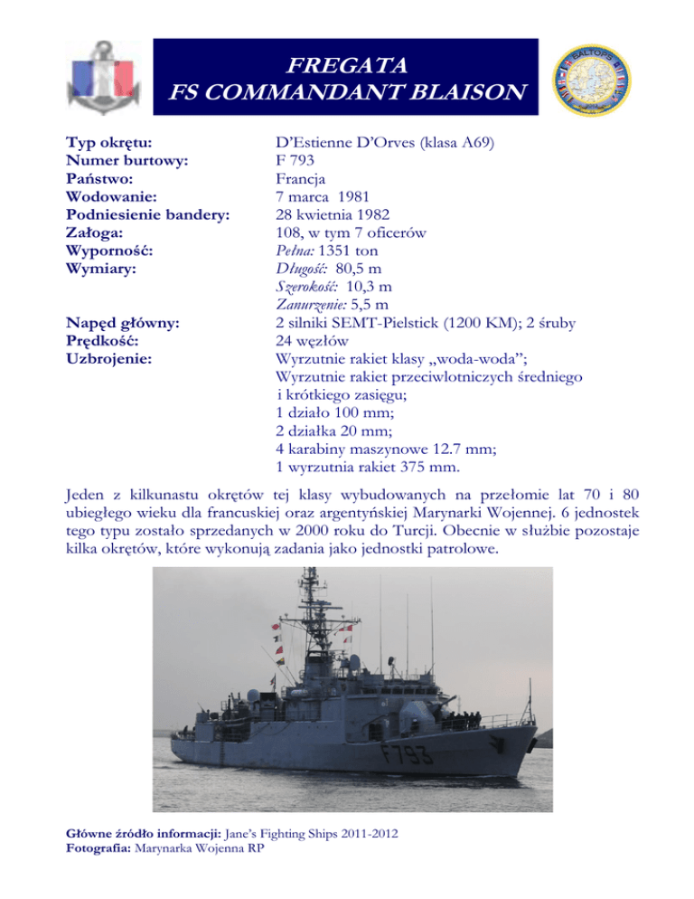FREGATA FS COMMANDANT BLAISON Typ okrętu: Numer burtowy: Państwo: Wodowanie: Podniesienie bandery: Załoga: Wyporność: Wymiary: Napęd główny: Prędkość: Uzbrojenie: D’Estienne D’Orves (klasa A69) F 793 Francja 7 marca 1981 28 kwietnia 1982 108, w tym 7 oficerów Pełna: 1351 ton Długość: 80,5 m Szerokość: 10,3 m Zanurzenie: 5,5 m 2 silniki SEMT-Pielstick (1200 KM); 2 śruby 24 węzłów Wyrzutnie rakiet klasy „woda-woda”; Wyrzutnie rakiet przeciwlotniczych średniego i krótkiego zasięgu; 1 działo 100 mm; 2 działka 20 mm; 4 karabiny maszynowe 12.7 mm; 1 wyrzutnia rakiet 375 mm. Jeden z kilkunastu okrętów tej klasy wybudowanych na przełomie lat 70 i 80 ubiegłego wieku dla francuskiej oraz argentyńskiej Marynarki Wojennej. 6 jednostek tego typu zostało sprzedanych w 2000 roku do Turcji. Obecnie w służbie pozostaje kilka okrętów, które wykonują zadania jako jednostki patrolowe. Główne źródło informacji: Jane’s Fighting Ships 2011-2012 Fotografia: Marynarka Wojenna RP