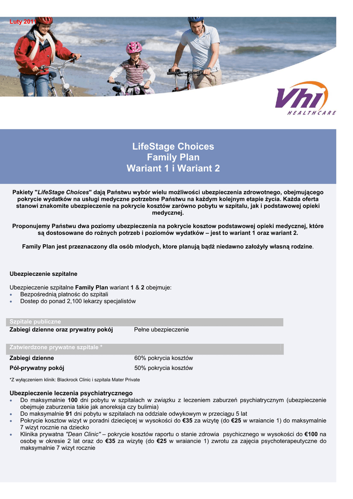 Luty 2011 LifeStage Choices Family Plan Wariant 1 i Wariant 2 Pakiety "LifeStage Choices" dają Państwu wybór wielu możliwości ubezpieczenia zdrowotnego, obejmującego pokrycie wydatków na usługi medyczne potrzebne Państwu na każdym kolejnym etapie życia. Każda oferta stanowi znakomite ubezpieczenie na pokrycie kosztów zarówno pobytu w szpitalu, jak i podstawowej opieki medycznej. Proponujemy Państwu dwa poziomy ubezpieczenia na pokrycie kosztow podstawowej opieki medycznej, które są dostosowane do rożnych potrzeb i poziomów wydatków – jest to wariant 1 oraz wariant 2. Family Plan jest przeznaczony dla osób mlodych, ktore planują bądź niedawno założyły własną rodzine. Ubezpieczenie szpitalne Ubezpieczenie szpitalne Family Plan wariant 1 & 2 obejmuje: Bezpośrednią platnośc do szpitali Dostep do ponad 2,100 lekarzy specjalistów Szpitale publiczne Zabiegi dzienne oraz prywatny pokój Pełne ubezpieczenie Zatwierdzone prywatne szpitale * Zabiegi dzienne 60% pokrycia kosztów Pół-prywatny pokój 50% pokrycia kosztów *Z wyłączeniem klinik: Blackrock Clinic i szpitala Mater Private Ubezpieczenie leczenia psychiatrycznego Do maksymalnie 100 dni pobytu w szpitalach w związku z leczeniem zaburzeń psychiatrycznym (ubezpieczenie obejmuje zaburzenia takie jak anoreksja czy bulimia) Do maksymalnie 91 dni pobytu w szpitalach na oddziale odwykowym w przeciągu 5 lat Pokrycie kosztow wizyt w poradni dziecięcej w wysokości do €35 za wizytę (do €25 w wraiancie 1) do maksymalnie 7 wizyt rocznie na dziecko Klinika prywatna "Dean Clinic" – pokrycie kosztów raportu o stanie zdrowia psychicznego w wysokości do €100 na osobę w okresie 2 lat oraz do €35 za wizytę (do €25 w wraiancie 1) zwrotu za zajęcia psychoterapeutyczne do maksymalnie 7 wizyt rocznie Ubezpieczenie dla matki i dziecka Pokrycie kosztów związanych z ciążą i porodem Publiczny szpital Prywatne zakwaterowanie Pełne pokrycie kosztow za 3 dni pobytu Prywatny szpital Zakwaterowanie i koszty szpitalne Ubezpieczenie do kwoty €3,400 Poród w domu Koszty opieki medycznej Ubezpieczenie do kwoty €3,400 Opieka przed- i poporodowa w roku narodzin dziecka GP, lekarz specjalista lub pielęgniarka Po-porodowa opieka pielegniarska w domu Wizyta u lekarza pediatry Do €300 w roku narodzin dziecka (minus excess w wysokości €25) Do €400 w roku narodzin dziecka Wariant 2 (minus excess w wysokości €25) Do €1,200 jesli pobyt w szpitalu trwał jedna noc, do €600 jesli pobyt w szpitalu trwal dwie noce Wariant 1 Wariant 1 Do €60 za pierwsza wizyte Wariant 2 Do €75 za pierwsza wizyte Lekcje masażu dla niemowląt Zwrot do kwoty €100 w roku narodzin dziecka Opieką pielęgniarska nad dzieckiem w domu Dofinansowanie do kwoty max. €100 dziennie do max. 28 dni rocznie Rodzic przebywajacy z hospitalizowanym dzieckiem Do €100 dziennie do maximum 14 dni na pokrycie kosztow podróży i zakwaterowania dla rodzica * Bezpłatne ubezpieczenie dla Państwa nowo narodzonego dziecka obowiązujące do czasu kolejnego odnowienia polisy. Rekonwalescencja Ubezpieczenie kosztow pobytów w zatwierdzonych ośrodkach rehabilitacji do €30 za dzien do max. 14 dni za pobyt. Dofinansowanie do kosztow zakwaterowania w przypadku pacjentow z nowotworem, którzy dojeżdżają na zabiegi, w kwocie do €100 za każdą noc, do kwoty €1,500 w roku kalendarzowym. Pokrycie kosztów leczenia poza granicami Irlandii Pokrycie kosztow do kwoty €100,000 w związku z leczeniem poza granicami Irlandii z powodu niespodziewanej choroby lub wypadku, dotyczy pobytu nie przekraczającego 180 dni. Wybór leczenia zagranicą: - Zabiegi wykonywane w Irlandii – ubezpieczenie do kwoty €100,000* - Zabiegi niewykonywane w Irlandii - ubezpieczenie do kwoty €100,000* Całodobowy dostęp telefoniczny do lekarza specjalisty mówiącego po angielsku. Pomoc w znalezieniu najbliższego lekarza pierwszego kontaktu, szpitala lub przychodni. * Koniecznośc uzyskania wcześniejszego zatwierdzenia oraz spełnienia wszystkich wymaganych kryteriów ubezpieczenia Kontakt telefoniczny z pielęgniarką – NurseLine 24/7 Jeśli będą Państwo potrzebować poradymedycznej,mogą się Państwo kontaktować z NurseLine 24/7 przez całą dobęi otrzymać poradę medyczną od pielęgniarki w kwestii wszelkich dolegliwości i problemów ze zdrowiem. W usłudze NurseLine 24/7 możemy również zorganizowac dla Państwa drugą opinię lekarza specjalisty poprzez The Best Doctors, zreszającą 50,000 uznanych lekarzy specjalistów z całego świata. NurseLine 24/7 jest dostępna 24 godziny na dobę, 7 dni w tygodniu i dostępna jedynia dla członków Vhi Healthcare. Proszę pamiętac o konieczności podania swojego numeru polisy. Numer telefonu to 1850 247 724 Ubezpieczenie podstawowych kosztów opieki medycznej wariant 1 i 2 Wariant 1 Wariant 2 Limit wizyt Roczny excess* €25 na ubezpieczonego €25 na ubezpieczonego Maksymalny benefit €3,200 €4,000 Wizyty u lekarza pierwszego kontaktu Wizyty u specjalisty Do €25 za wizyte Do €35 za wizyte Do €60 za wizyte Do €75 za wizyte Lekarz patolog Do €60 Do €75 Lekarz radiolog Patologia, radiologia oraz testy diagnostyczne Wizyty u fizjoterapeuty Do €60 50% uzgodnionych stawek z zatwierdzona kliniką, max. €300 na ubezpieczonego na rok Do €25 za wizyte Do €75 75% uzgodnionych stawek z zatwierdzona kliniką, max. €750 na ubezpieczonego na rok Do €35 za wizyte Wizyty u dentysty Do €25 za wizyte Do €35 za wizyte Terapie uzupełniające 1 Do €25 za wizyte Do €35 za wizyte Medycyna alternatywna 2 Do €25 za wizyte Do €35 za wizyte Opłata A&E Do €75 za wizyte Do €75 za wizyte Okulistyka 75% wydatkow, do €55 na ubezpieczonego Do €25 na ubezpieczonego 75% wydatkow, do €100 za ubezpieczonego Do €35 na ubezpieczonego Do €25 za wizyte Do €35 za wizyte Do €75 za wizyte Do €75 za wizyte Test słuchu Wizyty u psychologa klinicznego Wizyty w klinikach SwiftCare 7 