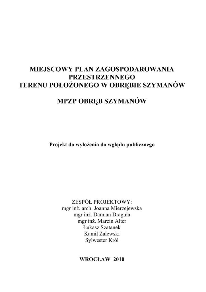 MIEJSCOWY PLAN ZAGOSPODAROWANIA PRZESTRZENNEGO TERENU POŁOśONEGO W OBRĘBIE SZYMANÓW MPZP OBRĘB SZYMANÓW Projekt do wyłoŜenia do wglądu publicznego ZESPÓŁ PROJEKTOWY: mgr inŜ. arch. Joanna Mierzejewska mgr inŜ. Damian Draguła mgr inŜ. Marcin Alter Łukasz Szatanek Kamil Zalewski Sylwester Król WROCŁAW 2010 UCHWAŁA NR .................. RADY GMINY WISZNIA MAŁA z dnia .................................. w sprawie: uchwalenia miejscowego planu zagospodarowania przestrzennego terenu połoŜonego w obrębie Szymanów – MPZP OBRĘB SZYMANÓW Na podstawie art. 18 ust. 2 pkt. 5 ustawy z dnia 8 marca 1990r. o samorządzie gminnym (Dz. U. z 2001r. Nr 142 poz. 1591 ze zm.) i art. 20 ust. 1 ustawy z dnia 27 marca 2003r. o planowaniu i zagospodarowaniu przestrzennym (Dz. U. z 2003r. Nr 80, poz. 717 ze zm.) oraz w nawiązaniu do Uchwały Nr V/VI/45/07 Rady Gminy Wisznia Mała z dnia 20 czerwca 2007r. o przystąpieniu do sporządzenia miejscowego planu zagospodarowania przestrzennego terenu połoŜonego w obrębie Szymanów, po stwierdzeniu zgodności ustaleń projektu planu z zapisem Studium Uwarunkowań i Kierunków Zagospodarowania Przestrzennego Gminy Wisznia Mała (uchwała nr V/XXXV/194/09 Rady Gminy Wisznia Mała z dnia 29 grudnia 2009r.), Rada Gminy Wisznia Mała uchwala, co następuje: ROZDZIAŁ I PRZEPISY OGÓLNE §1 Uchwala się miejscowy plan zagospodarowania przestrzennego obrębu Szymanów, w granicach określonych w załączniku graficznym nr 1 do uchwały - zwany dalej w skrócie MPZP OBRĘB SZYMANÓW. §2 Ustalenia planu wyraŜone są w postaci: 1. Rysunku planu w skali 1:2000 stanowiącego załącznik graficzny do niniejszej uchwały, obowiązującego w zakresie: 1) granic obszaru objętego planem, 2) funkcji terenów, 3) linii rozgraniczających tereny o róŜnych funkcjach, 4) obowiązujących linii zabudowy, 5) nieprzekraczalnych linii zabudowy, 6) stref oddziaływania napowietrznych linii energetycznych średniego napięcia, 7) granic stref ochronnych od gazociągu wysokiego ciśnienia, 8) zasięgu obszaru zalanego wodą powodziową w 1997roku, 9) zasięgu wyznaczonych powierzchni ograniczających całkowitą wysokość zabudowy, 10) granic obszarów powierzchni podejścia, 11) granic obszarów powierzchni przejściowej, 12) lokalizacji pomników przyrody, 13) granicy strefy „B” ochrony konserwatorskiej, 14) lokalizacji zabytków wpisanych do wojewódzkiej ewidencji zabytków, 15) lokalizacji stanowisk archeologicznych, 16) granicy strefy ochrony zabytków archeologicznych, 17) zasięgu ekosystemów wzdłuŜ cieków wodnych, 18) granic obszaru rezerwy publicznej komunikacji drogowej, 19) granic terenów zorganizowanej działalności inwestycyjnej. 2. Zasad zagospodarowania terenów określonych w rozdziale II niniejszej uchwały; 3. Zasad obsługi w zakresie infrastruktury technicznej określonych w rozdziale III niniejszej uchwały; 4. Zasad ochrony środowiska określonych w rozdziale IV niniejszej uchwały; 5. Zasad ochrony dziedzictwa kulturowego określonych w rozdziale V niniejszej uchwały; 6. Wysokości opłat z tytułu wzrostu wartości nieruchomości określonych w rozdziale VI niniejszej uchwały. §3 1. 2. 3. 4. 5. 6. 7. Ilekroć w przepisach niniejszej uchwały jest mowa o: Planie – naleŜy przez to rozumieć miejscowy plan zagospodarowania przestrzennego terenu połoŜonego w obrębie Szymanów zwany MPZP OBRĘB SZYMANÓW, o którym mowa w §1 uchwały; Rysunku planu – naleŜy przez to rozumieć rysunek w skali 1:2000 stanowiący integralną część niniejszej uchwały; Terenie – naleŜy przez to rozumieć obszar ograniczony na rysunku planu liniami rozgraniczającymi, oznaczony kolejną cyfrą i symbolem funkcji zgodnie z oznaczeniami graficznymi określonymi w legendzie; Funkcji terenu – naleŜy przez to rozumieć przeznaczenie terenu; Funkcji wiodącej terenu – naleŜy przez to rozumieć przeznaczenie większej niŜ 50% powierzchni działki lub większej niŜ 50% powierzchni uŜytkowej wszystkich obiektów na działce; Obiektach pomocniczych – naleŜy przez to rozumieć garaŜe, budynki gospodarcze oraz wiaty; Obiektach infrastruktury towarzyszącej – naleŜy przez to rozumieć obiekty małej architektury, przyłącza infrastruktury technicznej oraz niezbędne urządzenia budowlane; 2 8. 9. 10. 11. 12. 13. 14. 15. 16. 17. 18. 19. 20. 21. 22. 23. Całkowitej wysokości budynków - naleŜy przez to rozumieć wysokość liczoną od powierzchni gruntu do najwyŜszej kalenicy dachu a na terenach objętych zasięgiem wyznaczonych powierzchni ograniczających wysokość zabudowy do całkowitej wysokości budynku zalicza się równieŜ urządzenia na dachu takie jak np.: kominy, wywietrzniki, anteny, reklamy itp; Ilości kondygnacji - naleŜy przez to rozumieć ilość kondygnacji nadziemnych, w tym poddasze uŜytkowe; Powierzchni zabudowy – naleŜy przez to rozumieć powierzchnię pod budynkami w obrysie ścian zewnętrznych; Nieprzekraczalnej linii zabudowy – naleŜy przez to rozumieć linię, której nie moŜe przekroczyć zewnętrzny obrys budynku, nie licząc schodów, gzymsów, dachów nad wejściem, okapów oraz balkonów i loggii; Obowiązującej linii zabudowy – naleŜy przez to rozumieć linię, z którą zgodna musi być elewacja frontowa na conajmniej 60% jej długości na wysokości parteru, nie licząc schodów, gzymsów, dachów nad wejściem; Gabarytach kolidujących z krajobrazem – naleŜy przez to rozumieć gabaryty obiektu, którego wysokość i szerokość lub długość w rzucie poziomym przekracza w sposób wyraźny – o 50% rozmiary sąsiadującej zabudowy, (nie dotyczy wieŜ kościelnych); NieuciąŜliwej zabudowie usługowej – naleŜy przez to rozumieć inwestycje nie zaliczone do przedsięwzięć mogących znacząco oddziaływać na środowisko lub wymagających sporządzenia raportu, zgodnie z wymogami stosownych przepisów o ochronie środowiska, oraz przedsięwzięć, dla których sporządzony r