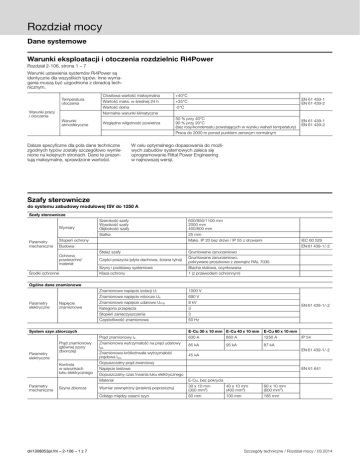Rozdział mocy Dane systemowe Warunki eksploatacji i otoczenia rozdzielnic Ri4Power Rozdział 2-106, strona 1 – 7 Warunki ustawienia systemów Ri4Power są identyczne dla wszystkich typów. Inne wymagania muszą być uzgodnione z doradcą technicznym. Temperatura otoczenia Warunki pracy i otoczenia Chwilowa wartość maksymalna +40°C Wartość maks. w średniej 24 h +35°C Wartość dolna -5°C EN 61 439-1 EN 61 439-2 Normalne warunki klimatyczne Warunki atmosferyczne Względna wilgotność powietrza 50 % przy 40°C 90 % przy 20°C (bez rosy/kondensatu powstających w wyniku wahań temperatury) EN 61 439-1 EN 61 439-2 Praca do 2000 m ponad punktem zerowym normalnym Dalsze specyficzne dla pola dane techniczne zgodnych typów zostały szczegółowo wymienione na kolejnych stronach. Dane te prezentują maksymalne, sprawdzone wartości. W celu optymalnego dopasowania do możliwych zabudów systemowych zaleca się oprogramowanie Rittal Power Engineering w najnowszej wersji. Szafy sterownicze do systemu zabudowy modułowej ISV do 1250 A Szafy sterownicze Wymiary Szerokość szafy Wysokość szafy Głębokość szafy Siatka Parametry mechaniczne Stopień ochrony 600/850/1100 mm 2000 mm 400/600 mm 25 mm Maks. IP 20 bez drzwi / IP 55 z drzwiami IEC 60 529 Budowa Ochrona powierzchni/ materiał Środki ochronne EN 61 439-1/-2 Stelaż szafy Gruntowane zanurzeniowo Części poszycia (płyta dachowa, ściana tylna) Gruntowane zanurzeniowo, pokrywane proszkowo z zewnątrz RAL 7035 Szyny i podstawy systemowe Blacha stalowa, ocynkowana Klasa ochrony 1 (z przewodem ochronnym) Ogólne dane znamionowe Parametry elektryczne Napięcie znamionowe Znamionowe napięcie izolacji Ui 1000 V Znamionowe napięcie robocze Ue 690 V Znamionowe napięcie udarowe Uimp 8 kV Kategoria przepięcia 3 Stopień zanieczyszczenia 3 Częstotliwość znamionowa 50 Hz System szyn zbiorczych Parametry elektryczne Prąd znamionowy (głównej szyny zbiorczej) Kontrola w warunkach łuku elektrycznego Parametry mechaniczne Szyna zbiorcza dri1308053pl.fm – 2-106 – 1 z 7 EN 61 439-1/-2 E-Cu 30 x 10 mm E-Cu 40 x 10 mm E-Cu 60 x 10 mm Prąd znamionowy Ie 630 A 850 A 1250 A Znamionowa wytrzymałość na prąd udarowy Ipk 85 kA 95 kA 87 kA Znamionowa krótkotrwała wytrzymałość prądowa Icw 45 kA IP 54 EN 61 439-1/-2 Dopuszczalny prąd zwarciowy Napięcie testowe EN 61 641 Dopuszczalny czas trwania łuku elektrycznego Materiał E-Cu, bez pokrycia Wymiar zewnętrzny (przekrój poprzeczny) 30 x 10 mm (300 mm2) 40 x 10 mm (400 mm2) 60 x 10 mm (600 mm2) Odstęp między osiami szyn 60 mm 100 mm 185 mm Szczegóły techniczne / Rozdział mocy / 03.2014 Rozdział mocy Dane systemowe Szafy sterownicze do powietrznych i kompaktowych wyłączników mocy (ACB + MCCB) Szafy sterownicze Wymiary Szerokość szafy Wysokość szafy Głębokość szafy 400/600/800 mm 1800/2000/2200 mm 600/800 mm Siatka Parametry mechaniczne 25 mm Stopień ochrony Maks. IP 54 IEC 60 529 Budowa 1–4 EN 61 439-1/-2 Ochrona powierzchni/ materiał Stelaż szafy Gruntowane zanurzeniowo Części poszycia (płyta dachowa, ściana tylna) Gruntowane zanurzeniowo, pokrywane proszkowo z zewnątrz RAL 7035 Mocowanie systemowe Stal nierdzewna Szyny i podstawy systemowe Blacha stalowa, ocynkowana Znamionowe napięcie izolacji Ui 1000 V Znamionowe napięcie robocze Ue 690 V Znamionowe napięcie udarowe Uimp 8 kV Ogólne dane znamionowe Parametry elektryczne Napięcie znamionowe Kategoria przepięcia IV Stopień zanieczyszczenia 3 Częstotliwość znamionowa 50 Hz System szyn zbiorczych Maxi-PLS Parametry elektryczne Prąd znamionowy (głównej szyny zbiorczej) Kontrola w warunkach łuku elektrycznego Parametry mechaniczne Szyna zbiorcza Prąd znamionowy Ie3) Parametry elektryczne Kontrola w warunkach łuku elektrycznego Parametry mechaniczne Szyna zbiorcza Parametry mechaniczne 1) Z Prąd znamionowy (głównej szyny zbiorczej) Szyna zbiorcza Maxi-PLS 3200 2800 A IP 54 1600 A 2000 A 3000 A IP 2X1) 1800 A 2500 A 4000 A IP 2X2) 220 kA Znamionowa krótkotrwała wytrzymałość prądowa Icw 50 kA 100 kA 70 kA Dopuszczalny prąd zwarciowy 50 kA Napięcie testowe 420 V Dopuszczalny czas trwania łuku elektrycznego 0,3 sek. Materiał E-Cu, bez pokrycia Wymiar zewnętrzny (przekrój poprzeczny) 45 x 45 mm (1000 mm2) EN 61 439-1/-2 EN 61 641 45 x 45 mm (1380 mm2) 60 x 60 mm (2700 mm2) E-Cu 30 x 10 mm PLS 1600 800 A 1150 A IP 54 860 A 1300 A IP 43 1000 A4) 1600 A2) IP 2X Znamionowa wytrzymałość na prąd udarowy Ipk 68 kA 110 kA Znamionowa krótkotrwała wytrzymałość prądowa Icw 32 kA, 1 sek. 50 kA, 1 sek./50 kA, 3 sek. 50 kA Prąd znamionowy Ie3) Dopuszczalny prąd zwarciowy 30 kA Napięcie testowe 690 V Dopuszczalny czas trwania łuku elektrycznego 0,3 sek. Materiał E-Cu, bez pokrycia Wersja (przekrój) 30 x 10 mm (300 mm2) EN 61 439-1/-2 EN 61 641 PLS 1600 (900 mm2) Flat-PLS 60 Flat-PLS 100 2360 A 3120 A IP 54 2540 A 3400 A IP 43 4100 A2) 5500 A2) IP 2X Znamionowa wytrzymałość na prąd udarowy Ipk 154 kA 220 kA Znamionowa krótkotrwała wytrzymałość prądowa Icw 70 kA, 1 sek. 100 kA, 1 sek. Prąd znamionowy Ie3) Materiał E-Cu, bez pokrycia Wersja (przekrój) Do 4 x 60 x 10 mm (maks. 2400 mm2) EN 61 439-1/-2 Do 4 x 100 x 10 mm (maks. 4000 mm2) wykorzystaniem filtra wylotowego SK 3243.600 i płyty dachowej IP 2X 2) Z wykorzystaniem wentylatora filtrującego SK 3244.100 (700 m3/h) i płyty 3) Pozostałe prądy znamionowe przy innych klasach ochrony na zapytanie 4) Z Maxi-PLS 2000 1800 A 110 kA System szyn zbiorczych Flat-PLS Parametry elektryczne Maxi-PLS 1600 1400 A Znamionowa wytrzymałość na prąd udarowy Ipk System szyn zbiorczych RiLine Prąd znamionowy (głównej szyny zbiorczej) EN 61 439-1/-2 wykorzystaniem wentylatora filtrującego SK 3241.100 (230 Szczegóły techniczne / Rozdział mocy / 03.2014 m3/h) dachowej IP 2X i płyty dachowej IP 2X dri1308053pl.fm – 2-106 – 2 z 7 Rozdział mocy Dane systemowe Szafy sterownicze do pól sprzęgłowych Szafy sterownicze Wymi