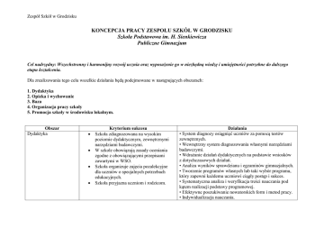 Zespół Szkół w Grodzisku KONCEPCJA PRACY ZESPOŁU SZKÓŁ W GRODZISKU Szkoła Podstawowa im. H. Sienkiewicza Publiczne Gimnazjum Cel nadrzędny: Wszechstronny i harmonijny rozwój ucznia oraz wyposażenie go w niezbędną wiedzę i umiejętności potrzebne do dalszego etapu kształcenia. Dla zrealizowania tego celu wszelkie działania będą podejmowane w następujących obszarach: 1. Dydaktyka 2. Opieka i wychowanie 3. Baza 4. Organizacja pracy szkoły 5. Promocja szkoły w środowisku lokalnym. Obszar Dydaktyka Kryterium sukcesu Szkoła zdiagnozowana na wysokim poziomie dydaktycznym, zewnętrznymi narzędziami badawczymi. W szkole obowiązują zasady oceniania zgodne z obowiązującymi przepisami zawartymi w WSO. Szkoła organizuje zajęcia pozalekcyjne dla uczniów o specjalnych potrzebach edukacyjnych. Szkoła przyjazna uczniom i rodzicom. Działania • System diagnozy osiągnięć uczniów za pomocą testów zewnętrznych. • Wewnętrzny system diagnozowania własnymi narzędziami badawczymi. • Wdrażanie działań dydaktycznych na podstawie wniosków z dotychczasowych działań. • Analiza wyników sprawdzianu i egzaminów gimnazjalnych. • Tworzenie programów własnych lub taki wybór programu, który zapewni każdemu uczniowi ciągły postęp i sukces. • Systematyczna analiza i weryfikacja treści nauczania pod kątem realizacji podstawy programowej. • Efektywne poszukiwanie nowatorskich form i metod pracy. • Indywidualizacja nauczania. Zespół Szkół w Grodzisku • Organizowanie zajęć wyrównawczych z poszczególnych przedmiotów dla uczniów. • Motywowanie uczniów do rozwijania własnych zainteresowań i uzdolnień. • Systematyczne uczestnictwo uczniów w konkursach przedmiotowych, interdyscyplinarnych, artystycznych i zawodach sportowych na szczeblu szkolnym i pozaszkolnym. • Stworzenie efektywnego systemu zajęć lekcyjnych i pozalekcyjnych zgodnie z priorytetami MEN „Rok 2011/2012 – Rokiem Szkoły z Pasją”. • Rozwijanie umiejętności językowych uczniów. • Realizacja projektów edukacyjnych. • Doskonalenie umiejętności efektywnej pracy w zespole. • Promowanie osiągnięć uczniów. Wychowanie i opieka Szkoła realizująca Program Wychowawczy i Szkolny Program Profilaktyki. Szkoła demokratyczna, samorządna i przyjazna uczniom. Szkoła bezpieczna i bez agresji. Szkoła przygotowująca do startu w dorosłe życie. • Udział rodziców w planowaniu pracy wychowawczej szkoły. • Systematyczna diagnoza środowiska rodzinnego uczniów. • Pedagogizacja rodziców w związku z problemami współczesnej młodzieży. • Integrowanie uczniów w zespołach klasowych i w całej szkole. • Efektywna współpraca społeczności szkolnej na rzecz podniesienia jakości pracy szkoły. • Doskonalenie umiejętności wychowawczych nauczycieli. Zespół Szkół w Grodzisku Baza Szkoła wyposażona w nowoczesne urządzenia i środki dydaktyczne, sprzęt komputerowy, multimedialny, sprzęt sportowy. Szkoła posiadająca księgozbiór zgodny z potrzebami uczniów i nauczycieli, niezbędny do właściwej realizacji zadań dydaktyczno – wychowawczych. • Racjonalne gospodarowanie środkami finansowymi. • Pozyskiwanie dodatkowych środków finansowych, w tym z EFS. • Systematyczne wzbogacanie biblioteki szkolnej w nowości czytelniczo – medialne. • Zakup sprzętu sportowego. • Wzbogacanie pracowni przedmiotowych w środki dydaktyczne i pomoce naukowe. Organizacja pracy szkoły Szkoła dobrze zorganizowana. Szkoła sprawnie zarządzana. Szkoła spełnia oczekiwania uczniów, rodziców i pracowników. • Aktualizowanie prawa wewnątrzszkolnego pod kątem zgodności z obowiązującym stanem prawnym oraz jego popularyzacja. • Zapewnienie dostępu do dokumentów wewnątrzszkolnych i prawa oświatowego. • Plan pracy szkoły tworzy spójną całość. • Usprawnienie komunikacji między dyrekcją, radą pedagogiczną, uczniami i rodzicami. Promocja szkoły w środowisku lokalnym Nauczyciele, uczniowie i rodzice identyfikują się ze szkołą. Pozytywny wizerunek szkoły w środowisku. Szkoła promuje i dokumentuje swoje osiągnięcia w mediach i na stronie internetowej. Promocja ukierunkowana na uczniów i rodziców. • Budowanie obrzędowości i tradycji szkoły. • Organizowanie imprez i uroczystości otwartych. • Współpraca z mediami. • Prezentowanie rodzicom ciekawych zajęć szkolnych, wystaw, występów artystycznych. • Kształtowanie postaw patriotycznych poprzez udział uczniów i nauczycieli w uroczystościach lokalnych.