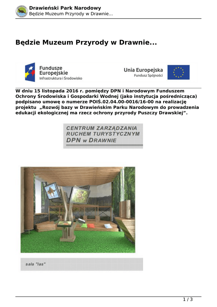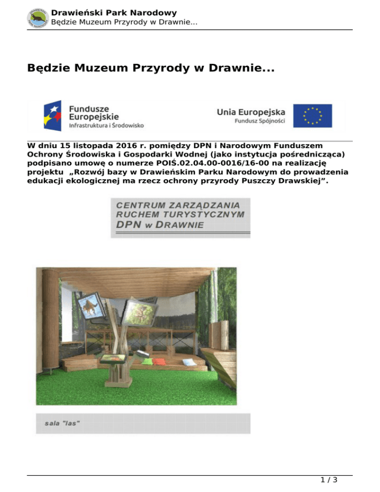 Drawieński Park Narodowy Będzie Muzeum Przyrody w Drawnie... Będzie Muzeum Przyrody w Drawnie... W dniu 15 listopada 2016 r. pomiędzy DPN i Narodowym Funduszem Ochrony Środowiska i Gospodarki Wodnej (jako instytucja pośrednicząca) podpisano umowę o numerze POIŚ.02.04.00-0016/16-00 na realizację projektu „Rozwój bazy w Drawieńskim Parku Narodowym do prowadzenia edukacji ekologicznej ma rzecz ochrony przyrody Puszczy Drawskiej”. 1/3 Drawieński Park Narodowy Będzie Muzeum Przyrody w Drawnie... Projekt zakłada organizację Centrum Edukacji i Turystyki DPN w Drawnie oraz przystosowanie Punktu Informacji Turystycznej „Wodny Świat” w Głusku do prowadzenia edukacji ekologicznej z zakresu ochrony ekosystemów wodnych. W Drawnie, w adoptowanym na cele edukacyjne zabytkowym budynku przy ul. Kolejowej, powstanie wystawa pod przewodnim hasłem „Las – zobaczyć to co zagrożone, zobaczyć to co niewidoczne”, poświęcona ekosystemom leśnym, uzupełniona elementami edukacji kajakarzy. Natomiast zgodnie z koncepcją DPN, w Głusku zostanie zorganizowana ekspozycja pt. „Wodny Świat”, prezentująca ekosystemy wodne (w tym akwaria z rybami i roślinami z rzek i jezior DPN). Wystawa będzie zawierać również elementy historyczne i kulturowe, eksponujące rolę rzeki Drawy w życiu dawnych mieszkańców Puszczy Drawskiej, na terenie której leży Drawieński Park Narodowy. 2/3 Drawieński Park Narodowy Będzie Muzeum Przyrody w Drawnie... Czas realizacji obu przedsięwzięć: II kw. 2017 – III kw. 2019 r. Wkrótce na stronie internetowej Drawieńskiego Parku Narodowego, zostanie założona zakładka „Rozwój bazy w Drawieńskim Parku Narodowym do prowadzenia edukacji ekologicznej ma rzecz ochrony przyrody Puszczy Drawskiej”. Będziemy na niej informować o bieżących postępach projektu. Data wydruku: 08.03.2017 00:36:07 Adres URL: http://dpn.pl/aktualnosci/334-bedzie-muzeum-przyrody-w-drawnie-.html 3/3 Powered by TCPDF (www.tcpdf.org)