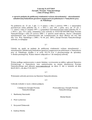Uchwałą Nr 8/27/2015 Zarządu Powiatu Namysłowskiego z dnia 25 lutego 2015 r. w sprawie podania do publicznej wiadomości wykazu nieruchomości – nieruchomości zabudowanej budynkiem garażowo-magazynowym położonym w Namysłowie przy ul. Pułaskiego Na podstawie art. 32 ust. 2 pkt. 3 i 4 ustawy z dnia 5 czerwca 1998 r. o samorządzie powiatowym (tekst jednolity Dz. U. z 2013 r., poz. 595, z późn. zm.), art. 35 ust. 1 i 2 ustawy z dnia 21 sierpnia 1997 r. o gospodarce nieruchomościami (tekst jednolity Dz. U. z 2014 r., poz. 518 z późn. zmianami).) oraz uchwały nr XXXVIII/369/2006 Rady Powiatu Namysłowskiego z dnia 28 czerwca 2006 r. w sprawie zasad nabycia, zbycia i obciążania nieruchomości oraz wydzierżawiania lub wynajmowania na okres dłuższy niż trzy lata (Dz. Urz. Woj. Opolskiego z 2006 r. Nr 64, poz. 2001), Zarząd Powiatu Namysłowskiego uchwala, co następuje: §1 Udziela się zgody na podanie do publicznej wiadomości wykazu nieruchomości – nieruchomości zabudowanej budynkiem garażowo-magazynowym położonym w Namysłowie przy ul. Pułaskiego, działka o nr ewid. 851/78 k.m. 4 przeznaczonego do sprzedaży w drodze przetargowej. Wykaz stanowi załącznik nr 1 do niniejszej uchwały. §2 Wykaz podlega zamieszczeniu w prasie lokalnej, wywieszeniu na tablicy ogłoszeń Starostwa Powiatowego w Namysłowie oraz zamieszczeniu na stronie internetowej Powiatu Namysłowskiego pod adresem www.namyslow.pl, na okres 21 dni w terminie od dnia 06.03.2015 r. do dnia 27.03.2015 r. §3 Wykonanie uchwały powierza się Staroście Namysłowskiemu. §4 Uchwała wchodzi w życie z dniem podjęcia. Członkowie Zarządu Powiatu Namysłowskiego Przewodniczący Zarządu Powiatu Namysłowskiego 1. Bartłomiej Stawiarski Michał Ilnicki 2. Piotr Lechowicz 3. Krzysztof Żołnowski 4. Andrzej Michta Załącznik nr 1 do Uchwały Nr 8/27/2015 Zarząd Powiatu Namysłowskiego z dnia 25 lutego 2015 r. w sprawie podania do publicznej wiadomości wykazu nieruchomości – nieruchomości zabudowanej budynkiem garażowomagazynowym położonym w Namysłowie przy ul. Pułaskiego Lp. Położenie nieruchomości Oznaczenie nieruchomości Pow. nieruchomości Działka o nr Namysłów, 0,0581 ha w tym ul. Pułaskiego ewid. 851/78 k.m. 4 powierzchnia obręb Namysłów, użytkowa pow. 0,0581 ha - budynku KW garażowo OP1U/00016036/6 magazynowego 90 m2, składającego się z 5 boksów o pow. użytkowej po 18 m2 każdy 1. Opis nieruchomości Przeznaczenie w miejscowym planie zagospodarowania przestrzennego Działka położona na peryferiach miasta, III linia zabudowy względem C.9U. – teren zabudowy ul. Pułaskiego, w sąsiedztwie terenów składowo-magazynowych i usługowej budynków Zespołu Szkół Mechanicznych. Aktualny sposób użytkowania nieruchomości - garażowo-magazynowy. Sieć uzbrojenia terenu w e.e., wodę, kanalizację - w pobliżu. Dojazd do nieruchomości będzie zapewniony przez istniejący ciąg komunikacyjny na działce nr851/77, na której ustanowiona zostanie służebnośc gruntowa przejazdu i przechodu.. Działka zabudowana 5 boksami garażowymi naziemnymi oraz przybudowanym skrejnym boksem gospodarczym częściowo zagłębionym w ziemi. Wady szczególne: na działkę zachodzi dach budynku położonego na nieruchomości sąsiedniej. Na rzecz właścicieli budynku sąsiadującego na przedmiotowej nieruchomości ustanowiona zostanie służebność konserwacji i napraw tego dachu. W skład nieruchomości wchodzi około 40 letni budynek, jedno kondygnacyjny, niepodpiwniczony, ściany z prefabrykatów, stropodach ognioodporny z płyt korytkowych kryty papą, rynna z blachy ocynkowanej, posadzka cementowa, bramy wjazdowe drewniane deskowe, wyposażenie w instalacje - e.e. Skrajny boks magazynowy częściowo zagłębiony w ziemi, do którego prowadzą zewnętrzne schody monolityczne. Pokrycie boksu prowizoryczne blachą. Brama wejściowa metalowa. Stan techniczny budynku ocenia się jako średni. Powierzchnia użytkowa każdego z boksów garażowych i boksu magazynowego to 18 m2. Łączna powierzchnia użytkowa budynku to 90 m2 Forma zbycia Cena nieruchomości netto Sprzedaż w 48.060,00 zł drodze z czego wartość przetargu rynkowa nieruchomości to 47.100,00 zł oraz wartość rynkowa służebności drogowej to - 960,00 zł Do powyższej kwoty zostaną doliczone koszty przygotowania nieruchomości do sprzedaży. Koszty związane z zawarciem aktu notarialnego ponosi przyszły właściciel nieruchomości. 1. Wykaz podlega wywieszeniu na tablicy ogłoszeń Starostwa Powiatowego oraz zamieszczeniu na stronie internetowej Powiatu Namysłowskiego na okres 21 dni tj. od dnia 06.03.2015 r. do dnia 27.03.2015 r. 2. Informacja o wywieszeniu zostanie podana do publicznej wiadomości w prasie lokalnej. 3. Osobom wymienionym w art. 34 ust. 1, pkt 1 i 2 ustawy z dnia 21 sierpnia 1997 r. o gospodarce nieruchomościami (tekst jednolity Dz. U. z 2014 r., poz. 518 z późn. zmianami) przysługuje pierwszeństwo w nabyciu nieruchomości jeżeli zgłoszą wniosek do dnia 17.04.2015 r. Zarząd Powiatu Namysłowskiego 2