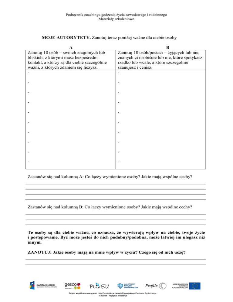 Podręcznik coachingu godzenia życia zawodowego i rodzinnego Materiały szkoleniowe MOJE AUTORYTETY. Zanotuj teraz poniżej ważne dla ciebie osoby A Zanotuj 10 osób – swoich znajomych lub bliskich, z którymi masz bezpośredni kontakt, a którzy są dla ciebie szczególnie ważni, z których zdaniem się liczysz. - B Zanotuj 10 osób/postaci – żyjących lub nie, znanych ci osobiście lub nie, które spotykasz rzadko lub wcale, a które szczególnie szanujesz i cenisz. - - - - - - - - - - - - - - - - - - - Zastanów się nad kolumną A: Co łączy wymienione osoby? Jakie mają wspólne cechy? Zastanów się nad kolumną B: Co łączy wymienione osoby? Jakie mają wspólne cechy? Te osoby są dla ciebie ważne, co oznacza, że wywierają wpływ na ciebie, twoje życie i postępowanie. Być może jesteś do nich podobny/podobna, może łatwiej im ulegasz niż innym. ZANOTUJ: Jakie osoby mają na mnie wpływ w życiu? Czego się od nich uczę?
