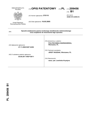 RZECZPOSPOLITA POLSKA (12) OPIS PATENTOWY (19) (21) Numer zgłoszenia: 375115 Urząd Patentowy Rzeczypospolitej Polskiej (54) PL 209456 (13) B1 (11) (51) Int.Cl. G02B 6/10 (2006.01) (22) Data zgłoszenia: 16.05.2005 Sposób zwiększenia pasma modowego światłowodu wielomodowego oraz urządzenie do stosowania tego sposobu (73) Uprawniony z patentu: (43) Zgłoszenie ogłoszono: POLITECHNIKA WARSZAWSKA, Warszawa, PL 27.11.2006 BUP 24/06 (72) Twórca(y) wynalazku: JERZY SIUZDAK, Warszawa, PL (45) O udzieleniu patentu ogłoszono: 30.09.2011 WUP 09/11 (74) Pełnomocnik: PL 209456 B1 rzecz. pat. Lewińska Krystyna 2 PL 209 456 B1 Opis wynalazku Znany jest sposób zwiększenia pasma modowego światłowodu wielomodowego, w którym określa się optymalny kształt profilu współczynnika załamania światłowodu wielomodowego. Współczynnik załamania światłowodu zależy od odległości od środka rdzenia światłowodu i na podstawie zależności opóźności grupowych modów i dyspersji chromatycznej określa się taki kształt profilu współczynnika załamania światłowodu wielomodowego, aby wszystkie mody prowadzone miały najbardziej zbliżone do siebie opóźności grupowe. Optymalny kształt profilu jest zbliżony do parabolicznego i uzyskuje się go w procesie wytwarzania światłowodu przez stopniowe osadzanie na walcu stanowiącym preformę kolejnych warstw szkła kwarcowego, różniących się domieszkowaniem i współczynnikiem załamania, dzięki odpowiedniemu doborowi domieszek i czasów osadzania. Wszelkie odstępstwa od optymalnego kształtu profilu prowadzą do istotnego zmniejszenia pasma tego światłowodu. Znany jest sposób zwiększenia pasma modowego światłowodu wielomodowego, w którym określa się warunki wprowadzenia strumienia świetlnego ze źródła światła do światłowodu wielomodowego. W tym celu mierzy się otoczony strumień EF(r) na końcu dziesięciometrowego odcinka światłowodu wielomodowego pobudzanego badanym źródłem światła. Jest on zdefiniowany jako mierzony w strefie bliskiej ( ) procent całkowitej mocy optycznej zawartej w kole o promieniu r i środku w centrum rdzenia światłowodu, co można wyrazić matematycznie jako: r Rmax EF(r) = 0∫I(x) x dx/0∫I(x) x dx gdzie I(x) jest natężeniem światła w odległości x od środka rdzenia światłowodu. W przypadku światłowodów przeznaczonych do linii 1 Gbit/s musi być spełniony warunek: EF(4,5 μm) ≤ 25% oraz EF(15 μm) ≥ 75%. W przypadku światłowodów przeznaczonych do linii 10 Gbit/s musi być spełniony warunek: EF(4,5 μm) ≤ 30% oraz EF(19 μm) ≥ 86%. Przy spełnieniu powyższych warunków moc w modach najwyższych i najniższych rzędów jest ograniczona, a co za tym idzie eliminowany jest wpływ najczęstszych odstępstw od optymalnego kształtu profilu współczynnika załamania światłowodu wielomodowego, które mają miejsce bądź na granicy rdzenia i płaszcza światłowodu - wpływające na mody najwyższych rzędów i które mają miejsce w centrum światłowodu - tzw. dip, wpływające na mody najniższych rzędów. Znane urządzenie realizujące powyższy sposób stanowi układ optyczny usytuowany między źródłem światła a czołem światłowodu. Układ optyczny składa się z jednej lub większej liczby soczewek optycznych wklęsło - wypukłych lub typu GRIN, soczewek cylindrycznych. Układ tych soczewek pozwala na spełnienie powyższych warunków wprowadzenia strumienia otoczonego i jednocześnie umożliwia wprowadzenie do światłowodu możliwie największej mocy optycznej. Sposób według wynalazku polega na tym, że filtruje się mody o najwyższych i najniższych rzędach za pomocą filtru optycznego. Urządzenie według wynalazku polega na tym, że stanowi go przesłona filtracyjna światła, usytuowana pomiędzy końcem światłowodu a wejściem układu fotodetektora. Przesłona filtracyjna ma postać dysku z koncentrycznym pierścieniem o średnicy wewnętrznej i zewnętrznej, który jest przepuszczalny dla światła. Rozwiązanie według wynalazku pozwala znacznie zwiększyć pasmo modowe światłowodu przy umiarkowanych stratach mocy świetlnej. Sposób według wynalazku jest bliżej przedstawiony przykładowo na rysunku, na którym fig. 1 przedstawia schematycznie urządzenie zwiększające pasma modowe światłowodu wielodomowego, a fig. 2 - przesłona filtracyjna w przekroju wzdłuż dysku. Urządzenie ma za czołem światłowodu 1 umieszczoną przesłonę filtracyjną, za którą usytuowany jest układ sprzęgający 3. Światło wychodzące z rdzenia światłowodu 1 tworzy wiązkę rozbieżną 1a, która charakteryzuje się tym, że w strefie dalekiej mody niskich rzędów rozchodzą się pod małymi kątami do osi optycznej układu, zaś mody wysokich rzędów - pod wysokimi kątami. Generalnie, rząd modu jest proporcjonalny do kąta jaki tworzy promień świetlny z osią światłowodu. Wiązka światła 1a na swej drodze napotyka na przesłonę filtracyjną 2 w postaci dysku z koncentrycznym pierścieniem P o średnicy wewnętrznej d i zewnętrznej D, który jest przepuszczalny dla światła. Do układu sprzęgają- PL 209 456 B1 3 cego światło 3 umieszczonego za przesłoną filtracyjną 2, docierają promienie świetlne przechodzące przez pierścień P i wyłącznie te promienie docierają do fotodetektora 4 usytuowanego za układem sprzęgającym światło 3. Układ sprzęgający światło 3 i fotodetektor 4 tworzą układ fotodetektora 3, 4. Obszary w centrum i na zewnątrz pierścienia P eliminują mody najniższych i najwyższych rzędów, a więc mody, które najbardziej różnią się opóźnościami grupowymi i jednocześnie są najbardziej narażone na typowe zaburzenia kształtu profilu załamania światłowodu. Pozwala to znacznie zwiększyć pasmo modowe światłowodu przy umiarkowanych stratach mocy świetlnej związanych z filtracją. Przez dobór wielkości średnicy wewnętrznej d i zewnętrznej D określa się, kt