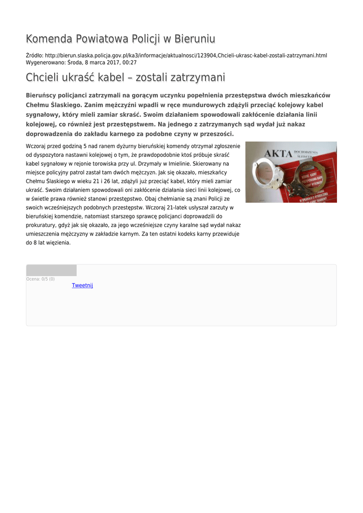 Komenda Powiatowa Policji w Bieruniu Źródło: http://bierun.slaska.policja.gov.pl/ka3/informacje/aktualnosci/123904,Chcieli-ukrasc-kabel-zostali-zatrzymani.html Wygenerowano: Środa, 8 marca 2017, 00:27 Chcieli ukraść kabel – zostali zatrzymani Bieruńscy policjanci zatrzymali na gorącym uczynku popełnienia przestępstwa dwóch mieszkańców Chełmu Ślaskiego. Zanim mężczyźni wpadli w ręce mundurowych zdążyli przeciąć kolejowy kabel sygnałowy, który mieli zamiar skraść. Swoim działaniem spowodowali zakłócenie działania linii kolejowej, co również jest przestępstwem. Na jednego z zatrzymanych sąd wydał już nakaz doprowadzenia do zakładu karnego za podobne czyny w przeszości. Wczoraj przed godziną 5 nad ranem dyżurny bieruńskiej komendy otrzymał zgłoszenie od dyspozytora nastawni kolejowej o tym, że prawdopodobnie ktoś próbuje skraść kabel sygnałowy w rejonie torowiska przy ul. Drzymały w Imielinie. Skierowany na miejsce policyjny patrol zastał tam dwóch mężczyzn. Jak się okazało, mieszkańcy Chełmu Ślaskiego w wieku 21 i 26 lat, zdążyli już przeciąć kabel, który mieli zamiar ukraść. Swoim działaniem spowodowali oni zakłócenie działania sieci linii kolejowej, co w świetle prawa również stanowi przestępstwo. Obaj chełmianie są znani Policji ze swoich wcześniejszych podobnych przestępstw. Wczoraj 21-latek usłyszał zarzuty w bieruńskiej komendzie, natomiast starszego sprawcę policjanci doprowadzili do prokuratury, gdyż jak się okazało, za jego wcześniejsze czyny karalne sąd wydał nakaz umieszczenia mężczyzny w zakładzie karnym. Za ten ostatni kodeks karny przewiduje do 8 lat więzienia. Ocena: 0/5 (0) Tweetnij