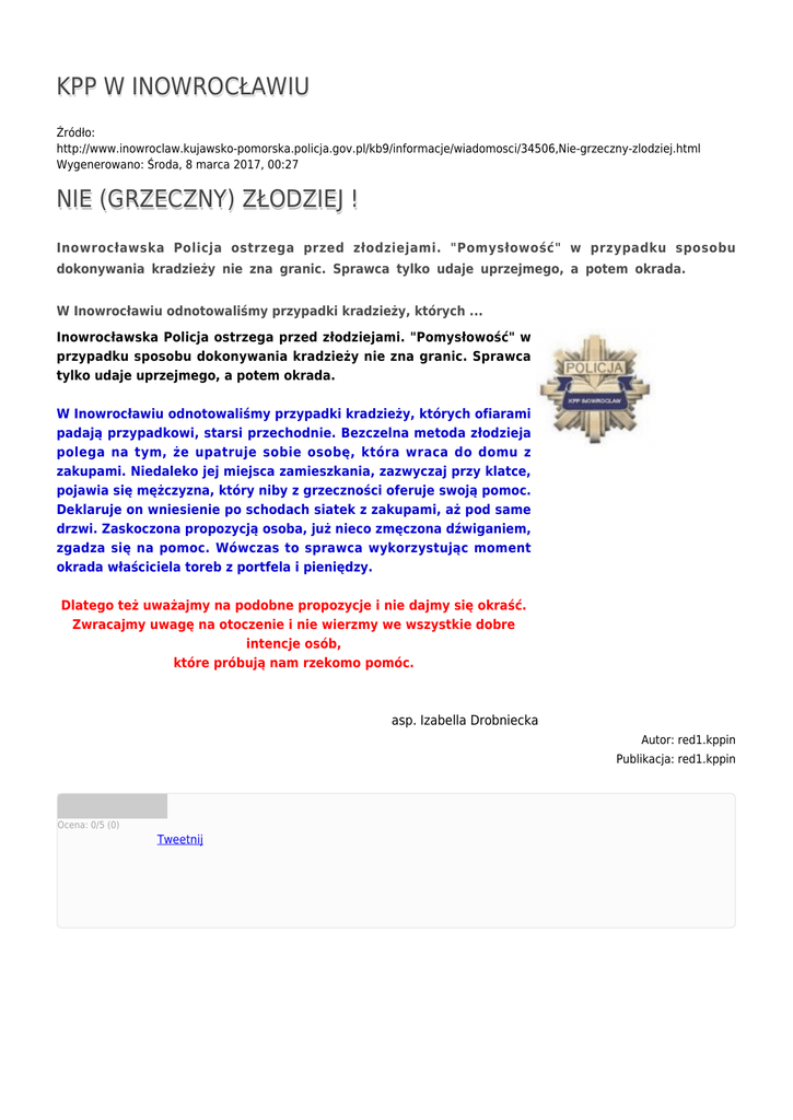 KPP W INOWROCŁAWIU Źródło: http://www.inowroclaw.kujawsko-pomorska.policja.gov.pl/kb9/informacje/wiadomosci/34506,Nie-grzeczny-zlodziej.html Wygenerowano: Środa, 8 marca 2017, 00:27 NIE (GRZECZNY) ZŁODZIEJ ! Inowrocławska Policja ostrzega przed złodziejami. "Pomysłowość" w przypadku sposobu dokonywania kradzieży nie zna granic. Sprawca tylko udaje uprzejmego, a potem okrada. W Inowrocławiu odnotowaliśmy przypadki kradzieży, których ... Inowrocławska Policja ostrzega przed złodziejami. "Pomysłowość" w przypadku sposobu dokonywania kradzieży nie zna granic. Sprawca tylko udaje uprzejmego, a potem okrada. W Inowrocławiu odnotowaliśmy przypadki kradzieży, których ofiarami padają przypadkowi, starsi przechodnie. Bezczelna metoda złodzieja polega na tym, że upatruje sobie osobę, która wraca do domu z zakupami. Niedaleko jej miejsca zamieszkania, zazwyczaj przy klatce, pojawia się mężczyzna, który niby z grzeczności oferuje swoją pomoc. Deklaruje on wniesienie po schodach siatek z zakupami, aż pod same drzwi. Zaskoczona propozycją osoba, już nieco zmęczona dźwiganiem, zgadza się na pomoc. Wówczas to sprawca wykorzystując moment okrada właściciela toreb z portfela i pieniędzy. Dlatego też uważajmy na podobne propozycje i nie dajmy się okraść. Zwracajmy uwagę na otoczenie i nie wierzmy we wszystkie dobre intencje osób, które próbują nam rzekomo pomóc. asp. Izabella Drobniecka Autor: red1.kppin Publikacja: red1.kppin Ocena: 0/5 (0) Tweetnij