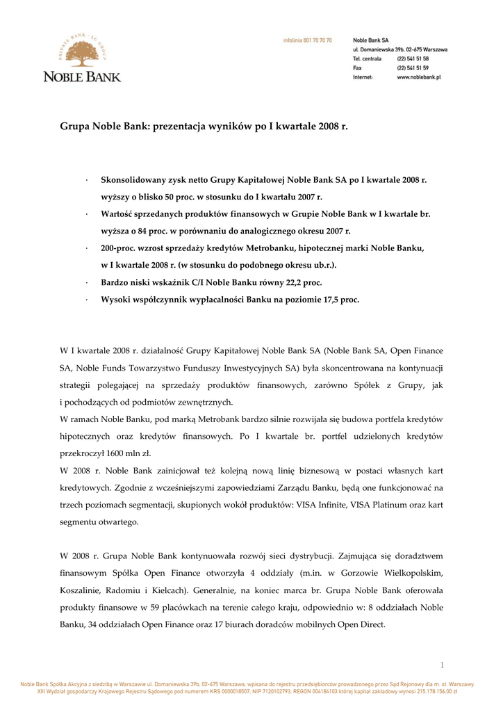 Grupa Noble Bank: prezentacja wyników po I kwartale 2008 r. · Skonsolidowany zysk netto Grupy Kapitałowej Noble Bank SA po I kwartale 2008 r. wyższy o blisko 50 proc. w stosunku do I kwartału 2007 r. · Wartość sprzedanych produktów finansowych w Grupie Noble Bank w I kwartale br. wyższa o 84 proc. w porównaniu do analogicznego okresu 2007 r. · 200‐proc. wzrost sprzedaży kredytów Metrobanku, hipotecznej marki Noble Banku, w I kwartale 2008 r. (w stosunku do podobnego okresu ub.r.). · Bardzo niski wskaźnik C/I Noble Banku równy 22,2 proc. · Wysoki współczynnik wypłacalności Banku na poziomie 17,5 proc. W I kwartale 2008 r. działalność Grupy Kapitałowej Noble Bank SA (Noble Bank SA, Open Finance SA, Noble Funds Towarzystwo Funduszy Inwestycyjnych SA) była skoncentrowana na kontynuacji strategii polegającej na sprzedaży produktów finansowych, zarówno Spółek z Grupy, jak i pochodzących od podmiotów zewnętrznych. W ramach Noble Banku, pod marką Metrobank bardzo silnie rozwijała się budowa portfela kredytów hipotecznych oraz kredytów finansowych. Po I kwartale br. portfel udzielonych kredytów przekroczył 1600 mln zł. W 2008 r. Noble Bank zainicjował też kolejną nową linię biznesową w postaci własnych kart kredytowych. Zgodnie z wcześniejszymi zapowiedziami Zarządu Banku, będą one funkcjonować na trzech poziomach segmentacji, skupionych wokół produktów: VISA Infinite, VISA Platinum oraz kart segmentu otwartego. W 2008 r. Grupa Noble Bank kontynuowała rozwój sieci dystrybucji. Zajmująca się doradztwem finansowym Spółka Open Finance otworzyła 4 oddziały (m.in. w Gorzowie Wielkopolskim, Koszalinie, Radomiu i Kielcach). Generalnie, na koniec marca br. Grupa Noble Bank oferowała produkty finansowe w 59 placówkach na terenie całego kraju, odpowiednio w: 8 oddziałach Noble Banku, 34 oddziałach Open Finance oraz 17 biurach doradców mobilnych Open Direct. 1 Grupa Noble Bank po I kwartale 2008 r. zanotowała też wzrost sprzedaży w głównych segmentach produktów finansowych – kredytach hipotecznych oraz produktach inwestycyjnych. SPRZEDAŻ PRODUKTÓW FINANSOWYCH W GRUPIE KAPITAŁOWEJ NOBLE BANK SA I kwartał 2008 r. KREDYTY HIPOTECZNE wartość udzielonych kredytów I kwartał 2007 r. Zmiana: I kwartał ‘08 do I k. ‘07 1700 mln zł PRODUKTY INWESTYCYJNE 1100 mln zł + 55% wartość sprzedanych produktów inwestycyjnych 900 mln zł 313 mln zł + 188% SPRZEDAŻ ŁĄCZNIE 2600 mln zł 1413 mln zł + 84% Wartość sprzedaży produktów finansowych w Grupie Kapitałowej Noble Bank SA po I kwartale 2008 r. NAJWAŻNIEJSZE WYNIKI FINANSOWE Skonsolidowany zysk netto Grupy Noble Bank po I kwartale 2008 r. wyniósł 37 143 tys. zł i był wyższy o 49 proc. od wyniku w analogicznym okresie 2007 r., kiedy osiągnął wartość 25 001 tys. zł. Wyniki jednostkowe (bez wyłączeń konsolidacyjnych, a w wypadku Noble Funds TFI wraz z częścią przypadającą na udziałowców mniejszościowych) wypracowane za pierwszy kwartał br. przez poszczególne Spółki objęte konsolidacją przedstawiają się następująco: · Noble Bank SA – zysk netto w wysokości 58 515 tys. zł*, · Open Finance SA – zysk netto w wysokości 8442 tys. zł, · Noble Funds TFI SA – zysk netto w wysokości 4149 tys. zł. * Z uwzględnieniem dywidendy otrzymanej ze Spółki zależnej Open Finance SA w wysokości 30 000 tys. zł. W I kwartale 2008 r. wynik na działalności bankowej Grupy Kapitałowej Noble Bank SA wyniósł 77 080 tys. zł i wzrósł o 86 proc. w stosunku do I kwartału 2007 r. oraz o 19 proc. w stosunku do IV kwartału 2007 r. Przychody z tytułu odsetek oraz przychody z tytułu prowizji i opłat w I kwartale br. wzrosły w porównaniu do analogicznego okresu roku 2007 r. o 109 proc., czyli o 40 488 tys. zł, osiągając poziom 84 549 tys. zł. Wzrost ten nastąpił w wyniku szybkiego wzrostu sprzedaży 2 jednocześnie we wszystkich istotnych Spółkach Grupy: Open Finance SA, Noble Funds TFI SA oraz Noble Bank SA. Wynik z tytułu odsetek, liczony jako przychody z tytułu odsetek, oraz wynik na instrumentach finansowych wycenianych do wartości godziwej – wynik odsetkowy, pomniejszony o koszty z tytułu odsetek – wyniósł po I kwartale 2008 r. 14 205 tys. zł, podczas gdy w IV kwartale 2007 r. wynosił on 10 208 tys. zł, zaś w I kwartale 2007 r. 5794 tys. zł. Głównymi pozycjami rachunku wyników, mającymi wpływ na osiągnięte wyniki, były przychody prowizyjne z pośrednictwa finansowego, przychody odsetkowe od kredytów hipotecznych oraz wynik z pozycji wymiany. Przychody z tytułu opłat i prowizji uzyskane w I kwartale 2008 r. wyniosły 48 323 tys. zł, podczas gdy w analogicznym okresie roku 2007 osiągnęły one wartość 35 318 tys. zł. Wynik z pozycji wymiany, uzyskany w I kwartale 2008 r., wyniósł 20 784 tys. zł, natomiast w podobnym okresie ub.r. wynosił on 4498 tys. zł. Z kolei przychody odsetkowe Grupy w I kwartale 2008 r. ukształtowały się na poziomie 36 226 tys. zł, wobec osiągniętych 8743 tys. zł w analogicznym okresie roku poprzedniego. W ujęciu segmentowym, podział skonsolidowanego wyniku (bez wyłączenia wyniku przypadającego na akcjonariuszy mniejszościowych) w wysokości 38 388 tys. zł przedstawiał się następująco: · bankowość: 24 227 tys. zł (63 proc. udziału), · pośrednictwo finansowe: 9614 tys. zł (25 proc. udziału), · zarządzanie aktywami i funduszami: 4547 tys. zł (12 proc. udziału). 3 I kwartał 2008 r. I kwartał 2007 r. tys. zł tys. zł Zmiana: I kwartał ‘08 do I k. ‘07 % 14 205 5 794 145% 42 217 30 748 37% ‐126 378 ‐133% 20 784 4 498 362% Wynik z działalności bankowej 77 080 41 418 86% Wynik na pozostałych przychodach/ kosztach operacyjnych oraz strata na sprzedaży udziałów w podmiotach zależnych 8 562 9 060 ‐5% ‐35 048 ‐27 848 26% ‐3 992 4 125 ‐197% Zysk brutto 46 602 26 755 74% Podatek dochodowy ‐8 214 ‐1 754 368% 38 388 25 001 54% 
