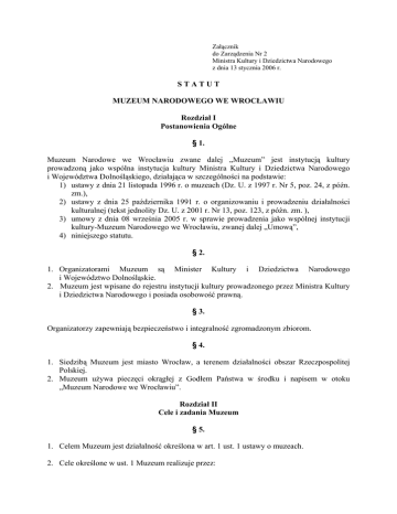 Załącznik do Zarządzenia Nr 2 Ministra Kultury i Dziedzictwa Narodowego z dnia 13 stycznia 2006 r. STATUT MUZEUM NARODOWEGO WE WROCŁAWIU Rozdział I Postanowienia Ogólne § 1. Muzeum Narodowe we Wrocławiu zwane dalej „Muzeum” jest instytucją kultury prowadzoną jako wspólna instytucja kultury Ministra Kultury i Dziedzictwa Narodowego i Województwa Dolnośląskiego, działająca w szczególności na podstawie: 1) ustawy z dnia 21 listopada 1996 r. o muzeach (Dz. U. z 1997 r. Nr 5, poz. 24, z późn. zm.), 2) ustawy z dnia 25 października 1991 r. o organizowaniu i prowadzeniu działalności kulturalnej (tekst jednolity Dz. U. z 2001 r. Nr 13, poz. 123, z późn. zm. ), 3) umowy z dnia 08 września 2005 r. w sprawie prowadzenia jako wspólnej instytucji kultury-Muzeum Narodowego we Wrocławiu, zwanej dalej „Umową”, 4) niniejszego statutu. § 2. 1. Organizatorami Muzeum są Minister Kultury i Dziedzictwa Narodowego i Województwo Dolnośląskie. 2. Muzeum jest wpisane do rejestru instytucji kultury prowadzonego przez Ministra Kultury i Dziedzictwa Narodowego i posiada osobowość prawną. § 3. Organizatorzy zapewniają bezpieczeństwo i integralność zgromadzonym zbiorom. § 4. 1. Siedzibą Muzeum jest miasto Wrocław, a terenem działalności obszar Rzeczpospolitej Polskiej. 2. Muzeum używa pieczęci okrągłej z Godłem Państwa w środku i napisem w otoku „Muzeum Narodowe we Wrocławiu”. Rozdział II Cele i zadania Muzeum § 5. 1. Celem Muzeum jest działalność określona w art. 1 ust. 1 ustawy o muzeach. 2. Cele określone w ust. 1 Muzeum realizuje przez: 1) gromadzenie, przechowywanie, konserwowanie i udostępnianie zabytków w zakresie sztuki, rzemiosła artystycznego, kultury technicznej i etnografii, oraz materiałów ikonograficznych i dokumentacyjnych, 2) prowadzenie działalności naukowo-badawczej, oświatowej i informacyjnej w zakresie objętym działalnością Muzeum w kraju i poza jego granicami, 3) współdziałanie w upowszechnianiu nauki i sztuki z instytucjami, organizacjami i stowarzyszeniami o podobnych celach, 4) przechowywanie zgromadzonych muzealiów w warunkach zapewniających im bezpieczeństwo i magazynowanie ich w sposób dostępny dla celów naukowych, 5) organizowanie ekspozycji stałych, wystaw czasowych w kraju i za granicą, 6) organizowanie i prowadzenie działalności dydaktycznej oraz kulturalno-oświatowej, 7) użyczanie muzealiów i przyjmowanie w depozyt zabytków zgodnie z obowiązującymi przepisami, 8) prowadzenie badań naukowych w zakresie sztuk plastycznych, kultury artystycznej i muzealnictwa oraz konserwacji zabytków, 9) opracowywanie, publikowanie i upowszechnianie katalogów zbiorów, przewodników wystaw, wyników badań oraz wydawnictw popularnonaukowych z zakresu swej działalności, 10) udostępnianie zbiorów dla celów naukowych i oświatowych, 11) prowadzenie biblioteki i archiwum, 12) opracowywanie ekspertyz i ocen oraz udzielanie informacji, porad i pomocy w zakresie swojej działalności, 13) prowadzenie działalności wydawniczej. Rozdział III Organizacja Muzeum § 6. Muzeum jest wielodziałowe i posiada następującą strukturę organizacyjną: 1) W pionie działalności podstawowej: a) Galeria Sztuki XII-XV w. b) Galeria Sztuki XVI-XIX w. c) Galeria Rzemiosł Artystycznych i Kultury Technicznej do XIX w. d) Dział Dokumentacji i Inwentaryzacji Zbiorów e) Dział Konserwacji f) Dział Oświatowy g) Dział Wydawnictw h) Biblioteka i) Gabinet Dokumentów j) Dział Kadr i Spraw Socjalnych k) Dział Administracyjno-Gospodarczy l) Dział Finansowo-Księgowy m) Dział Reklamy i Marketingu 2) W skład Muzeum wchodzą następujące oddziały: a) Oddział – Muzeum Panorama Racławicka b) Oddział – Muzeum Etnograficzne 3) W skład Muzeum wchodzą następujące oddziały w organizacji: a) Muzeum Sztuki Współczesnej b) Muzeum Sztuki Książki § 7. Organizację wewnętrzną Muzeum, zakres zadań komórek organizacyjnych oraz zakres działań oddziałów określa regulamin organizacyjny nadany przez Dyrektora Muzeum, po zasięgnięciu opinii Ministra Kultury i Dziedzictwa Narodowego, Województwa Dolnośląskiego oraz opinii działających w Muzeum organizacji związkowych i stowarzyszeń twórców. § 8. 1. Tworzenia, łączenia, przekształcenia i likwidacji działów i oddziałów Muzeum dokonuje Minister Kultury i Dziedzictwa Narodowego w uzgodnieniu z Województwem Dolnośląskim. 2. Tworzenie, łączenie, przekształcanie i likwidacja komórek organizacyjnych nie wymienionych w ust. 1 następuje na podstawie zarządzenia wydanego przez dyrektora Muzeum. Rozdział IV Nadzór i zarządzanie Muzeum § 9. Nadzór nad Muzeum sprawuje Minister Kultury i Dziedzictwa Narodowego. § 10. Na czele Muzeum stoi Dyrektor, którego powołuje i odwołuje Minister Kultury i Dziedzictwa Narodowego, w uzgodnieniu z Województwem Dolnośląskim, na zasadach i w trybie przewidzianym w obowiązujących przepisach i postanowieniach Umowy. § 11. 1. Dyrektor zarządza całokształtem działalności Muzeum, czuwa nad mieniem Muzeum i jest za nie odpowiedzialny. 2. Do zakresu działania dyrektora Muzeum należy w szczególności: 1) ogólne kierownictwo w sprawach działalności podstawowej i administracyjnej, 2) ogólny nadzór nad zbiorami ich ewidencjonowaniem oraz nad majątkiem Muzeum, 3) reprezentowanie Muzeum na zewnątrz, 4) przedstawianie właściwym instytucjom i organizatorom planów rzeczowych i finansowych, sprawozdań oraz wniosków inwestycyjnych, 5) naczelna redakcja wydawnictw muzealnych, 6) wydawanie w obowiązującym trybie regulaminów i zarządzeń, 7) sprawowanie ogólnego nadzoru nad kontrolą wewnętrzną, 8) zawieranie i rozwiązywanie umów o pracę z pracownikami Muzeum oraz podejmowanie decyzji wynikających ze stosunku pracy. 3. Dyrektor kieruje Muzeum przy pomocy zastępców, powoływanych i odwoływanych przez Dyrektora po uzgodnieniu ze współorganizatorami. Rozdział V Rada Muzeum § 12. 1. Prz