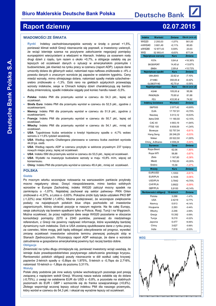 Biuro Maklerskie Deutsche Bank Polska Raport dzienny 02.07.2015 WIADOMOŚCI ZE ŚWIATA Deutsche Bank Polska S.A. Indeksy zachodnioeuropejskie wzrosły w środę o ponad +1,5%, ponieważ klimat wokół Grecji nieznacznie się poprawił, a inwestorzy uwierzyli, że wciąż istenieje szansa na pozytywne zakończenie negocjacji pomiędzy europejskimi wierzycielami a władzami w Atenach. Indeksy za oceanem rosły drugi dzień z rzędu, tym razem o około +0,7%, a obligacje osłabiły się po lepszych od oczekiwań danych o sytuacji w amerykańskim przemyśle i budownictwie, jak również na rynku pracy w czerwcu (raport ADP). Lepsze dane umocniły dolara do głównych walut, natomiast ropa naftowa zniżkowała o -4% z powodu danych o znacznym wzroście jej zapasów w ostatnim tygodniu. Ceny miedzi wzrosły, mimo silniejszego dolara, natomiast spadły metale szlachetne– srebro zniżkowało o -1,3%. Dziś rano na giełdach azjatyckich przeważają wzrosty indeksów, sesje w Chinach kolejny dzień charakteryzują się bardzo dużą zmiennością, spadki indeksów sięgały pod koniec handlu nawet -5,5%. Rynki Indeks Wartość Zmiana Obrót (m ln zł) WIG20 mWIG40 sWIG80 WIG 2 293,03 -1,07% 561,00 3 681,49 -0,11% 80,65 12 977,43 0,59% 23,03 52 993,41 Największe wzrosty -0,63% Kurs 677,04 Zmiana FOTA 0,64 zł +16.36% EKOEXPORT 14,45 zł +13.87% IDMSA 2,89 zł Kurs +10.73% Zmiana GRAJEWO 22,62 zł -7.10% ZYWIEC 350,00 zł -6.42% GLOBCITYHD Najaktywniejsi 42,70 zł Kurs Obrót (m ln zł) Największe spadki -5.09% KGHM 105,00 zł 95,96 PKNORLEN 70,60 zł 81,66 PZU 433,90 zł Wartość 74,92 Zmiana S&P500 2 077,42 +0,69% DJIA 17 757,91 +0,79% Nasdaq 5 013,12 +0,53% Xetra DAX 11 180,50 +2,15% CAC 40 4 883,19 +1,94% FTSE 100 6 608,59 +1,34% Bovespa 52 757,54 -0,61% Hang Seng 26 246,29 -0,03% Nikkei 20 522,50 +1,00% Chiny_ A-Shares 4 008,24 -5,60% Surowce Cena Zmiana Ropa Brent 62,06 -1,80% Ropa WTI 56,88 -3,67% Złoto 1 167,80 -0,38% Miedź 5 782,00 +0,35% a Polska: Indeks PMI dla przemysłu wzrósł w czerwcu do 54,3 pkt., lepiej od oczekiwań. Strefa Euro: Indeks PMI dla przemysłu wyniósł w czerwcu do 52,5 pkt., zgodnie z oczekiwaniami. Niemcy: Indeks PMI dla przemysłu wyniósł w czerwcu do 51,9 pkt., zgodnie z oczekiwaniami. Francja: Indeks PMI dla przemysłu wyniósł w czerwcu do 50,7 pkt., lepiej od oczekiwań. Włochy: Indeks PMI dla przemysłu wyniósł w czerwcu do 54,1 pkt., mniej od oczekiwań. USA: Tygodniowa liczba wniosków o kredyt hipoteczny spadła o -4,7% wobec wzrostu o +1,6% tydzień wcześniej. USA: Według raportu Challengera planowana w czerwcu liczba zwolnień wyniosła 44,8 tys. osób. USA: Według raportu ADP w czerwcu przybyło w sektorze prywatnym 237 tysięcy nowych miejsc pracy, lepiej od oczekiwań. USA: Indeks ISM dla przemysłu wzrósł w czerwcu do 53,5 pkt., lepiej od oczekiwań. USA: Wydatki na inwestycje budowlane wzrosły w maju +0,8% m/m, więcej od konsensusu. Chiny: Indeks PMI dla przemysłu wyniósł w czerwcu 49,4 pkt., mniej od oczekiwań. Indeksy światowe Srebro 15,58 -1,27% Waluty Kurs Zmiana EUR/USD 1,1053 -0,81% EUR/PLN 4,1836 -0,06% USD/PLN 3,7842 +0,75% CHF/PLN 3,9922 -0,59% GBP/PLN 5,9100 +0,14% Rentowności obligacji 10-letnich Zmiana POLSKA Giełda Po mocnym wtorku wczorajsze notowania na warszawskim parkiecie przybrały mocno negatywny obraz. Dosyć niespodziewanie, mimo bardzo solidnych wzrostów w Europie Zachodniej, indeks WIG20 zaliczył mocny spadek na zamknięciu o -1,07%. Najsłabiej zachował się sektor paliwowy- PKN Orlen zniżkował o -4,37%, a Lotos o -3,63%. Pokaźne zniżki były także udziałem PKO BP (-1,22%) oraz KGHM (-1,45%). Można podejrzewać, że wczorajsze zwiększenie podaży na największych polskich blue chips pochodziło od inwestorów zagranicznych, którzy skracali pozycje w naszym regionie. Na tle całej Europy, sesje zakończyły się bowiem spadkami tylko w Polsce, Rosji, Turcji i na Węgrzech. Można oczekiwać, że przez najbliższe dwie sesje WIG20 pozostanie w obszarze konsolidacji pomiędzy 2270 a 2340 punktów, ponieważ do niedzielnego referendum, z Grecji nie powinny napływać informacje, które wywołałyby bardziej dynamiczny ruch indeksów. Dziś w USA zostaną opublikowane dane z rynku pracy za czerwiec, które mogą, jeśli będą odbiegać zdecydowanie od prognoz, wywołać zmianę oczekiwań inwestorów odnośnie terminu pierwszej podwyzki stóp w Stanach Zjednoczonych. Wczorajszy raport ADP wskazuje, że dane o wzroście zatrudnienia w gospodarce amerykańskiej powinny być raczej bardzo dobre. Obligacje Zmienność na rynku długu zmniejszyła się, ponieważ inwestorzy wciąż uważają, że istnieje duże prawdopodobieństwo pozytywnego zakończenia greckiego kryzysu. Rentowności polskich obligacji poszły nieznacznie w dół wzdłuż całej krzywej: papierów 2-letnich spadły o -0,8bps do 1,975%, 5-letnich o -0,7bps do 2,716%, natomiast 10-letnich o -1,8bps do poziomu 3,311%. Waluty Polski złoty podobnie jak inne waluty rynków wschodzących pozostaje pod presją związaną z napięciem wokół Grecji. Wczoraj nasza waluta osłabiła się do dolara (-0,75%), z uwagi na osłabienie EUR do USD o -0,8%, a pozostała na stabilnych poziomach do EUR i GBP i wzmocniła się do franka szwajcarskiego (+0,6%). Złotego wspomógł wczoraj lepszy odczyt indeksu PMI dla naszego przemysłu, który wzrósł w czerwcu do 54,3 pkt. i okazał się wyraźnie lepszy od oczekiwań. Polska 3.288 -1.47% USA 2.4219 +2.77% Niemcy 0.813 +6.14% Hiszpania 2.263 -0.44% Włochy 2.246 -2.69% Grecja 15.392 -0.09% Turcja 9.210 +0.22% Japonia 0.477 +6.95% Chiny 3.627 -0.06% Indie 7.818 -0.53% WIG WIG (54,034.66, 54,160.75, 53,115.11, 53,203.70, -730.332) 58000 57500 57000 56500 56000 55500 55000 54500 54000 53500 53000 52500 52000 51500 51000 50500 50000 49500 49000 16 23 30 7 July 14 21 28 4 11 18 August 25 1 8 15 September 22 29 6 13 October 20 27 3 10 17 November 24 1 8 15 December 22 5 12 2015 19 26 2 9 16 Februar