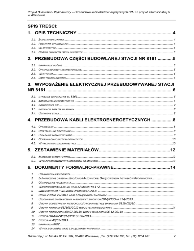 Projekt Budowlano- Wykonawczy – Przebudowa kabli elektroenergetycznych SN i nn przy ul. Starościńskiej 5 w Warszawie. SPIS TREŚCI: 1. OPIS TECHNICZNY ............................................................................ 4 1.1. 1.2. 1.3. 1.4. ZAKRES OPRACOWANIA .............................................................................................................................. 4 PODSTAWA OPRACOWANIA ......................................................................................................................... 4 CEL INWESTYCJI ........................................................................................................................................ 5 OGÓLNA CHARAKTERYSTYKA INWESTYCJI ......................................................................................................... 5 2. PRZEBUDOWA CZĘŚCI BUDOWLANEJ STACJI NR 8161 ............ 5 2.1. 2.2. 2.3. 2.4. INFORMACJE OGÓLNE ................................................................................................................................ 5 OPIS PRZEBUDOWY ARCHITEKTONICZNEJ ......................................................................................................... 5 WENTYLACJA ........................................................................................................................................... 6 DANE TECHNOLOGICZNE: ............................................................................................................................ 6 3. WYPOSAŻENIE ELEKTRYCZNEJ PRZEBUDOWYWANEJ STACJI NR 8161 ..................................................................................................... 6 3.1. 3.1. 3.2. 3.3. 3.4. ISTNIEJĄCE WYPOSAŻENIE ST. 8161............................................................................................................... 6 KOMORA TRANSFORMATOROWA .................................................................................................................. 6 ROZDZIELNICA NN .................................................................................................................................... 7 INSTALACJA POTRZEB WŁASNYCH .................................................................................................................. 8 UZIEMIENIE STACJI .................................................................................................................................... 8 4. PRZEBUDOWA KABLI ELEKTROENERGETYCZNYCH ................. 8 4.1. 4.2. 4.3. 4.4. 4.5. OPIS OGÓLNY .......................................................................................................................................... 8 OPIS TRASY LINII DOCELOWYCH ..................................................................................................................... 8 UKŁADANIE KABLA W WYKOPIE ..................................................................................................................... 9 OCHRONA OD PORAŻEŃ ELEKTRYCZNYCH........................................................................................................10 WYTYCZNE REALIZACJI INWESTYCJI ...............................................................................................................10 5. ZESTAWIENIE MATERIAŁÓW .........................................................12 5.1. MATERIAŁY DEMONTOWANE. .....................................................................................................................12 5.2. WYKAZ PODSTAWOWYCH MATERIAŁÓW DO MONTAŻU. .....................................................................................13 6. DOKUMENTY FORMALNO-PRAWNE .............................................14 1 2 3 4 5 6 7 8 9 10 11 12 13 14 UPRAWNIENIA PROJEKTANTA. ........................................................................................................................ ZAŚWIADCZENIE O PRZYNALEŻNOŚCI DO MAZOWIECKIEJ OKRĘGOWEJ I ZBY INŻYNIERÓW BUDOWNICTWA. ......................... OŚWIADCZENIE PROJEKTANTA ........................................................................................................................ WARUNKI USUNIĘCIA KOLIZJI WRAZ Z ANEKSEM NR 1 I 2. ...................................................................................... INWENTARYZACJA RWE STOEN OPERATOR SP. Z O.O. ......................................................................................... OPINIA ZUD NR 79/2012 WRAZ Z ZAŁĄCZNIKIEM MAPOWYM ............................................................................... UZGODNIENIE ZABEZPIECZENIA KABLI OŚWIETLENIOWYCH ZDM/ZTSO NR 154/2013 ................................................ UMOWA UDOSTĘPNIENIA NIERUCHOMOŚCI POD INWESTYCJĘ LINIOWĄ NR 531U/13/SD ............................................. UMOWA NAJMU NR 55/103/2012 WRAZ Z PEŁNOMOCNICTWAMI .....................................................................14 UMOWA NAJMU Z DNIA 09.07.2013R. WRAZ Z CESJĄ Z DNIA 06.12.2011R. ........................................................... DECYZJA ZDM/DZWD/M/POST/180/2013 ................................................................................................. DECYZJA NR 40/07/2013............................................................................................................................ INFORMACJA BIOZ ..................................................................................................................................... WYPISY Z GRUNTÓW WRAZ Z ZAŁĄCZNIKIEM MAPOWYM ....................................................................................... Gridnet Sp.j. ul. Mińska 65 lok. 204, 03-828 Warszawa, ,Tel. (22)1234 100, fax. (22) 1234 101 2 Projekt Budowlano- Wykonawczy – Przebudowa kabli elektroenergetycznych SN i nn przy ul. Starościńskiej 5 w Warszawie. 7. RYSUNKI: .............................................................................................. 1 2 3 4 5 6 7 8 9 10 11 12 13 RYS. E-1 – PROJ