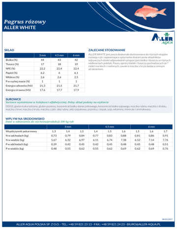 Pagrus rózowy ALLER WHITE SKLAD ZALECANE STOSOWANIE Bialko (%) Tluszcz (%) NFE (%) Popiól (%) Wlókno (%) P w suchej masie (%) Energia calkowita (MJ) Energia strawna (MJ) 3 mm 4.5 mm 6 mm 44 17 22,2 6,2 2,6 1 21,3 17,6 43 18 22,4 6 2,6 1 21,5 17,7 42 19 22,4 6,1 2,5 1 21,7 17,9 ALLER WHITE jest pasza doskonale dostosowana do róznych etapów rozwoju ryb i zapewniajaca optymalne dostarczenie skladników odzywczych dzieki odpowiednim proporcjom bialka i tluszczu w róznych wielkosciach peletek. Pasza, oprócz bialek i tluszczy pochodzacych ze ? ródel morskich i roslinnych, zawiera maczke z kryla bedaca cennym atraktantem. SUROWCE Surowce wymienione w kolejnosci alfabetycznej. Pelny sklad podany na etykiecie DDGS, gluten kukurydziany, gluten pszenny, koncentrat bialka slonecznikowego, koncentrat bialka sojowego, maczka rybna, maczka z drobiu, maczka z krwi, maczka z kryla, maczka z piór, olej rybny, olej rzepakowy, pszenica, rzepak, soja, witaminy, mineraly i aminokwasy. WPLYW NA SRODOWISKO Dane w odniesieniu do wychowu/produkcji 100 kg ryb 3 mm Wspólczynnik pokarmowy N w odchodach (kg) N w wodzie (kg) P w odchodach (kg) P w wodzie (kg) 1,3 0,73 5,67 0,39 0,48 1,4 0,79 6,32 0,42 0,55 4.5 mm 1,5 0,84 6,97 0,45 0,62 1,4 0,77 6,11 0,42 0,55 1,5 0,83 6,74 0,45 0,62 6 mm 1,6 0,88 7,38 0,48 0,69 1,5 0,81 6,52 0,45 0,62 1,6 0,86 7,14 0,48 0,69 1,7 0,91 7,76 0,51 0,76 08/03/2017 ALLER AQUA POLSKA SP. Z O.O. - TEL.: +48 59 821 23 13 - FAX.: +48 59 821 24 23 - [email protected]