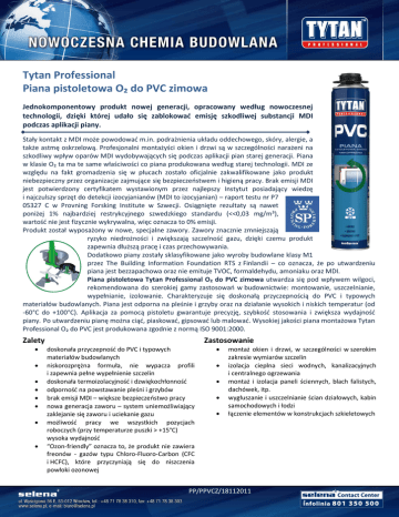 Tytan Professional Piana pistoletowa O₂ do PVC zimowa Jednokomponentowy produkt nowej generacji, opracowany według nowoczesnej technologii, dzięki której udało się zablokowad emisję szkodliwej substancji MDI podczas aplikacji piany. Stały kontakt z MDI może powodowad m.in. podrażnienia układu oddechowego, skóry, alergie, a także astmę oskrzelową. Profesjonalni montażyści okien i drzwi są w szczególności narażeni na szkodliwy wpływ oparów MDI wydobywających się podczas aplikacji pian starej generacji. Piana w klasie O₂ ta ma te same właściwości co piana produkowana według starej technologii. MDI ze względu na fakt gromadzenia się w płucach zostało oficjalnie zakwalifikowane jako produkt niebezpieczny przez organizacje zajmujące się bezpieczeostwem i higieną pracy. Brak emisji MDI jest potwierdzony certyfikatem wystawionym przez najlepszy Instytut posiadający wiedzę i najczulszy sprzęt do detekcji izocyjanianów (MDI to izocyjanian) – raport testu nr P7 05327 C w Provning Forsking Institute w Szwecji. Osiągnięte rezultaty są nawet poniżej 1% najbardziej restrykcyjnego szwedzkiego standardu (<<0,03 mg/m³), wartośd nie jest fizycznie wykrywalna, więc oznacza to 0% emisji. Produkt został wyposażony w nowe, specjalne zawory. Zawory znacznie zmniejszają ryzyko niedrożności i zwiększają szczelnośd gazu, dzięki czemu produkt zapewnia dłuższą pracę i czas przechowywania. Dodatkowo piany zostały sklasyfikowane jako wyroby budowlane klasy M1 przez The Building Information Foundation RTS z Finlandii – co oznacza, że po utwardzeniu piana jest bezzapachowa oraz nie emituje TVOC, formaldehydu, amoniaku oraz MDI. Piana pistoletowa Tytan Professional O₂ do PVC zimowa utwardza się pod wpływem wilgoci, rekomendowana do szerokiej gamy zastosowao w budownictwie: montowanie, uszczelnianie, wypełnianie, izolowanie. Charakteryzuje się doskonałą przyczepnością do PVC i typowych materiałów budowlanych. Piana jest odporna na pleśnie i grzyby oraz na działanie wysokich i niskich temperatur (od -60°C do +100°C). Aplikacja za pomocą pistoletu gwarantuje precyzję, szybkośd stosowania i zwiększa wydajnośd piany. Po utwardzeniu pianę można ciąd, piaskowad, gipsowad lub malowad. Wysokiej jakości piana montażowa Tytan Professional O₂ do PVC jest produkowana zgodnie z normą ISO 9001:2000. Zalety Zastosowanie doskonała przyczepnośd do PVC i typowych materiałów budowlanych niskorozprężna formuła, nie wypacza profili i zapewnia pełne wypełnienie szczelin doskonała termoizolacyjnośd i dzwiękochłonnośd odpornośd na powstawanie pleśni i grzybów brak emisji MDI – większe bezpieczeostwo pracy nowa generacja zaworu – system uniemożliwiający zaklejanie się zaworu i uciekanie gazu możliwośd pracy we wszystkich pozycjach roboczych (przy temperaturze puszki > +15°C) wysoka wydajnośd “Ozon-friendly” oznacza to, że produkt nie zawiera freonów - gazów typu Chloro-Fluoro-Carbon (CFC i HCFC), które przyczyniają się do niszczenia powłoki ozonowej montaż okien i drzwi, w szczególności w szerokim zakresie wymiarów szczelin izolacja cieplna sieci wodnych, kanalizacyjnych i centralnego ogrzewania montaż i izolacja paneli ściennych, blach falistych, dachówek, itp. wygłuszanie i uszczelnianie ścian działowych, kabin samochodowych i łodzi łączenie elementów w konstrukcjach szkieletowych PP/PPVCZ/18112011 DANE TECHNICZNE Kolor Temperatura aplikacji Temperatura puszki Post ekspansja Czas kożuszenia Czas wstępnej obróbki Czas pełnego utwardzenia Odpornośd termiczna (po utwardzeniu) Stabilnośd wymiarów (kurczliwośd) Nasiąkliwośd wodą po 24 h przy częściowym, zanurzeniu bez naskórka Przyczepnośd do PVC Współczynnik przewodzenia ciepła Klasa palności Rozpuszczalniki (przed utwardzeniem) Wydajnośd * PARAMETR jasnożółty od -10°C do +30°C od 0°C do +30°C 90-120% ≤10 min ≤40 min 24 h -60°C do +100°C ≤3% STANDARDY/WARUNKI - ≤1 *kg/m2] PN-EN ISO 1609:1999 Wewnętrzne standardy +23°C, 50% RH +23°C, 50% RH +23°C, 50% RH Wewnętrzne standardy ≥50 KPa ≤0,034 W/mK F/B3 Czyścik Tytan Professional 45 - 50 l PN-EN 1607:1999 (próbka o wymiarach (60x60x20) mm PN-EN 12667:2002 EN 13 501 / DIN 4102-1 Wewnętrzne standardy; 750 ml * maksymalna wydajnośd metodą wolnego spieniania mierzona w optymalnych warunkach (EN 291). Rezultat koocowy w dużej mierze zależy od ilości straconej piany (nadmierna aplikacja), temperatury puszki, aplikacji, powierzchni, jakości użytego sprzętu oraz umiejętności osoby, która wypuszcza pianę. SPOSÓB UŻYCIA Przygotowanie powierzchnia musi byd oczyszczona i odtłuszczona. Puszka powinna byd doprowadzona do temperatury pokojowej (np. poprzez zanurzenie w ciepłej wodzie). Uwaga! Nie używad gorącej lub gotującej się wody. Przed użyciem wstrząsnąd energicznie puszką kilka razy. Założyd rękawiczki ochronne, usunąd nasadkę ochronną i przykręcid puszkę z pianą do adaptora pistoletu. Aplikacja podczas aplikacji puszka musi się znajdowad w pozycji “do góry dnem”. Wypełniad szczeliny w ok. 50% (po aplikacji piana zwiększa swoją objętośd). Po utwardzeniu nadmiar piany usunąd mechanicznie (np. nożem). Po pełnym utwardzeniu pianę zabezpieczyd przed działaniem promieni UV pokrywając ją farbą, tynkiem, akrylem lub silikonem. Jeśli pracę przerywa się na dłużej niż 5 minut dyszę aplikatora ze świeżą pianą należy wyczyścid czyścikiem do pian poliuretanowych oraz wstrząsnąd puszkę przed ponowną aplikacją. W przypadku odkręcenia aplikatora z puszki także zawór należy oczyścid czyścikiem. Wstrząsnąd przed kolejnym użyciem. W niższych temperaturach zaleca się pozostawienie zaaplikowanej piany aż do pełnego utwardzenia (za szybkie cięcie lub obróbka piany może spowodowad nieodwracalne zmiany w strukturze piany i pogorszenie się jej parametrów użytkowych). świeżą pianę można usunąd cz