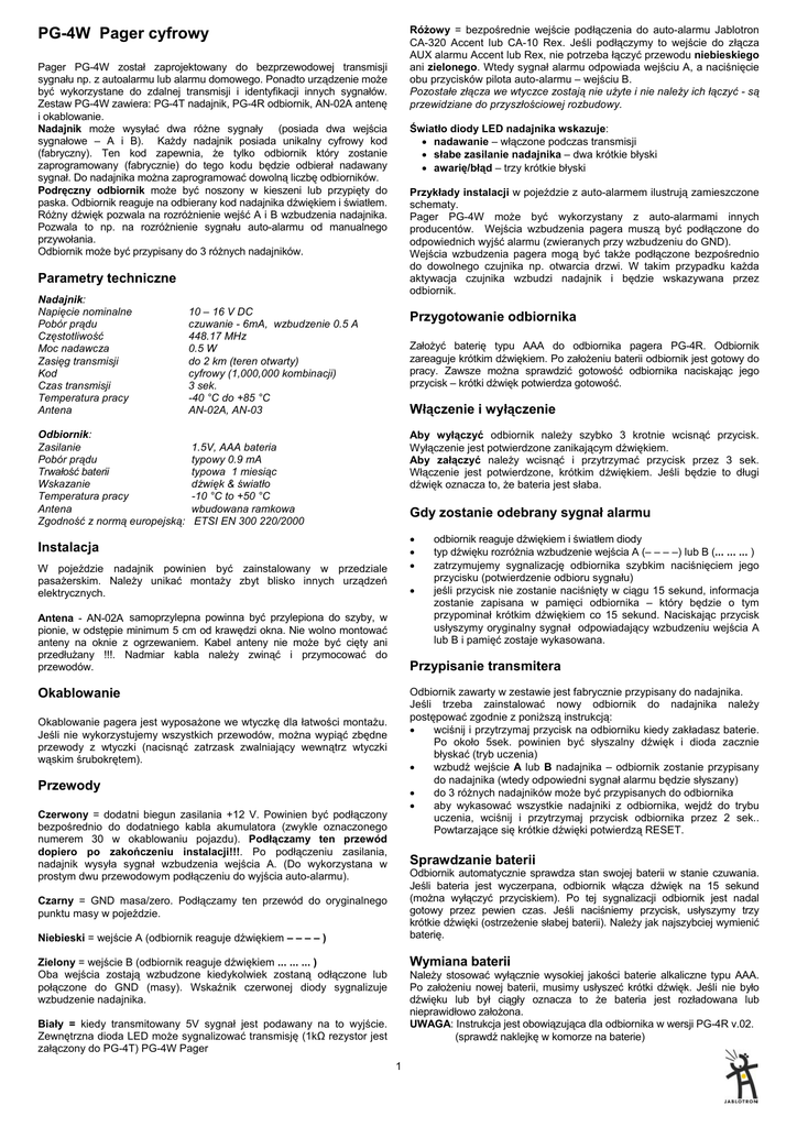 Różowy = bezpośrednie wejście podłączenia do auto-alarmu Jablotron CA-320 Accent lub CA-10 Rex. Jeśli podłączymy to wejście do złącza AUX alarmu Accent lub Rex, nie potrzeba łączyć przewodu niebieskiego ani zielonego. Wtedy sygnał alarmu odpowiada wejściu A, a naciśnięcie obu przycisków pilota auto-alarmu – wejściu B. Pozostałe złącza we wtyczce zostają nie użyte i nie należy ich łączyć - są przewidziane do przyszłościowej rozbudowy. PG-4W Pager cyfrowy Pager PG-4W został zaprojektowany do bezprzewodowej transmisji sygnału np. z autoalarmu lub alarmu domowego. Ponadto urządzenie może być wykorzystane do zdalnej transmisji i identyfikacji innych sygnałów. Zestaw PG-4W zawiera: PG-4T nadajnik, PG-4R odbiornik, AN-02A antenę i okablowanie. Nadajnik może wysyłać dwa różne sygnały (posiada dwa wejścia sygnałowe – A i B). Każdy nadajnik posiada unikalny cyfrowy kod (fabryczny). Ten kod zapewnia, że tylko odbiornik który zostanie zaprogramowany (fabrycznie) do tego kodu będzie odbierał nadawany sygnał. Do nadajnika można zaprogramować dowolną liczbę odbiorników. Podręczny odbiornik może być noszony w kieszeni lub przypięty do paska. Odbiornik reaguje na odbierany kod nadajnika dźwiękiem i światłem. Różny dźwięk pozwala na rozróżnienie wejść A i B wzbudzenia nadajnika. Pozwala to np. na rozróżnienie sygnału auto-alarmu od manualnego przywołania. Odbiornik może być przypisany do 3 różnych nadajników. Światło diody LED nadajnika wskazuje: • nadawanie – włączone podczas transmisji • słabe zasilanie nadajnika – dwa krótkie błyski • awarię/błąd – trzy krótkie błyski Przykłady instalacji w pojeździe z auto-alarmem ilustrują zamieszczone schematy. Pager PG-4W może być wykorzystany z auto-alarmami innych producentów. Wejścia wzbudzenia pagera muszą być podłączone do odpowiednich wyjść alarmu (zwieranych przy wzbudzeniu do GND). Wejścia wzbudzenia pagera mogą być także podłączone bezpośrednio do dowolnego czujnika np. otwarcia drzwi. W takim przypadku każda aktywacja czujnika wzbudzi nadajnik i będzie wskazywana przez odbiornik. Parametry techniczne Nadajnik: Napięcie nominalne Pobór prądu Częstotliwość Moc nadawcza Zasięg transmisji Kod Czas transmisji Temperatura pracy Antena 10 – 16 V DC czuwanie - 6mA, wzbudzenie 0.5 A 448.17 MHz 0.5 W do 2 km (teren otwarty) cyfrowy (1,000,000 kombinacji) 3 sek. -40 °C do +85 °C AN-02A, AN-03 Odbiornik: Zasilanie Pobór prądu Trwałość baterii Wskazanie Temperatura pracy Antena Zgodność z normą europejską: 1.5V, AAA bateria typowy 0.9 mA typowa 1 miesiąc dźwięk & światło -10 °C to +50 °C wbudowana ramkowa ETSI EN 300 220/2000 Przygotowanie odbiornika Założyć baterię typu AAA do odbiornika pagera PG-4R. Odbiornik zareaguje krótkim dźwiękiem. Po założeniu baterii odbiornik jest gotowy do pracy. Zawsze można sprawdzić gotowość odbiornika naciskając jego przycisk – krótki dźwięk potwierdza gotowość. Włączenie i wyłączenie Aby wyłączyć odbiornik należy szybko 3 krotnie wcisnąć przycisk. Wyłączenie jest potwierdzone zanikającym dźwiękiem. Aby załączyć należy wcisnąć i przytrzymać przycisk przez 3 sek. Włączenie jest potwierdzone, krótkim dźwiękiem. Jeśli będzie to długi dźwięk oznacza to, że bateria jest słaba. Gdy zostanie odebrany sygnał alarmu • • • Instalacja W pojeździe nadajnik powinien być zainstalowany w przedziale pasażerskim. Należy unikać montaży zbyt blisko innych urządzeń elektrycznych. • Antena - AN-02A samoprzylepna powinna być przylepiona do szyby, w pionie, w odstępie minimum 5 cm od krawędzi okna. Nie wolno montować anteny na oknie z ogrzewaniem. Kabel anteny nie może być cięty ani przedłużany !!!. Nadmiar kabla należy zwinąć i przymocować do przewodów. odbiornik reaguje dźwiękiem i światłem diody typ dźwięku rozróżnia wzbudzenie wejścia A (– – – –) lub B (... ... ... ) zatrzymujemy sygnalizację odbiornika szybkim naciśnięciem jego przycisku (potwierdzenie odbioru sygnału) jeśli przycisk nie zostanie naciśnięty w ciągu 15 sekund, informacja zostanie zapisana w pamięci odbiornika – który będzie o tym przypominał krótkim dźwiękiem co 15 sekund. Naciskając przycisk usłyszymy oryginalny sygnał odpowiadający wzbudzeniu wejścia A lub B i pamięć zostaje wykasowana. Przypisanie transmitera Okablowanie Odbiornik zawarty w zestawie jest fabrycznie przypisany do nadajnika. Jeśli trzeba zainstalować nowy odbiornik do nadajnika należy postępować zgodnie z poniższą instrukcją: • wciśnij i przytrzymaj przycisk na odbiorniku kiedy zakładasz baterie. Po około 5sek. powinien być słyszalny dźwięk i dioda zacznie błyskać (tryb uczenia) • wzbudź wejście A lub B nadajnika – odbiornik zostanie przypisany do nadajnika (wtedy odpowiedni sygnał alarmu będzie słyszany) • do 3 różnych nadajników może być przypisanych do odbiornika • aby wykasować wszystkie nadajniki z odbiornika, wejdź do trybu uczenia, wciśnij i przytrzymaj przycisk odbiornika przez 2 sek.. Powtarzające się krótkie dźwięki potwierdzą RESET. Okablowanie pagera jest wyposażone we wtyczkę dla łatwości montażu. Jeśli nie wykorzystujemy wszystkich przewodów, można wypiąć zbędne przewody z wtyczki (nacisnąć zatrzask zwalniający wewnątrz wtyczki wąskim śrubokrętem). Przewody Czerwony = dodatni biegun zasilania +12 V. Powinien być podłączony bezpośrednio do dodatniego kabla akumulatora (zwykle oznaczonego numerem 30 w okablowaniu pojazdu). Podłączamy ten przewód dopiero po zakończeniu instalacji!!!. Po podłączeniu zasilania, nadajnik wysyła sygnał wzbudzenia wejścia A. (Do wykorzystana w prostym dwu przewodowym podłączeniu do wyjścia auto-alarmu). Sprawdzanie baterii Odbiornik automatycznie sprawdza stan swojej baterii w stanie czuwania. Jeśli bateria jest wycz