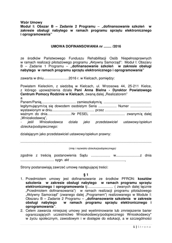 Wzór Umowy Moduł I: Obszar B – Zadanie 2 Programu – „dofinansowanie szkoleń w zakresie obsługi nabytego w ramach programu sprzętu elektronicznego i oprogramowania” UMOWA DOFINANSOWANIA nr ........ /2016 ze środków Państwowego Funduszu Rehabilitacji Osób Niepełnosprawnych w ramach realizacji pilotażowego programu „Aktywny Samorząd”: Moduł I: Obszaru B – Zadanie 1 Programu – „dofinansowanie szkoleń w zakresie obsługi nabytego w ramach programu sprzętu elektronicznego i oprogramowania” zawarta w dniu..........................2016 r. w Kielcach, pomiędzy: Powiatem Kieleckim, z siedzibą w Kielcach, ul. Wrzosowa 44, 25-211 Kielce, z którego upoważnienia działa Pani Anna Bielna - Dyrektor Powiatowego Centrum Pomocy Rodzinie w Kielcach, zwaną dalej „Realizatorem” a Panem/Panią.................................... zamieszkałym/ą. ................................................. legitymującym/cą się dowodem osobistym Seria ................... Numer ...................... wystawionym w dniu............................................ przez ………………………………… ważnym do dnia…………………Nr PESEL .................................... zwanym/ą dalej „Wnioskodawcą”, Wnioskodawca działa jako przedstawiciel ustawowy/opiekun jeśli dziecka/podopiecznego: działającym jako przedstawiciel ustawowy/opiekun prawny: ........................................................................................................................................ (imię i nazwisko dziecka/podopiecznego) zgodnie z treścią postanowienia Sądu .................... w.........................z dnia ................................... sygn. akt ........................................................., Strony postanawiają zawrzeć umowę następującej treści: §1 1. Przedmiotem umowy jest dofinansowanie ze środków PFRON: kosztów szkolenia w zakresie obsługi nabytego w ramach programu sprzętu elektronicznego i oprogramowania tj:.......................... ( zwanych dalej łącznie „Przedmiotem dofinansowania”) w ramach realizacji programu pilotażowego „Aktywny Samorząd” (zwanego dalej „Programem”) realizowanego w Module I: Obszaru B – Zadanie 2 Programu – „dofinansowanie szkolenia w zakresie obsługi nabytego w ramach programu sprzętu elektronicznego i oprogramowania”. 2. Celem zawarcia niniejszej umowy jest wyeliminowanie lub zmniejszenie barier ograniczających uczestnictwo Wnioskodawcy/podopiecznego Wnioskodawcy* w życiu społecznym, zawodowym i w dostępie do edukacji, a w szczególności 1|Strona przygotowanie beneficjentów programu z zaburzeniami ruchu i percepcji wzrokowej do pełnienia różnych ról społecznych poprzez umożliwienie im włączenia się do tworzącego się społeczeństwa informacyjnego. 3. Podopiecznym Wnioskodawcy w rozumieniu niniejszej umowy jest……………… ……………………..- niepełnoletnia osoba niepełnosprawna będąca synem /córką Wnioskodawcy / osoba niepełnosprawna ubezwłasnowolniona, której Wnioskodawca jest opiekunem prawnym. 4. Wnioskodawca oświadcza, iż znane są mu zapisy programu i procedur, dostępne na stronie internetowej: www.pcpr.powiat.kielce.pl, które przyjmuje do wiadomości i stosowania oraz że: 1) posiada pełną zdolność do czynności prawnych oraz potwierdza, że wszystkie informacje zawarte we wniosku o dofinansowanie i w załącznikach do tego wniosku, są zgodne ze stanem faktycznym, 2) na dzień zawarcia umowy Wnioskodawca/podopieczny Wnioskodawcy* spełnia warunki uczestnictwa w programie, 3) Wnioskodawca/podopieczny Wnioskodawcy* nie otrzymał na podstawie odrębnych wniosków w br. dofinansowania, dotacji lub refundacji ze środków PFRON na cele objęte niniejszą umową, 4) Wnioskodawca/podopieczny Wnioskodawcy nie ubiega się i nie będzie w danym roku ubiegał się odrębnym wnioskiem o środki PFRON na ten sam cel finansowany ze środków PFRON – za pośrednictwem innego Realizatora (na terenie innego samorządu powiatowego), 5) Wnioskodawca/podopieczny Wnioskodawcy* nie posiada wymagalnych zobowiązań wobec PFRON i Realizatora, 6) w ciągu ostatnich 3 lat licząc od początku roku następującego po roku w którym udzielono pomocy Wnioskodawca/podopieczny Wnioskodawcy* nie korzystał ze środków PFRON na cel określony niniejszą umową oraz nie był stroną umowy zawartej z PFRON i rozwiązanej z przyczyn leżących po jego stronie. Niniejszy warunek określa się zgodnie z pkt 19 lit. a) „Kierunków działań oraz warunków brzegowych obowiązujących realizatorów pilotażowego programu „Aktywny Samorząd” w 2016 roku” (dostępne na stronie www.pcpr.powiat.kielce.pl), 7) zapoznał się z treścią niniejszej umowy, w tym z prawami i obowiązkami wynikającymi z otrzymania dofinansowania ze środków PFRON oraz sankcjami z tytułu niedotrzymania warunków umowy, które przyjmuje do wiadomości i stosowania, 8) przyjmuje do wiadomości i stosowania, że uzyskane środki są środkami publicznymi, w związku z czym podlegają szczególnej kontroli, a także zabezpieczeniu w sytuacji, gdy łączną wartość uzyskanego w danym roku dofinansowania w ramach programu przekracza kwotę 10.000 zł (dziesięć tysięcy złotych). 5. Wnioskodawca jest zobowiązany do: 1) wykorzystania środków dofinansowania zgodnie z przeznaczeniem, 2) umożliwienia PFRON i Realizatorowi przeprowadzenia kontroli, 3) przekazywania na każde wezwanie Realizatora lub PFRON informacji dotyczących efektów udzielonego wsparcia, odzwierciedlającej stan faktyczny oraz innych informacji związanych z uczestnictwem w programie, 2|Strona 4) niezwłocznego zawiadomienia Powiatu o wszelkich zmianach mających wpływ na realizację umowy np. o zmianie nazwiska, adresu zamieszkania, utracie przedmiotu dofinansowania, 5) zwrotu środków finansowych w przypadkach określonych w niniejszej umowie, 6) dostarczenia do Realizatora: a. pisemnego