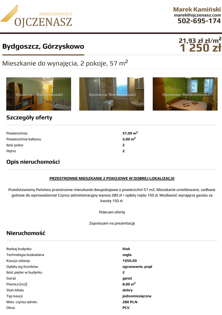 Marek Kamiński [email protected] 502-695-174 21,93 zł zł/m2 1 250 zł Bydgoszcz, Górzyskowo Mieszkanie do wynajęcia, 2 pokoje, 57 m2 Szczegóły oferty Powierzchnia 57,00 m2 Powierzchnia balkonu 2,00 m2 Ilość pokoi 2 Piętro 2 Opis nieruchomości PRZESTRONNE MIESZKANIE 2 POKOJOWE W DOBREJ LOKALIZACJI! Przedstawiamy Państwu przestronne mieszkanie dwupokojowe o powierzchni 57 m2. Mieszkanie umeblowane, zadbane gotowe do wprowadzenia! Czynsz administracyjny wynosi 280 zł + opłaty rzędu 150 zł. Możliwość wynajęcia garażu za kwotę 150 zł. Polecam ofertę Zapraszam na prezentację Nieruchomość Rodzaj budynku blok Technologia budowlana cegła Kaucja zabezp. 1650,00 Opłaty wg liczników ogrzewanie, prąd Ilość pięter w budynku 2 Garaż garaż Piwnica [m2] 8,00 m2 Stan lokalu dobry Typ kaucji jednomiesięczna Mies. czynsz admin. 280 PLN Okna PCV Balkon loggia Ilość balkonów 1 Widok lng_na_podworko Gaz jest Dojazd asfalt Otoczenie działki zabudowane Ogrzewanie miejskie Usytuowanie dwustronne