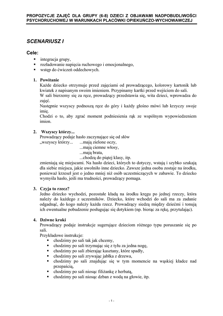 PROPOZYCJE ZAJĘĆ DLA GRUPY (6-8) DZIECI Z OBJAWAMI NADPOBUDLIWOŚCI PSYCHORUCHOWEJ W WARUNKACH PLACÓWKI OPIEKUŃCZO-WYCHOWAWCZEJ SCENARIUSZ I Cele: integracja grupy, rozładowanie napięcia ruchowego i emocjonalnego, wstęp do ćwiczeń oddechowych. 1. Powitanie Każde dziecko otrzymuje przed zajęciami od prowadzącego, kolorowy kartonik lub kwiatek z napisanym swoim imieniem. Przypinamy kartki przed wejściem do sali. W sali bierzemy się za ręce, prowadzący przedstawia się, wita dzieci, wprowadza do zajęć. Następnie wszyscy podnoszą ręce do góry i każdy głośno mówi lub krzyczy swoje imię. Chodzi o to, aby zgrać moment podniesienia rąk ze wspólnym wypowiedzeniem imion. 2. Wszyscy którzy... Prowadzący podaje hasło zaczynające się od słów „wszyscy którzy... ...mają zielone oczy, ...mają ciemne włosy, ...mają brata, ...chodzą do piątej klasy, itp. zmieniają się miejscami. Na hasło dzieci, których to dotyczy, wstają i szybko szukają dla siebie miejsca, jakie uwolniło inne dziecko. Zawsze jedna osoba zostaje na środku, ponieważ krzeseł jest o jedno mniej niż osób uczestniczących w zabawie. To dziecko wymyśla hasło, jeśli ma trudności, prowadzący pomaga. 3. Czyja to rzecz? Jedno dziecko wychodzi, pozostałe kładą na środku kręgu po jednej rzeczy, która należy do każdego z uczestników. Dziecko, które wchodzi do sali ma za zadanie odgadnąć, do kogo należy każda rzecz. Prowadzący siedzą między dziećmi i tonują ich ewentualne pobudzenie posługując się dotykiem (np. biorąc za rękę, przytulając). 4. Dziwne kroki Prowadzący podaje instrukcje sugerujące dzieciom różnego typu poruszanie się po sali. Przykładowe instrukcje: chodzimy po sali tak jak chcemy, chodzimy po sali trzymając się z tyłu za jedna nogę, chodzimy po sali zbierając kasztany, które spadły, chodzimy po sali zrywając jabłka z drzewa, chodzimy po sali znajdując się w tym momencie na wąskiej kładce nad przepaścią, chodzimy po sali niosąc filiżankę z herbatą, chodzimy po sali niosąc dzban z wodą na głowie, itp. -1- PROPOZYCJE ZAJĘĆ DLA GRUPY (6-8) DZIECI Z OBJAWAMI NADPOBUDLIWOŚCI PSYCHORUCHOWEJ W WARUNKACH PLACÓWKI OPIEKUŃCZO-WYCHOWAWCZEJ 5. Ćwiczenia oddechowe Dzieci siadają na podłodze. Podajemy instrukcję mającą na celu naukę rozluźniania ciała. Prowadzący prosi dzieci aby opuściły ręce wzdłuż barków, plecy wyprostowane, głowa prosto, a następnie podaje instrukcje do prostych ćwiczeń oddechowych. Przykładowa instrukcja: „Siedzimy na polanie w lesie. Jest ciepła, słoneczna pogoda. Wieje lekki wiatr. Słyszymy jak szumią drzewa dookoła nas. Bierzemy głęboki wdech nosem i czujemy zapach lasu. Wpuszczamy leśne powietrze do brzucha, który napełnia się nim, jak nadmuchiwana piłka...” (Współprowadzący podchodzi do dzieci i pokazuje jak nabrać powietrza do brzucha). Zatrzymujemy powietrze licząc do czterech. Powoli wydychamy powietrze przez nos. Brzuch opróżnia się, z piłki w naszym brzuchu wolno wypuszczamy powietrze i liczymy znów do czterech. Zatrzymujemy powietrze licząc znów do czterech. Ćwiczenie to można powtórzyć, jeżeli dzieci nie będą znudzone. 6. Pożegnanie - „prąd” Dzieci stoją razem z prowadzącymi w kółku, wszyscy trzymają się za ręce. Prowadzący puszcza „iskierkę”, tzn. uścisk dłoni, ma on dotrzeć z powrotem do osoby, która go puściła. Prosimy o koncentrację i uwagę, aby prąd mógł przejść przez cały krąg. „Iskierkę” można powtórzyć, zaczynając od innej osoby. Żegnamy się do następnego spotkania. -2-