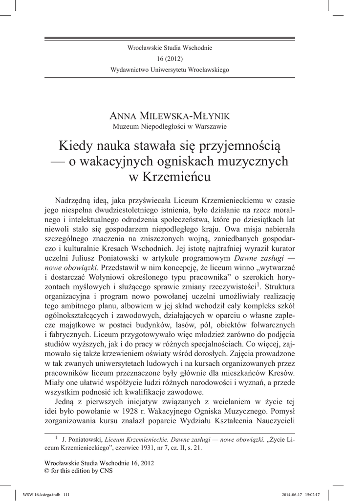 Wrocławskie Studia Wschodnie 16 (2012) Wydawnictwo Uniwersytetu Wrocławskiego Anna Milewska-Młynik Muzeum Niepodległości w Warszawie Kiedy nauka stawała się przyjemnością — o wakacyjnych ogniskach muzycznych w Krzemieńcu Nadrzędną ideą, jaka przyświecała Liceum Krzemienieckiemu w czasie jego niespełna dwudziestoletniego istnienia, było działanie na rzecz moralnego i intelektualnego odrodzenia społeczeństwa, które po dziesiątkach lat niewoli stało się gospodarzem niepodległego kraju. Owa misja nabierała szczególnego znaczenia na zniszczonych wojną, zaniedbanych gospodarczo i kulturalnie Kresach Wschodnich. Jej istotę najtrafniej wyraził kurator uczelni Juliusz Poniatowski w artykule programowym Dawne zasługi — nowe obowiązki. Przedstawił w nim koncepcję, że liceum winno „wytwarzać i dostarczać Wołyniowi określonego typu pracownika” o szerokich horyzontach myślowych i służącego sprawie zmiany rzeczywistości1. Struktura organizacyjna i program nowo powołanej uczelni umożliwiały realizację tego ambitnego planu, albowiem w jej skład wchodził cały kompleks szkół ogólnokształcących i zawodowych, działających w oparciu o własne zaplecze majątkowe w postaci budynków, lasów, pól, obiektów folwarcznych i fabrycznych. Liceum przygotowywało więc młodzież zarówno do podjęcia studiów wyższych, jak i do pracy w różnych specjalnościach. Co więcej, zajmowało się także krzewieniem oświaty wśród dorosłych. Zajęcia prowadzone w tak zwanych uniwersytetach ludowych i na kursach organizowanych przez pracowników liceum przeznaczone były głównie dla mieszkańców Kresów. Miały one ułatwić współżycie ludzi różnych narodowości i wyznań, a przede wszystkim podnosić ich kwalifikacje zawodowe. Jedną z pierwszych inicjatyw związanych z wcielaniem w życie tej idei było powołanie w 1928 r. Wakacyjnego Ogniska Muzycznego. Pomysł zorganizowania kursu znalazł poparcie Wydziału Kształcenia Nauczycieli 1 J. Poniatowski, Liceum Krzemienieckie. Dawne zasługi — nowe obowiązki. „Życie Liceum Krzemienieckiego”, czerwiec 1931, nr 7, cz. II, s. 21. Wrocławskie Studia Wschodnie 16, 2012 © for this edition by CNS WSW 16-ksiega.indb 111 2014-06-17 15:02:17 112 Anna Milewska-Młynik Ministerstwa Wyznań Religijnych i Oświecenia Publicznego oraz kuratora Juliusza Poniatowskiego, gdyż, jak napisano w broszurze wydanej w 1932 r., jedną z dziedzin, przedstawiających bardzo wdzięczne pole do głębszego opanowania przez nauczycielstwo, jest muzyka. Mimo swoich wielkich wartości kulturalnych i wychowawczych dziedzina ta jest niedoceniana ani w naszym życiu towarzysko-społecznym, ani w naszym szkolnictwie. Cofnięci jesteśmy pod tym względem bardzo znacznie w stosunku do naszych zachodnich, a poniekąd i wschodnich sąsiadów, choć nie brak nam ani dobrych tradycji, ani zdolności muzycznych, ani świetnych, a nawet genialnych kompozytorów i wirtuozów. Niewątpliwie zubożenie jednej z gałęzi naszego życia duchowego jest wynikiem długoletniej niewoli i istnienia obcej szkoły na naszych ziemiach2. Wakacyjne Ognisko Muzyczne włączało się w nurt szeroko zakrojonego programu podnoszenia kwalifikacji kadr pracowników terenowych, albowiem stawiało sobie za cel praktyczne i teoretyczne przygotowanie nauczycieli śpiewu, którym często brakowało profesjonalizmu w krzewieniu kultury muzycznej we własnych środowiskach. Program kursów zaspokajał najważniejsze, związane z tym potrzeby, gdyż obejmował kształcenie kierowników chórów szkolnych i kół śpiewaczych, dyrygentów orkiestr, zajęcia z metodyki śpiewu oraz naukę gry na skrzypcach lub fortepianie, traktowanych jako instrumenty akompaniujące. W latach 1933–1938 prowadzono też zajęcia teatralne. Uczestnikami ognisk byli nauczyciele śpiewu ze szkół podstawowych i seminariów nauczycielskich. Oprócz dominujących liczebnie Polaków, kształciły się tam osoby różnych narodowości i wyznań. W statucie zaznaczono jednak, że pierwszeństwo w przyjmowaniu na kurs mieli kandydaci z Okręgu Szkolnego Wołyńskiego. Do podstawowych warunków, jakie przed nimi stawiano, należały zamiłowania muzyczne znajdujące swój wyraz w działalności zawodowej, uzdolnienia w tym kierunku, umiejętność prowadzenia lekcji śpiewu czy zespołów artystycznych oraz przynajmniej elementarna znajomość zagadnień teoretycznych i solfeżu. Warto jeszcze zwrócić uwagę na etyczne wymagania stawiane kandydatowi, kładące nacisk na jego odpowiedzialny stosunek do podejmowanych działań: „winien on poważnie się zastanowić nad czekającymi go obowiązkami, aby nie zrobić zawodu instytucji, jak również nie demoralizować siebie rozpoczętą a nieukończoną pracą”3. O wakacyjnych ogniskach muzycznych sporo już napisano. Należy tu wymienić przede wszystkim obszerny artykuł Zofii Olszewskiej-Bajery, która na podstawie różnorodnego materiału źródłowego zsyntetyzowała całokształt związanych z nimi zagadnień4. Założenia instytucji, polega2 Liceum Krzemienieckie. Muzyczne Ognisko Wakacyjne dla nauczycielstwa szkół ogólnokształcących i seminariów nauczycielskich, Krzemieniec 1930, s. 2, 3. 3 Ibidem, s. 8. 4 Z. Olszewska-Bajera, Muzyczne Ognisko Wakacyjne w Krzemieńcu (1928–1939) w relacjach i wspomnieniach uczestników, [w:] Liceum Krzemienieckie w kontekście rozwoju oświaWrocławskie Studia Wschodnie 16, 2012 © for this edition by CNS WSW 16-ksiega.indb 112 2014-06-17 15:02:17 Kiedy nauka stawała się przyjemnością 113 jące na „rozbudzaniu zamiłowania do pieśni swojskiej i rozśpiewania najszerszych mas społecznych”, dzięki czemu stanie się możliwe „budowanie gmachu wielkiej kultury muzycznej”, opisał kierownik MOW profesor Państwowego Konserwatorium w Warszawie Bronisław Rutkowski5. Uwagi o potrzebie umuzykalnienia nauczycieli, o zasadach organizacyjnych kursów oraz treść statutu okre