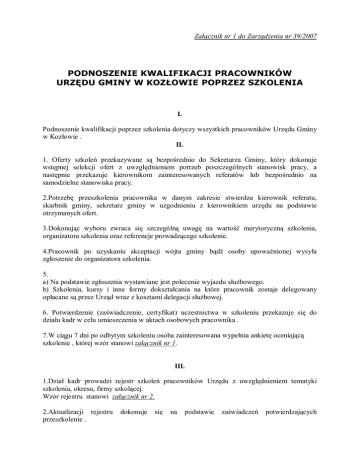 Załącznik nr 1 do Zarządzenia nr 39/2007 PODNOSZENIE KWALIFIKACJI PRACOWNIKÓW URZĘDU GMINY W KOZŁOWIE POPRZEZ SZKOLENIA I. Podnoszenie kwalifikacji poprzez szkolenia dotyczy wszystkich pracowników Urzędu Gminy w Kozłowie . II. 1. Oferty szkoleń przekazywane są bezpośrednio do Sekretarza Gminy, który dokonuje wstępnej selekcji ofert z uwzględnieniem potrzeb poszczególnych stanowisk pracy, a następnie przekazuje kierownikom zainteresowanych referatów lub bezpośrednio na samodzielne stanowiska pracy. 2.Potrzebę przeszkolenia pracownika w danym zakresie stwierdza kierownik referatu, skarbnik gminy, sekretarz gminy w uzgodnieniu z kierownikiem urzędu na podstawie otrzymanych ofert. 3.Dokonując wyboru zwraca się szczególną uwagę na wartość merytoryczną szkolenia, organizatora szkolenia oraz referencje prowadzącego szkolenie. 4.Pracownik po uzyskaniu akceptacji wójta gminy bądź osoby upoważnionej wysyła zgłoszenie do organizatora szkolenia. 5. a) Na podstawie zgłoszenia wystawiane jest polecenie wyjazdu służbowego. b) Szkolenia, kursy i inne formy dokształcania na które pracownik zostaje delegowany opłacane są przez Urząd wraz z kosztami delegacji służbowej. 6. Potwierdzenie (zaświadczenie, certyfikat) uczestnictwa w szkoleniu przekazuje się do działu kadr w celu umieszczenia w aktach osobowych pracownika . 7.W ciągu 7 dni po odbytym szkoleniu osoba zainteresowana wypełnia ankietę oceniającą szkolenie , której wzór stanowi załącznik nr 1. III. 1.Dział kadr prowadzi rejestr szkoleń pracowników Urzędu z uwzględnieniem tematyki szkolenia, okresu, firmy szkolącej. Wzór rejestru stanowi załącznik nr 2. 2.Aktualizacji rejestru przeszkolenie . dokonuje się na podstawie zaświadczeń potwierdzających IV. 1. W zależności od potrzeb w Urzędzie Gminy może być organizowane szkolenie wewnętrzne. 2. Potrzebę zorganizowania szkolenia wewnętrznego zgłosić może pracownik kierownikowi referatu lub kierownik referatu wójtowi gminy. 3. O przeprowadzeniu szkolenia wewnętrznego decyduje kierownik urzędu 4. Szkolenie dotyczyć może: a). znajomości przepisów prawa stosowanego w samorządzie gminnym, b) realizacji zadań urzędu, c) pracy i funkcjonowania urzędu, d) etyki urzędnika samorządowego, e) bhp, ppoż., f) udziału Urzędu Gminy w programach UE, akcjach i konkursach , itp. 4.Kierownicy referatów mogą organizować szkolenia wewnętrzne w swoim referacie. V. 1.Na początku każdego roku Sekretarz Gminy przy współudziale kierowników referatów uwzględniając potrzeby stanowisk pracy określa potrzeby szkoleniowe. 2.Wzór zapotrzebowania stanowi załącznik nr 3i nr 4 . Wójt Gminy Kozłowo mgr inż. Jacek Jankowski Załącznik nr 1 ANKIETA OCENIAJĄCA SZKOLENIE 1. Szkolenie organizowane przez: ………………………………………………………………………………………………… …………………………………………………………………………………………………. 2. Tematyka szkolenia : ………………………………………………………………………………………………….. ………………………………………………………………………………………………….. 3. Ocena szkolenia w skali 1- 5 a\ przygotowanie merytoryczne wykładowcy - ………… b\ jakość materiałów szkoleniowych - ………………. c\ organizacja szkolenia - ………………. 4. Uwagi uczestnika szkolenia …………………………………………………………………………………………………. …………………………………………………………………………………………………. …………………………………………………………………………………………………. …………………………………………………………………………………………………. 5. Czy jest Pan \ Pani zainteresowana kontynuacją tematyki szkolenia? TAK/NIE * Czy chciał\ łaby Pan \ Pani skorzystać z innych ofert danej firmy szkolącej? TAK/NIE * * niepotrzebne skreslić Załącznik nr 2 EWIDENCJA SZKOLEŃ lp Tematyka szkolenia Okres szkolenia Organizator szkolenia Koszty szkolenia Nazwisko osoby biorącej udział w szkoleniu Uwagi Załącznik nr 3 POTRZEBY SZKOLENIOWE PRACOWNIKÓW URZĘDU GMINY W KOZŁOWIE W ROKU ………… 1. Jakimi tematami szkolenia jest Pan \ Pani zainteresowana ………………………………………………………………………………………… ………………………………………………………………………………………… ………………………………………………………………………………………… ………………………………………………………………………………………… ………………………………………………………………………………………… ………………………………………………………………………………………… ………………………………………………………………………………………… ……………………………………………………………………………………….. 2. Proponowana jednostka szkoląca ………………………………………………………………………………………… ………………………………………………………………………………………… ………………………………………………………………………………………… ………………………………………………………………………………………… ………………………………………………………………………………………… ………………………………………………………………………………………… ………………………………