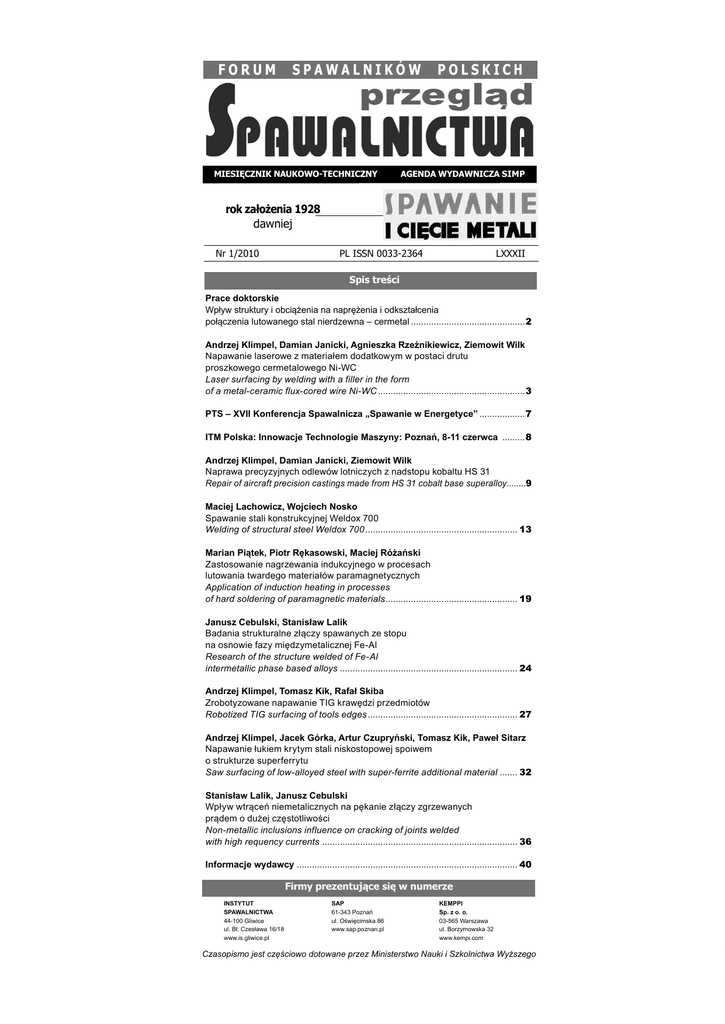 FORUM SPAWALNIKÓW Miesięcznik Naukowo-techniczny POLSKICH agenda wydawnicza SIMP rok założenia 1928 dawniej Nr 1/2010 PL ISSN 0033-2364 LXXXII Spis treści Prace doktorskie Wpływ struktury i obciążenia na naprężenia i odkształcenia połączenia lutowanego stal nierdzewna – cermetal..............................................2 Andrzej Klimpel, Damian Janicki, Agnieszka Rzeźnikiewicz, Ziemowit Wilk Napawanie laserowe z materiałem dodatkowym w postaci drutu proszkowego cermetalowego Ni-WC Laser surfacing by welding with a filler in the form of a metal-ceramic flux-cored wire Ni-WC...........................................................3 PTS – XVII Konferencja Spawalnicza „Spawanie w Energetyce”...................7 ITM Polska: Innowacje Technologie Maszyny: Poznań, 8-11 czerwca ..........8 Andrzej Klimpel, Damian Janicki, Ziemowit Wilk Naprawa precyzyjnych odlewów lotniczych z nadstopu kobaltu HS 31 Repair of aircraft precision castings made from HS 31 cobalt base superalloy.........9 Maciej Lachowicz, Wojciech Nosko Spawanie stali konstrukcyjnej Weldox 700 Welding of structural steel Weldox 700............................................................. 13 Marian Piątek, Piotr Rękasowski, Maciej Różański Zastosowanie nagrzewania indukcyjnego w procesach lutowania twardego materiałów paramagnetycznych Application of induction heating in processes of hard soldering of paramagnetic materials..................................................... 19 Janusz Cebulski, Stanisław Lalik Badania strukturalne złączy spawanych ze stopu na osnowie fazy międzymetalicznej Fe-Al Research of the structure welded of Fe-Al intermetallic phase based alloys....................................................................... 24 Andrzej Klimpel, Tomasz Kik, Rafał Skiba Zrobotyzowane napawanie tig krawędzi przedmiotów Robotized tig surfacing of tools edges............................................................ 27 Andrzej Klimpel, Jacek Górka, Artur Czupryński, Tomasz Kik, Paweł Sitarz Napawanie łukiem krytym stali niskostopowej spoiwem o strukturze superferrytu Saw surfacing of low-alloyed steel with super-ferrite additional material........ 32 Stanisław Lalik, Janusz Cebulski Wpływ wtrąceń niemetalicznych na pękanie złączy zgrzewanych prądem o dużej częstotliwości Non-metallic inclusions influence on cracking of joints welded with high requency currents ............................................................................. 36 Informacje wydawcy ....................................................................................... 40 Firmy prezentujące się w numerze INSTYTUT SPAWALNICTWA 44-100 Gliwice ul. Bł. Czesława 16/18 www.is.gliwice.pl SAP 61-343 Poznań ul. Oświęcimska 86 www.sap.poznan.pl KEMPPI Sp. z o. o. 03-565 Warszawa ul. Borzymowska 32 www.kempi.com Czasopismo jest częściowo dotowane przez Ministerstwo Nauki i Szkolnictwa Wyższego Przegląd spawalnictwa 1/2010 1
