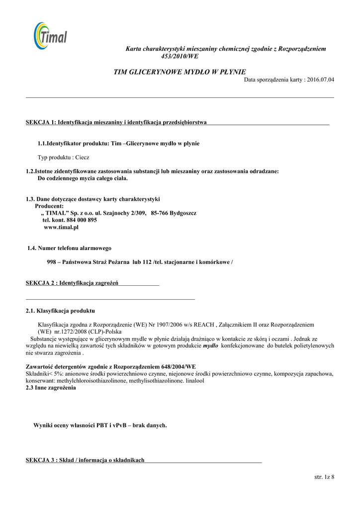 Karta charakterystyki mieszaniny chemicznej zgodnie z Rozporządzeniem 453/2010/WE TIM GLICERYNOWE MYDŁO W PŁYNIE Data sporządzenia karty : 2016.07.04 SEKCJA 1: Identyfikacja mieszaniny i identyfikacja przedsiębiorstwa 1.1.Identyfikator produktu: Tim –Glicerynowe mydło w płynie Typ produktu : Ciecz 1.2.Istotne zidentyfikowane zastosowania substancji lub mieszaniny oraz zastosowania odradzane: Do codziennego mycia całego ciała. 1.3. Dane dotyczące dostawcy karty charakterystyki Producent: „ TIMAL” Sp. z o.o. ul. Szajnochy 2/309, 85-766 Bydgoszcz tel. kont. 884 000 895 www.timal.pl 1.4. Numer telefonu alarmowego 998 – Państwowa Straż Pożarna lub 112 /tel. stacjonarne i komórkowe / SEKCJA 2 : Identyfikacja zagrożeń 2.1. Klasyfikacja produktu Klasyfikacja zgodna z Rozporządzenie (WE) Nr 1907/2006 w/s REACH , Załącznikiem II oraz Rozporządzeniem (WE) nr.1272/2008 (CLP)-Polska Substancje występujące w glicerynowym mydle w płynie działają drażniąco w kontakcie ze skórą i oczami . Jednak ze względu na niewielką zawartość tych składników w gotowym produkcie mydło konfekcjonowane do butelek polietylenowych nie stwarza zagrożenia . Zawartość detergentów zgodnie z Rozporządzeniem 648/2004/WE Składniki< 5%: anionowe środki powierzchniowo czynne, niejonowe środki powierzchniowo czynne, kompozycja zapachowa, konserwant: methylchloroisothiazolinone, methylisothiazolinone. linalool 2.3 Inne zagrożenia Wyniki oceny własności PBT i vPvB – brak danych. SEKCJA 3 : Skład / informacja o składnikach str. 1z 8 Karta charakterystyki mieszaniny chemicznej zgodnie z Rozporządzeniem 453/2010/WE TIM GLICERYNOWE MYDŁO W PŁYNIE 3.1Substancja- nie dotyczy 3.2 Mieszaniny Lp 1 2 Nazwa składnika Sól sodowa oksyetylenowanego siarczanu alkoholu tłuszczowego Dietanoloamid kwasu oleju kokosowego identyfikatory CAS: 68891-38-3 % <2 Nr WE : 931-329-6 <0,5 Rozporządzenie (WE) Nr 1272/2008 (CLP) Skin.Irrit.2;H315 Eye Dam.1;H318 Aquatic Chronic 3,H412 Skin Irrit2,H315 Eye dam 1-H318 Aquatic Chronic 2;H411 SEKCJA 4 : Środki pierwszej pomocy . 4.1. Opis środków pierwszej pomocy Pierwsza pomoc/informacje ogólne Natychmiast zdjąć całą zanieczyszczoną odzież. Pierwsza pomoc/drogi oddechowe Nie jest wymagana. Pierwsza pomoc/kontakt ze skórą W razie kontaktu ze skórą spłukać wodą. Pierwsza pomoc/kontakt z oczami W razie kontaktu z oczami przemywać oczy dużą ilością wody przez 5 minut , przytrzymując odchylone powieki . Pierwsza pomoc/droga pokarmowa W razie spożycia wypłukać wodą usta, natychmiast zapewnić pomoc lekarską 4.2. Najważniejsze ostre i opóźnione objawy oraz skutki narażenia. Skutki zdrowotne narażenia ostrego : podrażnienie oczu , skóry . 4.3. Wskazania dotyczące wszelkiej natychmiastowej pomocy lekarskiej i szczególnego postępowania z poszkodowanym W razie potrzeby należy zasięgnąć porady lekarza – pokazać etykietę lub kartę charakterystyki. SEKCJA 5. Postępowanie w przypadku pożaru. 5.1. Środki gaśnicze. Pożary w pomieszczeniu w którym znajduje się płyn gasić środkami odpowiednimi dla palących się materiałów. str. 2z 8 Karta charakterystyki mieszaniny chemicznej zgodnie z Rozporządzeniem 453/2010/WE TIM GLICERYNOWE MYDŁO W PŁYNIE Piasek , piany gaśnicze , woda , dwutlenek węgla . 5.2. Szczególne zagrożenia związane z substancją lub mieszaniną. Brak 5.3. Informacje dla straży pożarnej. Produkt niepalny . SEKCJA 6. Postępowanie w przypadku niezamierzonego uwolnienia do środowiska. 6.1. Indywidualne środki ostrożności, wyposażenie ochronne i procedury w sytuacjach awaryjnych. Unikać kontaktu ze skórą i oczami .Wyciek płynu powoduje śliskość nawierzchni. 6.2. Środki ostrożności w zakresie ochrony środowiska. Zapobiec zanieczyszczeniu gleby i wody oraz przedostaniu się do kanalizacji , rowów i rzek . Stosować tace ochronne , nienasiąkliwe posadzki . 6.3. Metody i materiały zapobiegające rozprzestrzenianiu się i służące do usuwania skażenia . O ile to możliwe zlikwidować wyciek ( np. uszczelnić uszkodzone opakowania , umieścić w pojemniku awaryjnym ) Rozlaną ciecz przysypać materiałem chłonnym ( ziemia , piasek ) , zebrać do zamykanego opakowania i przekazać do utylizacji . 6.4 Odniesienia do innych sekcji Informacja dotycząca bezpiecznego użytkowania, patrz sekcja 7 Środki ochrony osobistej: patrz w sekcji 8. Informacja dotycząca usuwania odpadów, patrz sekcja 13 SEKCJA 7. Postępowanie z preparatem oraz ich magazynowanie. 7.1. Środki ostrożności dotyczące bezpiecznego postępowania. -Postępowanie z preparatem Stosować płyn zgodnie z przeznaczeniem i sposobem użycia umieszczonym na etykiecie opakowania. Płyn mieszać wyłącznie z wodą -Zasady higieny Podczas stosowania nie jeść i nie pić .Myj ręce przed posiłkami i po zakończeniu pracy Unikać bezpośredniego kontaktu . Nie wdychać par . - Wskazówki dotyczące zabezpieczenia przed pożarem i eksplozją Produkt jest niepalny i nie jest wybuchowy . 7.2. Warunki bezpiecznego magazynowania, łącznie z informacjami dotyczącymi wszelkich wzajemnych niezgodności. Opakowania z produktem przechowywać szczelnie zamknięte , w suchych wentylowanych pomieszczeniach w temperaturze 2-35C, z dala od źródeł zapłonu i otwartego ognia. 7.3 Szczególne zastosowanie końcowe. Nie ma szczególnych zaleceń. SEKCJA 8. Kontrola narażenia / środki ochrony indywidualnej. 8.1. Parametry dotyczące kontroli. Krajowe wartości najwyższych dopuszczalnych stężeń w środowisku pracy, str. 3z 8 Karta charakterystyki mieszaniny chemicznej zgodnie z Rozporządzeniem 453/2010/WE TIM GLICERYNOWE MYDŁO W PŁYNIE Rozporządzeniem Ministra Pracy i Polityki Społecznej z dnia 06.06.2014r. w sprawie najwyższych dopuszczalnych stężeń i natężeń czynników szkodliwych dla zdrowia w środowisku pracy (Dz.U. z 2014r, poz. 817) . SUBSTANCJA NDS (mg/m3) NDSCh (mg/m3) Nie dotyczy Krajowe dopuszczalne wartoś