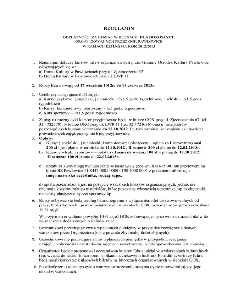 REGULAMIN ODPŁATNOŚCI ZA UDZIAŁ W KURSACH DLA DOROSŁYCH ORGANIZOWANYCH PRZEZ GOK PAWŁOWICE W RAMACH EDU-S NA ROK 2012/2013 1. Regulamin dotyczy kursów Edu-s organizowanych przez Gminny Ośrodek Kultury Pawłowice, odbywających się w: a) Domu Kultury w Pawłowicach przy ul. Zjednoczenia 67 b) Domu Kultury w Pawłowicach przy ul. LWP 11 2. Kursy Edu-s trwają od 17 września 2012r. do 14 czerwca 2013r. 3. Ustala się następującą ilość zajęć: a) Kursy językowe: j.angielski, j.niemiecki - 2x1,5 godz. tygodniowo, j.włoski - 1x1,5 godz. tygodniowo b) Kursy: komputerowy, plastyczny - 1x3 godz. tygodniowo c) Kurs sportowy – 1x1,5 godz. tygodniowo 4. Zapisy na roczny cykl kursów przyjmowane będą: w biurze GOK przy ul. Zjednoczenia 67 (tel. 32 4722570), w biurze DKO przy ul. LWP 11 (tel. 32 4721036) oraz u instruktorów poszczególnych kursów w terminie do 12.10.2012. Po tym terminie, ze względu na charakter prowadzonych zajęć, zapisy nie będą przyjmowane. 5. Opłaty: a) Kursy: j.angielski , j.niemiecki, komputerowy i plastyczny - opłata za I semestr wynosi 200 zł i jest płatna w terminie do 12.10.2012 , II semestr 200 zł płatne do 22.02.2013r. b) Kursy: j.włoski i sportowy – opłata za I semestr wynosi 100 zł – płatna do 12.10.2012, II semestr 100 zł płatne do 22.02.2013r. c) opłaty za kursy mogą być uiszczane w kasie GOK (pon.-pt. 8.00-15.00) lub przelewem na konto BS Pawłowice 41 8447 0005 0000 0198 2000 0001 z podaniem informacji: imię i nazwisko uczestnika, rodzaj zajęć. d) opłata przeznaczona jest na pokrycie wszystkich kosztów organizacyjnych, jednak nie obejmuje kosztów zakupu materiałów, które pozostaną własnością uczestnika, np. podręczniki, materiały plastyczne, sprzęt sportowy itp. 6. Kursy odbywać się będą według harmonogramu z wyłączeniem dni ustawowo wolnych od pracy, ferii szkolnych i przerw świątecznych w szkołach. GOK zastrzega sobie prawo odwołania 10 % zajęć. W przypadku odwołania powyżej 10 % zajęć GOK zobowiązuje się na wniosek uczestników do wyznaczenia dodatkowych terminów zajęć. 7. Uczestnikowi przysługuje zwrot wpłaconych pieniędzy w przypadku rozwiązania danych warsztatów przez Organizatora (np. z powodu zbyt małej ilości chętnych). 8. Uczestnikowi nie przysługuje zwrot wpłaconych pieniędzy w przypadku: rezygnacji z zajęć, nieobecności uczestnika na zajęciach nawet wtedy, kiedy spowodowana jest chorobą. 9. Organizator będzie proponował uczestnikom kursów Edu-s udział w wydarzeniach kulturalnych (np. wyjazd do teatru, filharmonii, spotkania z ciekawymi ludźmi). Ponadto uczestnicy Edu-s będą mogli korzystać z ulgowych biletów na imprezach organizowanych w siedzibie GOK. 10. Po zakończeniu rocznego cyklu warsztatów uczestnik otrzyma dyplom potwierdzający jego udział w warsztatach.