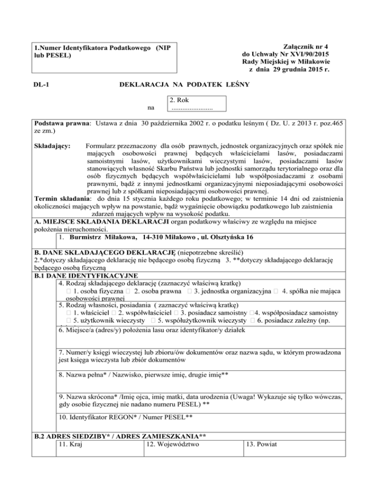1.Numer Identyfikatora Podatkowego (NIP lub PESEL) Załącznik nr 4 do Uchwały Nr XVI/90/2015 Rady Miejskiej w Miłakowie z dnia 29 grudnia 2015 r. DEKLARACJA NA PODATEK LEŚNY DL-1 na 2. Rok ....................... Podstawa prawna: Ustawa z dnia 30 października 2002 r. o podatku leśnym ( Dz. U. z 2013 r. poz.465 ze zm.) Składający: Formularz przeznaczony dla osób prawnych, jednostek organizacyjnych oraz spółek nie mających osobowości prawnej będących właścicielami lasów, posiadaczami samoistnymi lasów, użytkownikami wieczystymi lasów, posiadaczami lasów stanowiących własność Skarbu Państwa lub jednostki samorządu terytorialnego oraz dla osób fizycznych będących współwłaścicielami lub współposiadaczami z osobami prawnymi, bądź z innymi jednostkami organizacyjnymi nieposiadającymi osobowości prawnej lub z spółkami nieposiadającymi osobowości prawnej. Termin składania: do dnia 15 stycznia każdego roku podatkowego; w terminie 14 dni od zaistnienia okoliczności mających wpływ na powstanie, bądź wygaśnięcie obowiązku podatkowego lub zaistnienia zdarzeń mających wpływ na wysokość podatku. A. MIEJSCE SKŁADANIA DEKLARACJI organ podatkowy właściwy ze względu na miejsce położenia nieruchomości. 1. Burmistrz Miłakowa, 14-310 Miłakowo , ul. Olsztyńska 16 B. DANE SKŁADAJĄCEGO DEKLARACJĘ (niepotrzebne skreślić) 2.*dotyczy składającego deklarację nie będącego osobą fizyczną 3. **dotyczy składającego deklarację będącego osobą fizyczną B.1 DANE IDENTYFIKACYJNE 4. Rodzaj składającego deklarację (zaznaczyć właściwą kratkę) mająca osobowości prawnej 5. Rodzaj własności, posiadania ( zaznaczyć właściwą kratkę) dzierżawca) 6. Miejsce/a (adres/y) położenia lasu oraz identyfikator/y działek 7. Numer/y księgi wieczystej lub zbioru/ów dokumentów oraz nazwa sądu, w którym prowadzona jest księga wieczysta lub zbiór dokumentów 8. Nazwa pełna* / Nazwisko, pierwsze imię, drugie imię** 9. Nazwa skrócona* /Imię ojca, imię matki, data urodzenia (Uwaga! Wykazuje się tylko wówczas, gdy osobie fizycznej nie nadano numeru PESEL) ** 10. Identyfikator REGON* / Numer PESEL** B.2 ADRES SIEDZIBY* / ADRES ZAMIESZKANIA** 11. Kraj 12. Województwo 13. Powiat 14. Gmina 15. Ulica 16. Nr domu/Nr lokalu 17. Miejscowość 18. Kod pocztowy 19. Poczta C. OKOLICZNOŚCI POWODUJĄCE KONIECZNOŚĆ ZŁOŻENIA DEKLARACJI 20. Okoliczności (zaznaczyć właściwą kratkę) od miesiąca ……………………………………. D. DANE DOTYCZĄCE PRZEDMIOTÓW OPODATKOWANIA D.1 Z WYJĄTKIEM ZWOLNIONYCH Powierzchnia w hektarach fizycznych Wyszczególnienie z dokładnością do 1 m2 1 1.Lasy wchodzące w skład rezerwatów przyrody i parków narodowych 2. Lasy pozostałe 2 Stawka podatku (0,220 m3 drewna x cena drewna) 3 gr w zł, Podatek w zł, gr (rubr. 2 x rubr.3) 3. Razem (należy zaokrąglić do pełnych złotych) E. INFORMACJA O PRZEDMIOTACH ZWOLNIONYCH Wyszczególnienie Powierzchnia w hektarach fizycznych z dokładnością do 1 m2 1 art. 7 ust. 1 pkt.1 - lasy z drzewostanem w wieku do 40 lat 2. art.,7 ust.1 pkt 2 – lasy wpisane indywidualnie do rejestru zabytków 3. art.7 ust1 pkt 3 – użytki ekologiczne 4. inne zwolnienia ( podać przepis prawa z jakiego nastąpiło zwolnienie) F. POUCZENIE : W przypadku niewpłacenia w obowiązujących terminach i ratach kwoty podatku lub wpłacenia jej w niepełnej wysokości, niniejsza deklaracja stanowi podstawę do wystawienia tytułu wykonawczego, zgodnie z przepisami ustawy z dnia 17 czerwca 1966r. o postępowaniu egzekucyjnym w administracji (Dz. U z 2014 r. poz. 1619 ze zm.). G. OŚWIADCZENIE I PODPIS SKŁADAJĄCEGO / OSOBY REPREZENTUJĄCEJ SKŁADAJĄCEGO Oświadczam, że podane dane są zgodne z prawdą. 21. Imię i nazwisko wypełniającego deklarację 22. Data wypełnienia (dzień - miesiąc – rok ) 23.Podpis (pieczęć) składającego / osoby reprezentującej składającego H. ADNOTACJE ORGANU PODATKOWEGO 24. Uwagi organu podatkowego 25.Data 26.Podpis przyjmującego formularz