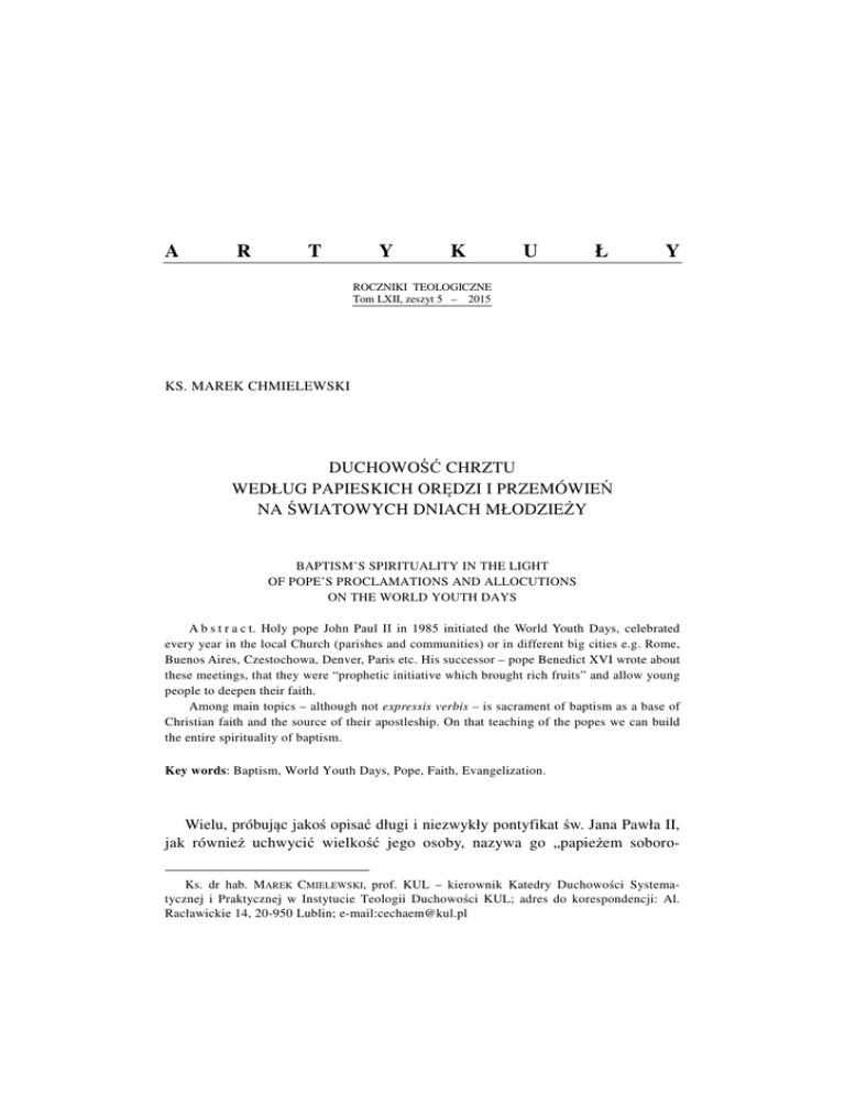 A R T Y K U Ł Y ROCZNIKI TEOLOGICZNE Tom LXII, zeszyt 5 – 2015 KS. MAREK CHMIELEWSKI * DUCHOWOŚĆ CHRZTU WEDŁUG PAPIESKICH ORĘDZI I PRZEMÓWIEŃ NA ŚWIATOWYCH DNIACH MŁODZIEŻY BAPTISM’S SPIRITUALITY IN THE LIGHT OF POPE’S PROCLAMATIONS AND ALLOCUTIONS ON THE WORLD YOUTH DAYS A b s t r a c t. Holy pope John Paul II in 1985 initiated the World Youth Days, celebrated every year in the local Church (parishes and communities) or in different big cities e.g. Rome, Buenos Aires, Czestochowa, Denver, Paris etc. His successor – pope Benedict XVI wrote about these meetings, that they were “prophetic initiative which brought rich fruits” and allow young people to deepen their faith. Among main topics – although not expressis verbis – is sacrament of baptism as a base of Christian faith and the source of their apostleship. On that teaching of the popes we can build the entire spirituality of baptism. Key words: Baptism, World Youth Days, Pope, Faith, Evangelization. Wielu, próbując jakoś opisać długi i niezwykły pontyfikat św. Jana Pawła II, jak również uchwycić wielkość jego osoby, nazywa go „papieżem soboroKs. dr hab. MAREK CMIELEWSKI, prof. KUL – kierownik Katedry Duchowości Systematycznej i Praktycznej w Instytucie Teologii Duchowości KUL; adres do korespondencji: Al. Racławickie 14, 20-950 Lublin; e-mail:[email protected] 6 KS. MAREK CHMIELEWSKI wym”, „papieżem maryjnym”, „papieżem różańca”, „papieżem rodzin” itd. Z pewnością do tych określeń należy dodać, że w sposób szczególny był on „papieżem młodzieży”. Uzasadnia to fakt, że w 1985 r. zainicjował masowe zgromadzenia młodzieży ze wszystkich kontynentów, które szybko przerodziły się w Światowe Dni Młodzieży. Genezy tych spotkań należy upatrywać w „Jubileuszu Młodzieży”, która spotkała się z Ojcem Świętym 15 IV 1984 r. w ramach obchodów Jubileuszowego Roku Odkupienia. Kolejną okazją do spotkania Jana Pawła II z licznie zgromadzoną młodzieżą zarówno na Placu Św. Jana na Lateranie dnia 30 III 1985 r., jak i nazajutrz – w Niedzielę Palmową na Placu św. Piotra na Watykanie, były obchody Międzynarodowego Roku Młodzieży1. Z tych spotkań zrodziła się idea cyklicznych Światowych Dni Młodzieży, organizowanych co kilka lat w różnych miejscach na świecie. Po śmierci św. Jana Pawła II dzieło to kontynuowali jego następcy – papieże Benedykt XVI i Franciszek. 1. FENOMEN ŚWIATOWYCH DNI MŁODZIEŻY Dotychczas odbyło się trzydzieści tego rodzaju spotkań, z czego trzynaście miało charakter kilkudniowych ogólnoświatowych zgromadzeń w różnych wielkich miastach Europy i świata, a pozostałe obchodzone były zasadniczo w Niedzielę Palmową w ramach Kościołów lokalnych: w diecezjach, parafiach i wspólnotach. Dwadzieścia Światowych Dni Młodzieży odbyło się za pontyfikatu św. Jana Pawła II, z czego dziewięć to właśnie zgromadzenia ogólnoświatowe. Szacuje się, że we wszystkich ogólnoświatowych zgromadzeniach, zarówno za pontyfikatu św. Jana Pawła II, Benedykta XVI, jak i Franciszka, w sumie wzięło udział około 19, 5 mln młodych ludzi. Za rekordowe pod względem liczebności należy uznać spotkanie św. Jana Pawła II w Manili na Filipinach w dniach 10-15 I 1995 r., na które z całego świata przybyło około 4 mln młodzieży. Nieco mniej, bo około 3, 7 mln osób zgromadziło się na plaży Copacabana w Rio de Janeiro na XXVIII Światowych Dniach Młodzieży, obchodzonych w dniach 23-28 VII 2013 r. Każdego roku św. Jan Paweł II i jego następcy zwykle w styczniu kierowali specjalne orędzie, którego celem jest zaproszenie młodych do udziału i zaprogramowanie kolejnego Światowego Dnia Młodzieży. Każde takie wydarzenie 1 Zob. M. CHMIELEWSKI, E. WERON, Światowe Dni Młodzieży, w: Leksykon duchowości katolickiej, red. M. Chmielewski, Lublin–Kraków 2002, s. 860-863. DUCHOWOŚĆ CHRZTU WEDŁUG PAPIESKICH ORĘDZI I PRZEMÓWIEŃ 7 miało swoje hasło, którym jest jakieś zdanie z Pisma Świętego. W nim zawiera się temat i główna idea spotkania, które mniej lub bardziej nawiązuje do bieżących wydarzeń w życiu Kościoła oraz świata. Niezależnie od tego stanowią one bardzo spójny program formacyjny młodzieży do dojrzałej wiary i odpowiedzialności za Kościół i świat. Ilustruje to poniższe zestawienie: Numer Data Miejsce 1 2 3 I 29-31 III 1985 Rzym 2 ? 23 III 1986 II 11-12 IV 1987 III 27 III 1988 IV 15-20 VIII 1989 Hasło – motto 4 Abyście umieli zdać sprawę z nadziei, która jest w was (1 P 3, 15) Kościoły lokalne Błogosławiony Ten, który przychodzi w imię Pańskie! (Mt 21, 9) Buenos Aires Myśmy poznali i uwierzyli miłości, jaką Bóg ma ku nam (1 J 4, 16) Kościoły lokalne Zróbcie wszystko, cokolwiek wam powie (J 2, 5) Santiago de Compostella Jam jest Drogą i Prawdą, i Życiem (J 14, 6) V 8 V 1990 Kościoły lokalne Ja jestem krzewem winnym, wy – latoroślami (J 15, 5) VI 10-15 VIII 1991 Częstochowa Otrzymaliście Ducha przybrania za synów (Rz 8, 15) VII 12 IV 1992 VIII 10-15 VIII 1993 Denver Ja przyszedłem po to, aby (owce) miały życie i miały je w obfitości (J 10, 10) IX-X 10-15 I 1995 Manila Jak Ojciec mnie posłał, tak i Ja was posyłam (J 20, 21) XI 31 III 1996 Kościoły lokalne XII 19-24 VIII 1997 Paryż XIII 5 IV 1998 Kościoły lokalne Duch Święty was nauczy (por. J 14, 26 ) XIV 28 III 1999 Kościoły lokalne Ojciec was miłuje (por. J 16, 27) XV 15-20 VIII 2000 Rzym XVI 8 IV 2001 Kościoły lokalne XVII 23-28 VII 2002 Toronto XVIII 13 IV 2003 Kościoły lokalne Oto Matka Twoja! (J 19, 27) XIX 4 IV 2004 Kościoły lokalne Chcemy ujrzeć Jezusa (J 12, 21) XX 16-21 VIII 2005 XXI XXII XXIII 2 Kościoły lokalne Idźcie na cały świat i głoście Ewangelię (Mk 16, 15) Kolonia Panie, do kogóż pójdziemy? Ty masz słowa życia wiecznego (J 6, 68) Nauczycielu, gdzie mieszkasz? Chodźcie, a zobaczycie (J 1, 3839) A sło