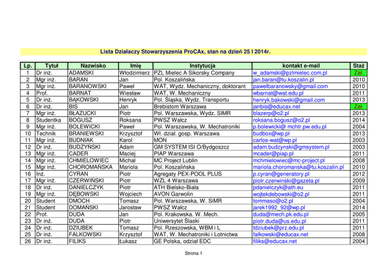 Lista Działaczy Stowarzyszenia ProCAx, stan na dzień 25 I 2014r. Lp. 1 2 3 4 5 6 7 8 9 10 11 12 13 14 15 16 17 18 19 20 21 22 23 24 25 26 Tytuł Dr inż. Mgr inż. Mgr inż. Prof. Dr inż. Dr inż. Mgr inż. Studentka Mgr inż. Technik Mgr inż. Dr inż. Mgr inż. Mgr inż. Mgr inż. Inż. Mgr inż. Dr inż. Mgr inż. Student Student Prof. Dr inż. Dr inż. Dr inż. Dr inż. Nazwisko ADAMSKI BARAN BARANOWSKI BARNAT BĄKOWSKI BIS BŁAZUCKI BOGUSZ BOLEWICKI BRANIEWSKI BUDNIAK BUDZYŃSKI CADER CHMIELOWIEC CHOROMAŃSKA CYRAN CZERWIŃSKI DANIELCZYK DĘBOWSKI DMOCH DOMAŃSKI DUDA DUDA DZIUBEK FALKOWSKI FILIKS Imię Włodzimierz Jan Paweł Wiesław Henryk Jan Piotr Roksana Paweł Krzysztof Karol Adam Maciej Michał Mariola Piotr Piotr Piotr Wojciech Tomasz Jarosław Jan Piotr Tomasz Krzysztof Łukasz Instytucja PZL Mielec A Sikorsky Company Pol. Koszalińska WAT, Wydz. Mechaniczny, doktorant WAT, W. Mechaniczny Pol. Śląska, Wydz. Transportu Brebistom Warszawa Pol. Warszawska, Wydz. SIMR PWSZ Wałcz Pol. Warszawska, W. Mechatroniki Wł. dział. gosp. Warszawa MON GM SYSTEM ISI O/Bydgoszcz PIAP Warszawa MC Project Lublin Pol. Koszalińska Agregaty PEX-POOL PLUS WZL 4 Warszawa ATH Bielsko-Biała AVON Garwolin Pol. Warszawska, W. SiMR PWSZ Wałcz Pol. Krakowska. W. Mech. Uniwersytet Ślaski Pol. Rzeszowska, WBM i L WAT, W. Mechatroniki i Lotnictwa GE Polska, odział EDC Strona 1 kontakt e-mail [email protected] [email protected] [email protected] [email protected] [email protected] [email protected] [email protected] [email protected] p.bolewicki@ mchtr.pw.edu.pl [email protected] [email protected] [email protected] [email protected] [email protected] [email protected] [email protected] [email protected] [email protected] [email protected] [email protected] [email protected] [email protected] [email protected] [email protected] [email protected] [email protected] Staż Zał. 2010 2010 2011 2013 Zał. 2013 2014 2004 2013 2003 2003 2011 2008 2010 2012 2009 2011 2011 2004 2014 2005 2011 2011 2008 2004 27 28 29 30 31 32 33 34 35 36 37 38 39 40 41 42 43 44 45 46 47 48 49 50 51 52 53 54 55 56 Student Mgr Mgr inż. Mgr inż. Mgr inż. Mgr inż. Mgr inż. Mgr inż. Dr inż. Mgr inż. Mgr inż. Dr inż. Mgr inż. Mgr inż. Technik Mgr inż. Mgr inż. Dr inż. Dr inż. Dr hab. inż. Mgr inż. Dr inż. Mgr inż. Mgr inż. Dr inż. Dr inż. Inż. Student Student Mgr inż. FILIPEK FRANKE GAWROŃSKI GĄSKA GĄSKA GĘBARSKA GĘBARSKI GINAK GOLA GORCZYCA GRABIEC GRĄZKA GROCHOWSKI GRUZA GRYGIER HARMATYS HOFFMAN HYLEWSKI JAGIEŁOWICZ JANISZEWSKI JANUS JANUSZKA JASIŃSKI JASKÓLSKI KAMIŃSKI KARPIUK KAŹMIERCZAK KIEDROWSKI KISIELEWICZ KNAPIK Tomasz Bogusław Tomasz Adam Piotr Anna Krzysztof Paweł Łukasz Iwona Ryszard Michał Artur Maciej Marcin Wiktor Grzegorz Dominik Patrycja Jacek Krzysztof Marcin Dariusz Arkadiusz Robert Michał Krzysztof Franciszek Grzegorz Renata Pol. Warsz. SIMR, studia mgr ZST Płock HENKIS Marki Pol. Krakowska. W. Mechaniczny Pol. Krakowska. W. Mechaniczny Smarttech Łomianki Smarttech Łomianki Wirtualna Polska Pol. Krakowska TUiR Allianz Polska PKN Warszawa WAT, W. Mechatroniki i Lotnictwa FESTO Janki Pol. Krakowska POWER-TECH Wałcz Pol. Krakowska. W. Mechaniczny Pol. Warszawska, Wydz. SiMR CADELAN sp. z o.o. Sosnowiec Pol. Rzeszowska, WBM i Lotnictwa WAT, W. Mechatroniki i Lotnictwa MECHANIK Pol. Śląska, Wydz. M - T Smarttech Łomianki MON GE Polska, odział EDC Pol. Krakowska PWSZ Wałcz PWSZ Wałcz PWSZ Wałcz Pol. Krakowska. W. Mechaniczny Strona 2 [email protected] [email protected] [email protected] [email protected] [email protected] [email protected] [email protected] [email protected] [email protected] [email protected] [email protected] [email protected] [email protected] [email protected] [email protected] [email protected] [email protected] [email protected] [email protected] [email protected] [email protected] [email protected] [email protected] [email protected] [email protected] karpiukmichał @gmail.com [email protected] fkiedrowski@onet [email protected] [email protected] 2014 2013 2007 2013 2013 2002 2012 2011 2012 2011 Zał. 2010 2000 2011 2014 2013 2013 2014 2014 2007 2012 2011 2012 Zał. Zał. 2012 2014 2014 2014 2013 57 58 59 60 61 62 63 64 65 66 67 68 69 70 71 72 73 74 75 76 77 78 79 80 81 82 83 84 85 86 Mgr inż. Mgr inż. Inż. Studentka Inż. Dr inż. Mgr inż. Inż. Dr inż. Mgr Mgr inż. Inż. Dr inż. Student Mgr inż. Student Dr inż. Mgr inż. Studentka Inż. Inż. Mgr inż. Dr inż. Student Mgr inż. Dr Prof. Mgr inż. Mgr inż. Student KOŁODZIEJCZYK KONOPKA KORDEK KORDOWSKA KRAJEWSKI KRAWIEC KRET KRZYMINIEWSKI KRZYSIAK KUBICA KUBIK KUCYBAŁA KURYJAŃSKI KUŚ KUŹNICKI LACHOWICZ LEHRICH LEKS LEWANDOWSKA LEWANDOWSKI LIS LISIECKI ŁUKASZEWICZ MAGNUSKI MAJDA MAKSYMIUK MAŁACHOWSKI MARKIEWICZ MARZEC MATRACKI Damian Cezary Mateusz Marta Rafał Jerzy Marek Sławomir Zbigniew Marek Hubert Roman Ryszard Mateusz Paweł Tomasz Krzysztof Andrzej Paulina Marcin Rafał Marcin Andrzej Ryszard Krzysztof Romuald Jerzy Ryszard Krzysztof Piotr WAT, Wydz. Mechaniczny PLAY Service Warszawa PWSZ Wałcz Pol. Koszalińska Biuro Rek. Poj. Zabytkowych PKN Warszawa Pol. Warszawska, Wydz. SIMR PWSZ Wałcz Uniwersytet Przyrodniczy Lublin Uniwersytet Ślaski, doktorant Smarttech Łomianki PWSZ Wałcz Pol. Warszawska, Wydz. SiMR Pol. Śląska Computer-Progress Litwiniuk WAT, W. Mechatroniki i Lotnictwa Pol. Śląska, Wydz. M - T ZERO Warszawa PWSZ Wałcz Smarttech Łomianki 3D Master Warszawa CRASh S.C. Łajski Pol. Białostocka PWSZ Wałcz MAT Usługi informatyczne, Rzeszów MON WAT, W. Mechaniczny WZL 4 Warszawa MTU Aero Engines, Jasionka WAT, W. Mechatroniki i Lotnictwa Strona 3 [email protected] [email protected] [email protected] [email protected] [email protected] [email protected] [email protected] [email protected] [email protected] [email protected] [email protected] [email protected] [email protected] [email protected] [email protected] [email protected] [email protec