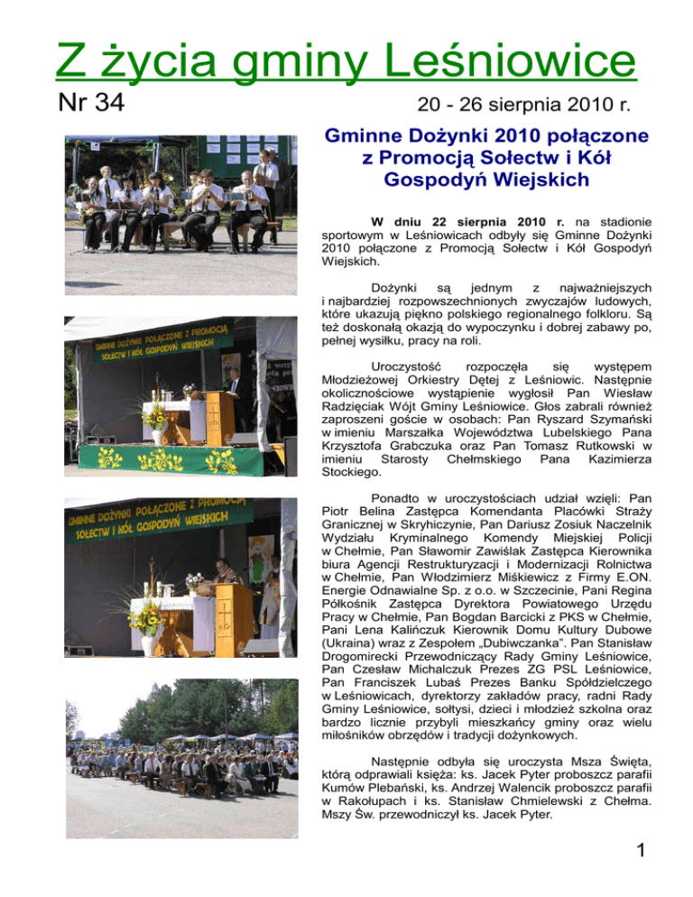 Z życia gminy Leśniowice Nr 34 20 - 26 sierpnia 2010 r. Gminne Dożynki 2010 połączone z Promocją Sołectw i Kół Gospodyń Wiejskich W dniu 22 sierpnia 2010 r. na stadionie sportowym w Leśniowicach odbyły się Gminne Dożynki 2010 połączone z Promocją Sołectw i Kół Gospodyń Wiejskich. Dożynki są jednym z najważniejszych i najbardziej rozpowszechnionych zwyczajów ludowych, które ukazują piękno polskiego regionalnego folkloru. Są też doskonałą okazją do wypoczynku i dobrej zabawy po, pełnej wysiłku, pracy na roli. Uroczystość rozpoczęła się występem Młodzieżowej Orkiestry Dętej z Leśniowic. Następnie okolicznościowe wystąpienie wygłosił Pan Wiesław Radzięciak Wójt Gminy Leśniowice. Głos zabrali również zaproszeni goście w osobach: Pan Ryszard Szymański w imieniu Marszałka Województwa Lubelskiego Pana Krzysztofa Grabczuka oraz Pan Tomasz Rutkowski w imieniu Starosty Chełmskiego Pana Kazimierza Stockiego. Ponadto w uroczystościach udział wzięli: Pan Piotr Belina Zastępca Komendanta Placówki Straży Granicznej w Skryhiczynie, Pan Dariusz Zosiuk Naczelnik Wydziału Kryminalnego Komendy Miejskiej Policji w Chełmie, Pan Sławomir Zawiślak Zastępca Kierownika biura Agencji Restrukturyzacji i Modernizacji Rolnictwa w Chełmie, Pan Włodzimierz Miśkiewicz z Firmy E.ON. Energie Odnawialne Sp. z o.o. w Szczecinie, Pani Regina Półkośnik Zastępca Dyrektora Powiatowego Urzędu Pracy w Chełmie, Pan Bogdan Barcicki z PKS w Chełmie, Pani Lena Kalińczuk Kierownik Domu Kultury Dubowe (Ukraina) wraz z Zespołem „Dubiwczanka”. Pan Stanisław Drogomirecki Przewodniczący Rady Gminy Leśniowice, Pan Czesław Michalczuk Prezes ZG PSL Leśniowice, Pan Franciszek Lubaś Prezes Banku Spółdzielczego w Leśniowicach, dyrektorzy zakładów pracy, radni Rady Gminy Leśniowice, sołtysi, dzieci i młodzież szkolna oraz bardzo licznie przybyli mieszkańcy gminy oraz wielu miłośników obrzędów i tradycji dożynkowych. Następnie odbyła się uroczysta Msza Święta, którą odprawiali księża: ks. Jacek Pyter proboszcz parafii Kumów Plebański, ks. Andrzej Walencik proboszcz parafii w Rakołupach i ks. Stanisław Chmielewski z Chełma. Mszy Św. przewodniczył ks. Jacek Pyter. 1 Podczas mszy świętej odbył się korowód dożynkowy poprowadzony przez starostów dożynek Państwa Czesławę i Henryka Nowackich, podczas którego przekazali oni tradycyjny bochen chleba wypieczony z tegorocznej mąki na ręce Wójta Gminy. W korowodzie prezentowano 14 wieńców przygotowanych przez: KGW z Leśniowic, mieszkanki wsi Horodysko, Zespół Śpiewaczy „Kumowianki”, Panie z Polskiego Związku Emerytów i Rencistów Koło Gminne Nr 7 w Leśniowicach, Szkołę Podstawową w Leśniowicach, KGW z Majdanu Leśniowskiego, mieszkanki wsi Nowy Folwark, Zespół Śpiewaczy „Rakołupianki”, Szkołę Podstawową w Rakołupach, KGW z Sarniaka, Szkołę Podstawową w Sielcu, mieszkanki wsi Teresin oraz Zespół Śpiewaczy „Sielanki”. Po zakończeniu mszy św. Wójt Gminy i Starostowie Dożynek podzielili się symbolicznym chlebem. Podczas uroczystości odbywał się konkurs na „Najlepsze Sołectwo”. Składał się on z konkursów na: „Najładniejszy Wieniec Dożynkowy”, w którym zwyciężył wieniec uwity przez Panie z sołectwa Nowy Folwark, konkursu na „Najsmaczniejszy chleb wiejski” gdzie I miejsce zajął chleb upieczony przez Panią Halinę Żydek z Pliskowa oraz z konkursu na „Najładniejszą prezentację stoiska z dorobkiem kulturalnym” gdzie zwyciężyło sołectwo Rakołupy. Zwycięski wieniec i chleb będą reprezentować nasza gminę na tegorocznych Dożynkach Powiatowych w Wojsławicach. Na przygotowanych przez sołectwa stoiskach można było skosztować tradycyjnych regionalnych wypieków i potraw regionalnych. Ponadto po raz pierwszy mogliśmy podziwiać stoiska, na których znalazły się także ręcznie tkane materiały. Powstały one podczas warsztatów tkackich, w których udział wzięły przedstawicielki Kół Gospodyń Wiejskich z terenu gminy. Ponadto na stoiskach promocyjnych sołectw i podczas trwania uroczystości przeprowadzana była zbiórka pieniężna na rzecz powodzian. W klasyfikacji końcowej w konkursie na „Najlepsze Sołectwo” I miejsce zajęło sołectwo Plisków. Równorzędne miejsca II zajęły sołectwa: Rakołupy, Sielec, Teresin, Horodysko, Nowy Folwark, Kumów Majoracki, Poniatówka, Leśniowice, Majdan Leśniowski, Janówka i Sarniak. Nagrody pieniężne i dyplomy wręczył Pan Wiesław Radzięciak Wójt Gminy Leśniowice. Podczas uroczystości rozstrzygnięto także konkurs „Moje Gospodarstwo Estetyczne i Bezpieczne”, w którym zwyciężyła Pani Anna Wierzchoś z Rakołup Dużych, II miejsce zajęła Pani Wiesława Adamczuk z Leśniowic Kolonii, III miejsce przyznano Pani Elżbiecie Iwaniszczuk a IV miejsce zajęła Pani Lucyna Szałaj z Kumowa Majorackiego. Nagrody rzeczowe wręczali: Pan Wiesław Radzięciak Wójt Gminy Leśniowice oraz Pan Bogdan Barcicki przedstawiciel PKS w Chełmie. 2 Po części oficjalnej rozpoczęła się część artystyczna, w której zaprezentowali się: Jakub Golon 11letni pianista z Olsztyna, ludowe Zespoły Śpiewacze „Kumowianki”, „Sielanki” i „Rakołupianki”, Kabaret z Publicznego Gimnazjum w Sielcu, Kapela Podwórkowa z Leśniowic, Zespół „Dubiwczanka” z Ukrainy oraz „Modelinka”. Gwiazdą tegorocznych dożynek był zespół disco polo Model Mt, który zachwycił licznie przybyłych gości i mieszkańców gminy. Liczne atrakcje przygotowane przez organizatorów, serdeczna rodzinna atmosfera sprawiły, że dożynkowa zabawa prowadzona przez grupę Model Mt trwała do późnych godzin nocnych. Remont drogi w miejscowości Sielec Dnia 26 sierpnia 2010 r. trwa remont drogi powiatowej nr. 1839L relacji Chełm – Wojsławice w miejscowości Sielec. Zakres prac drogowych obejmuje modernizację nawierzchni na odcinku jednego kilome