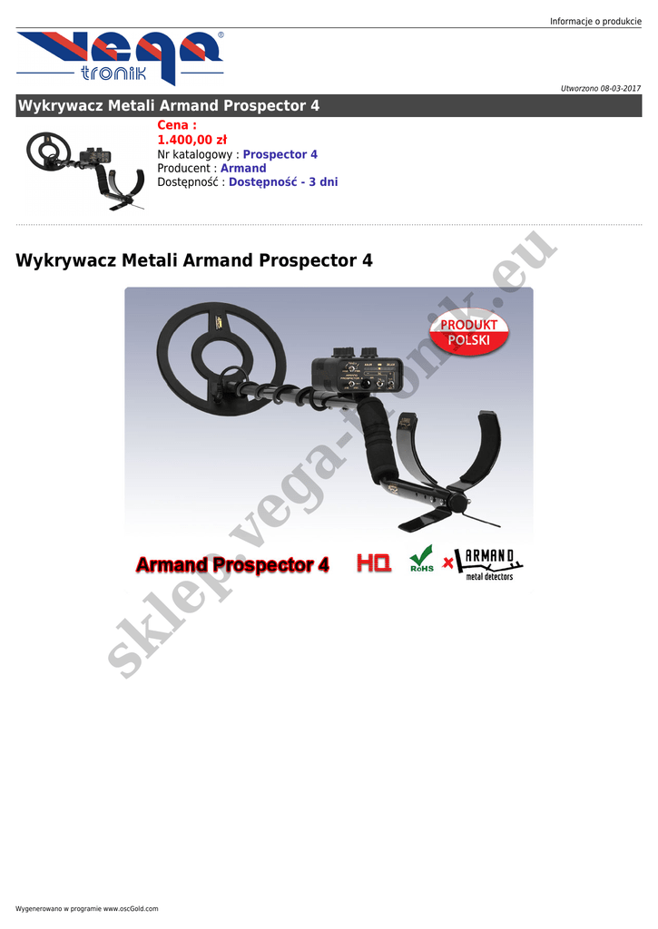 Informacje o produkcie Utworzono 08-03-2017 Wykrywacz Metali Armand Prospector 4 Cena : 1.400,00 zł sk le p. ve g atr on i k. Wykrywacz Metali Armand Prospector 4 eu Nr katalogowy : Prospector 4 Producent : Armand Dostępność : Dostępność - 3 dni Wygenerowano w programie www.oscGold.com eu k. on i atr ve g p. sk le Opis: Uniwersalny wykrywacz metali do poszukiwań militariów i monet. Posiada wbudowane zasilanie akumulatorowe i latarkę. Jest lekki i łatwy w obsłudze z możliwością wielu ustawień. W zestawie ładowarka sieciowa. Wykrywacz metali Armand Prospector 4 jest następcą niezwykle popularnego Prospectora 3. Zastosowano w nim elementy regulacyjne o lepszej ergonomii, oferujące wyższy komfort pracy. Ponadto wbudowano zasilanie akumulatorowe pozwalające uzyskać znacznie dłuższy czas pracy i eliminujące konieczność otwierania obudowy przy zmianie baterii. Armand Prospector 4 zapewni niezapomniane wrażenia z poszukiwań skarbów oraz eksploracji pobojowisk, jest idealny dla pasjonatów: kolekcjonerstwa, militariów i historii. Linia wykrywaczy Armand Prospector jest stale produkowana i ulepszana od ponad 20 lat. Armand Prospector 4 to połączenie nowoczesności i prostoty obsługi. Informacje o produkcie Nowoczesność jest wyrażona między innymi ażurową sondą i płytką wykonaną w montażu powierzchniowym SMD. Prostotę obsługi cechuje tradycyjny układ pokręteł i przełączników powodujący łatwość i intuicyjność obsługi. Armand Prospector 4 - Wykrywacz uniwersalny - Wbudowane zasilanie - Wbudowana latarka W zestawie: eu - Wykrywacz metali Armand Prospector 4 - Instrukcja w języku polskim - 24 miesięczna gwarancja - Ładowarka sieciowa Dane techniczne: sk le p. ve g atr on i k. Wykrywa wszystkie metale i rozróżnia na żelazne i kolorowe. Ciężar: 1,2 kg. Wykrywacz jest lekki i kompaktowy. Zasilanie: wbudowane akumulatory. Charakteryzuje się niskim poborem prądu. Średnica sondy: 28 cm. Sonda wykrywacza jest całkowicie wodoszczelna i można ją zanurzać w wodzie. Posiada przycisk zerowania, po naciśnięciu którego wykrywacz automatycznie dopasowuje się do gruntu, wyrównując przy tym poziom sygnału. Posiada pięć stylowych pokręteł na obudowie sterujących pracą wykrywacza. Przełączniki na przedzie obudowy pozwalają na wybranie trybu pracy dynamicznej lub statycznej, kontroli napięcia zasilania i włączenia. Posiada dodatkowy przełącznik wyboru pomiędzy Gruntem, a Dyskryminacją. Poprawia to proces rozróżniania metali, niezależnie od trybu pracy. Posiada dwa tryby pracy: statyczną i dynamiczną. W trybie pracy statycznej wykrywa w czasie bezruchu i w czasie poruszania sondą, natomiast w trybie pracy dynamicznej wykrywa tylko w czasie poruszania sondą. Na pracy dynamicznej wykrywacz automatycznie dopasowuje się do poziomu gruntu. Wykrywacz posiada wskaźnik na diodach świecących. Punkt świetlny przesuwa się w jedną stronę od środka przy wykryciu przedmiotu wykonanego z metalu kolorowego, a w drugą stronę od środka dla przedmiotu wykonanego z żelaza i jego stopów. Wskaźnikiem tym sprawdza się również poziom napięcia baterii. Przy wykryciu metalu dźwięk narasta i jest słyszalny w głośniku. Dźwięk jest czysty i pewny. Po włączeniu słuchawek głośnik zostaje automatycznie wyciszony. Gniazdo słuchawkowe jest kompatybilne z dowolnym typem słuchawek z wtykiem mini jack stereo. Używanie słuchawek zapewnia oszczędność baterii oraz dokładniejszy odbiór sygnałów. Po włączeniu zapala się dioda. Posiada test poziomu baterii realizowany przełącznikiem. Sygnalizuje rozładowywanie się baterii poprzez diody oraz sygnał dźwiękowy. Posiada mocną i ergonomiczną obudowę (z łatwym dostępem) zawierającą elektronikę i baterie. Składanie i rozkładanie wykrywacza trwa moment, a rozłożony na części mieści się np. w niewielkiej torbie lub plecaku. Rurka aluminiowa pokryta jest lakierem piecowym gwarantującym trwałość i estetykę. W naszych wykrywaczach metali zastosowaliśmy nowoczesny typ rurki nośnej z regulowanym podłokietnikiem i czarną pianką, a także przyciskowymi zatrzaskami rurek oraz sztywną rurkę z tworzywa, łączącą sondę z rurką aluminiową. Takie rozwiązanie to ergonomia i komfort w obsłudze. Ekologiczny dzięki ładowaniu sieciowemu i braku baterii. Wyprodukowany w Polsce przez firmę Armand Metal Detectors. Wygenerowano w programie www.oscGold.com