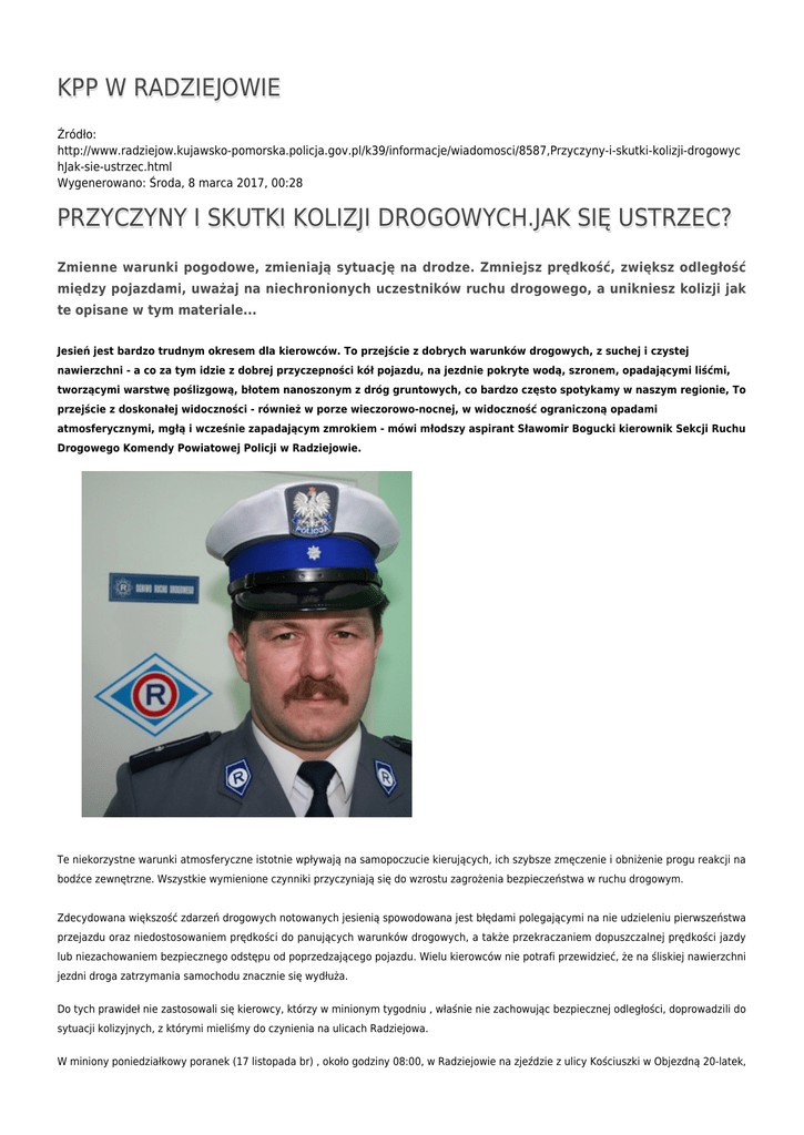 KPP W RADZIEJOWIE Źródło: http://www.radziejow.kujawsko-pomorska.policja.gov.pl/k39/informacje/wiadomosci/8587,Przyczyny-i-skutki-kolizji-drogowyc hJak-sie-ustrzec.html Wygenerowano: Środa, 8 marca 2017, 00:28 PRZYCZYNY I SKUTKI KOLIZJI DROGOWYCH.JAK SIĘ USTRZEC? Zmienne warunki pogodowe, zmieniają sytuację na drodze. Zmniejsz prędkość, zwiększ odległość między pojazdami, uważaj na niechronionych uczestników ruchu drogowego, a unikniesz kolizji jak te opisane w tym materiale... Jesień jest bardzo trudnym okresem dla kierowców. To przejście z dobrych warunków drogowych, z suchej i czystej nawierzchni - a co za tym idzie z dobrej przyczepności kół pojazdu, na jezdnie pokryte wodą, szronem, opadającymi liśćmi, tworzącymi warstwę poślizgową, błotem nanoszonym z dróg gruntowych, co bardzo często spotykamy w naszym regionie, To przejście z doskonałej widoczności - również w porze wieczorowo-nocnej, w widoczność ograniczoną opadami atmosferycznymi, mgłą i wcześnie zapadającym zmrokiem - mówi młodszy aspirant Sławomir Bogucki kierownik Sekcji Ruchu Drogowego Komendy Powiatowej Policji w Radziejowie. Te niekorzystne warunki atmosferyczne istotnie wpływają na samopoczucie kierujących, ich szybsze zmęczenie i obniżenie progu reakcji na bodźce zewnętrzne. Wszystkie wymienione czynniki przyczyniają się do wzrostu zagrożenia bezpieczeństwa w ruchu drogowym. Zdecydowana większość zdarzeń drogowych notowanych jesienią spowodowana jest błędami polegającymi na nie udzieleniu pierwszeństwa przejazdu oraz niedostosowaniem prędkości do panujących warunków drogowych, a także przekraczaniem dopuszczalnej prędkości jazdy lub niezachowaniem bezpiecznego odstępu od poprzedzającego pojazdu. Wielu kierowców nie potrafi przewidzieć, że na śliskiej nawierzchni jezdni droga zatrzymania samochodu znacznie się wydłuża. Do tych prawideł nie zastosowali się kierowcy, którzy w minionym tygodniu , właśnie nie zachowując bezpiecznej odległości, doprowadzili do sytuacji kolizyjnych, z którymi mieliśmy do czynienia na ulicach Radziejowa. W miniony poniedziałkowy poranek (17 listopada br) , około godziny 08:00, w Radziejowie na zjeździe z ulicy Kościuszki w Objezdną 20-latek, kierujący fiatem brava najechał na tył poprzedzającego go volkswagena golfa. Niecałe cztery godziny później (godzina 11:35) w innej części miasta, na ulicy Brzeskiej 23-latka jadąca fiatem tipo z tej samej przyczyny, „zakończyła jazdę” na tyle poprzedzającego ją volkswagena golfa, kierowanego przez 20-latkę, mieszkankę Piotrkowa Kujawskiego, utrudniając skutecznie na blisko 30 minut ruch na newralgicznej ulicy, będącej fragmentem drogi wojewódzkiej nr 266. Mundurowi, którzy obsługiwali zdarzenia drogowe poza punktami karnymi za spowodowanie zagrożenia w ruchu rogowych ukarali ich sprawców 100 złotowymi mandatami. W obu tych przypadkach poza uszkodzeniami karoserii, które będą wymagały niewątpliwie wizyt w warsztacie naprawczym, nikt z podróżujących nimi, nie odniósł obrażeń ciała. Pierwsze oznaki zbliżającej się zimy. Następnego dnia (18 listopada 2008r, w Przysieku gmina Dobre, kilkanaście minut przed godziną siódmą, doszło do kolizji dwóch pojazdów. Powodem jej zaistnienia była utrata panowania nad pojazdem na śliskiej nawierzchni. 33-letnia mieszkanka tej gminy, kierująca oplem astrą, na łuku drogi w wyniku niedostosowania prędkości do panujących warunków na drodze ( pierwszy poranny przymrozek) zjechała na przeciwny pas drogi, po którym poruszał się volkswagen golf , kierowany przez 34-latka, w wyniku czego doszło do zderzenia aut. Na szczęście prędkość nie była duża, w związku z czym i skutki nie były groźne, niemniej pojazdy jak w poprzednich przypadkach muszą przejść naprawę. Pani, która przyczyniła się do zaistnienia kolizji poza 8 [punktami karnymi ukarana została przez stróżów prawa 100 złotowym mandatem. W końcu najczęstszą przyczyną sytuacji kolizyjnych i wypadków drogowych jest wymuszenie pierwszeństwa przejazdu i to bez względu na porę roku. Z tej przyczyny miała miejsce kolizja w Morzycach gmina Bytoń w miniony wtorek (19.11.br), około godziny 08:30. Jadący oplem corsą, 57-letni kierowca wymuszając pierwszeństwo jazdy doprowadził do kolizji z peugeotem 307, kierowanym przez 49-letnią kierującą. Mężczyzna przez policjantów ukarany został mandatem karnym i doliczono mu punkty karne do konta punktowego Zmienne warunki atmosferyczne wymuszają na nas odpowiednie zachowania i reakcje. Obecnie możemy w każdej chwili spotkać się ze zmianą pogody, która zmienia warunki na drodze- dodaje kierownik drogówki Jak się na to przygotować? ● 1. Poruszanie się po jezdni przykrytej spadającymi liśćmi. Każdy zgodzi się, że najwięcej uroku jesieni tkwi w kolorach liści, jednak kiedy zaczynają one spadać z drzew i nasiąkają wodą pod wpływem deszczu stają się prawdziwym zagrożeniem Są śliskie i utrudniają utrzymanie przyczepności samochodu. Mogą także zasłaniać malowane oznaczenia na jezdni. Dodatkowo zbierają się pod wycieraczkami, dzięki czemu efektywność ich pracy spada. Pilnuj aby Twoja przednia szyba zwłaszcza w tym okresie, była czysta. Zwracaj także uwagę na leżące na drodze liście zwłaszcza wtedy, kiedy wykonujesz manewry nawracania czy skrętu. ● 2. Dostosuj swoją jazdę do warunków Każdego dnia od momentu cofnięcia czasu o godzinę w październiku dzień jest coraz krótszy. Przez co szybciej robi się ciemno na ulicach. Dlatego powinnyśmy uważać dużo bardziej na rowerzystów, bawiącej się dzieci przy ulicy i pieszych, ponieważ są oni jeszcze mniej widoczni. Ponieważ wschód słońca jest później niż zwykle, powinnyśmy zawsze mieć parę okularów przeciwsłonecznych w samochodzie żeby nie dać się zaskoczyć w czasie jazdy oślepiającemu oświetleniu. ● 3. Uważaj na mr