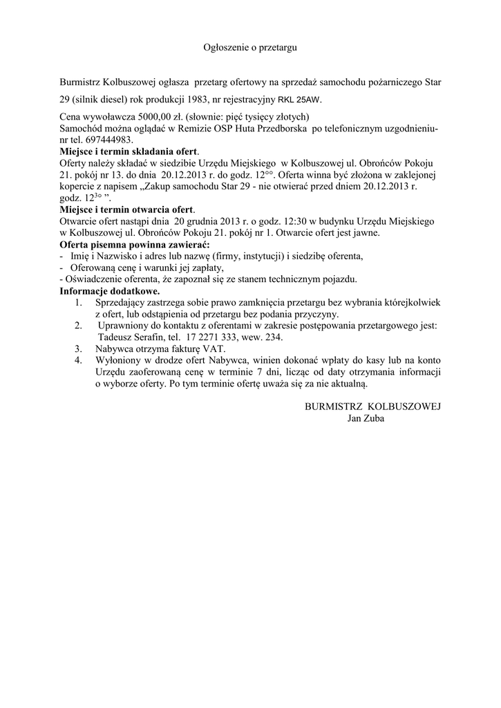 Ogłoszenie o przetargu Burmistrz Kolbuszowej ogłasza przetarg ofertowy na sprzedaż samochodu pożarniczego Star 29 (silnik diesel) rok produkcji 1983, nr rejestracyjny RKL 25AW . Cena wywoławcza 5000,00 zł. (słownie: pięć tysięcy złotych) Samochód można oglądać w Remizie OSP Huta Przedborska po telefonicznym uzgodnieniunr tel. 697444983. Miejsce i termin składania ofert. Oferty należy składać w siedzibie Urzędu Miejskiego w Kolbuszowej ul. Obrońców Pokoju 21. pokój nr 13. do dnia 20.12.2013 r. do godz. 12°°. Oferta winna być złożona w zaklejonej kopercie z napisem „Zakup samochodu Star 29 - nie otwierać przed dniem 20.12.2013 r. godz. 123° ”. Miejsce i termin otwarcia ofert. Otwarcie ofert nastąpi dnia 20 grudnia 2013 r. o godz. 12:30 w budynku Urzędu Miejskiego w Kolbuszowej ul. Obrońców Pokoju 21. pokój nr 1. Otwarcie ofert jest jawne. Oferta pisemna powinna zawierać: - Imię i Nazwisko i adres lub nazwę (firmy, instytucji) i siedzibę oferenta, - Oferowaną cenę i warunki jej zapłaty, - Oświadczenie oferenta, że zapoznał się ze stanem technicznym pojazdu. Informacje dodatkowe. 1. Sprzedający zastrzega sobie prawo zamknięcia przetargu bez wybrania którejkolwiek z ofert, lub odstąpienia od przetargu bez podania przyczyny. 2. Uprawniony do kontaktu z oferentami w zakresie postępowania przetargowego jest: Tadeusz Serafin, tel. 17 2271 333, wew. 234. 3. Nabywca otrzyma fakturę VAT. 4. Wyłoniony w drodze ofert Nabywca, winien dokonać wpłaty do kasy lub na konto Urzędu zaoferowaną cenę w terminie 7 dni, licząc od daty otrzymania informacji o wyborze oferty. Po tym terminie ofertę uważa się za nie aktualną. BURMISTRZ KOLBUSZOWEJ Jan Zuba