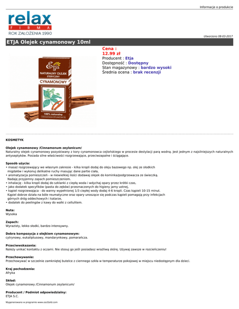 Informacje o produkcie Utworzono 08-03-2017 ETJA Olejek cynamonowy 10ml Cena : 12.99 zł Producent : Etja Dostępność : Dostępny Stan magazynowy : bardzo wysoki Średnia ocena : brak recenzji KOSMETYK Olejek cynamonowy /Cinnamonum zeylanicum/ Naturalny olejek cynamonowy pozyskiwany z kory cynamonowca cejlońskiego w procesie destylacji parą wodną. Jest jednym z najsilniejszych naturalnych antyseptyków. Posiada silne właściwości rozgrzewające, przeciwzapalne i ściągające. Sposób użycia: • masaż rozgrzewający we własnym zakresie - kilka kropli dodaj do oleju bazowego np. olej ze słodkich migdałów i wykonuj delikatne ruchy masując dane partie ciała, • aromatyzacja pomieszczeń - w niewielkiej ilości dodawaj olejek do kominka/podgrzewacza ze świeczką. Nadaję przyjemny zapach pomieszczeniom. • inhalację - kilka kropli dodaj do szklanki z ciepłą woda i wdychaj opary przez krótki czas, • jako dodatek specyfików (pasta do zębów) przeznaczonych do higieny jamy ustnej, • kąpiel rozgrzewająca - do wanny wypełnionej 1/3 ciepłej wody dodaj 4-6 kropli. Czas kąpieli 10-15 minut. Kąpiel dobrze działa na bóle reumatyczne oraz opary unoszące się podczas kąpieli pomagają przy infekcjach górnych dróg oddechowych i katarze, • dodatek do peelingów z kawy do walki z cellulitem. Nuta: Wysoka Zapach: Wyrazisty, lekko słodki, bardzo intensywny. Dobra kompozycja z olejkiem cynamonowym: cytrynowy, eukaliptusowy, mandarynkowy, pomarańcza. Przeciwwskazania: Należy unikać kontaktu z oczami. Nie stosuj go jeśli posiadasz wrażliwą skórę. Używaj zawsze w rozcieńczeniu! Przechowywanie: Przechowywać w szczelnie zamkniętej butelce z ciemnego szkła w temperaturze pokojowej w miejscu niedostępnym dla dzieci. Kraj pochodzenia: Afryka Skład: Olejek cynamonowy /Cinnamonum zeylanicum/ Producent / Podmiot odpowiedzialny: ETJA S.C. Wygenerowano w programie www.oscGold.com ul. Łęczycka 29 82-300 Elbląg Opakowanie: 10ml