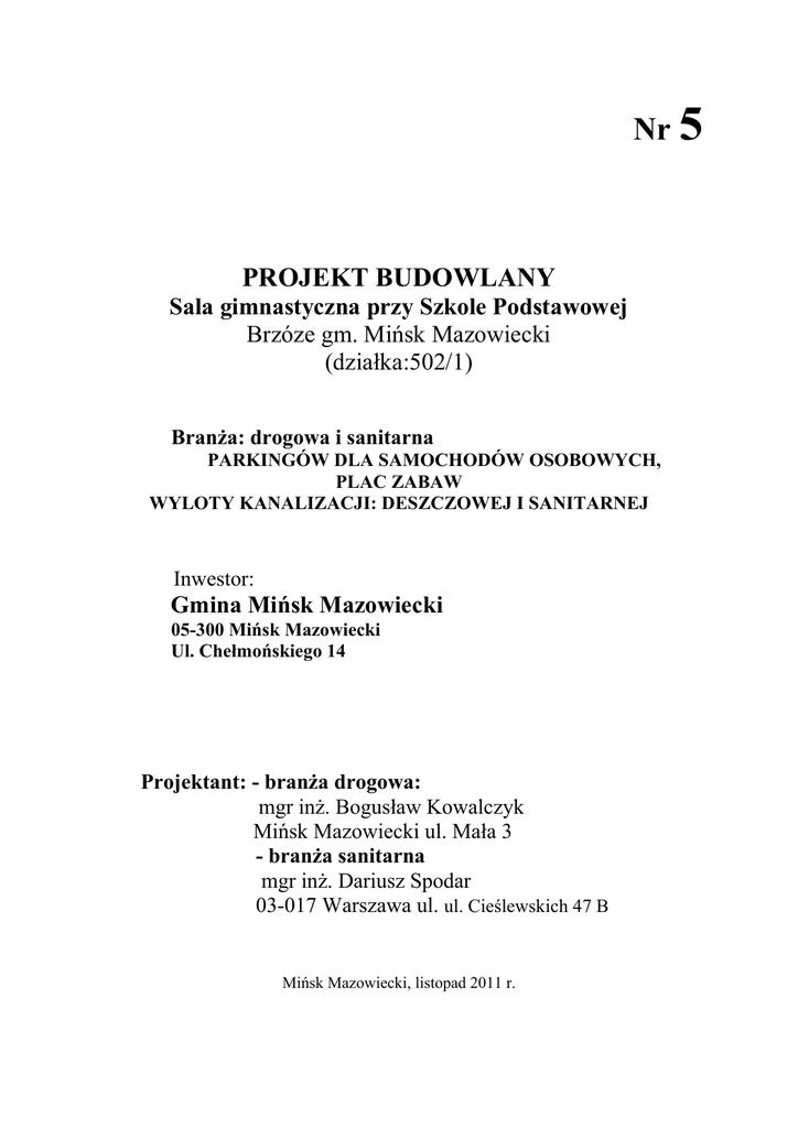 Nr 5 PROJEKT BUDOWLANY Sala gimnastyczna przy Szkole Podstawowej Brzóze gm. Mińsk Mazowiecki (działka:502/1) Branża: drogowa i sanitarna PARKINGÓW DLA SAMOCHODÓW OSOBOWYCH, PLAC ZABAW WYLOTY KANALIZACJI: DESZCZOWEJ I SANITARNEJ Inwestor: Gmina Mińsk Mazowiecki 05-300 Mińsk Mazowiecki Ul. Chełmońskiego 14 Projektant: - branża drogowa: mgr inż. Bogusław Kowalczyk Mińsk Mazowiecki ul. Mała 3 - branża sanitarna mgr inż. Dariusz Spodar 03-017 Warszawa ul. ul. Cieślewskich 47 B Mińsk Mazowiecki, listopad 2011 r. Spis zawartości Projekt zagospodarowania terenu 2. Opis techniczny do projektu zagospodarowania części terenu 3. Projekt zagospodarowania terenu 1:500 4. Warunki i uzgodnienia a/ Zgoda i warunki na odprowadzanie wód deszczowych z projektowanych parkingów wydane przez Wojewódzki Zarząd Melioracji i Urządzeń Wodnych w Warszawie Oddział w Sokołowie Podlaskim –S/IMI-Up-4105/73/11 b/ Zmiana warunków na odprowadzanie ścieków wydane przez Wojewódzki Zarząd Melioracji i Urządzeń Wodnych w Warszawie Oddział w Sokołowie Podlaskim –S/IMI-Up-4105/72/11z dnia 14.09.2011 r. c/Decyzja Starostwa Powiatowego w Mińsku Mazowieckim nr WS.6341.106.2011 - pozwolenie wodnoprawne na odprowadzanie wód opadowych do rzeki Długa d/Decyzja Starostwa Powiatowego w Mińsku Mazowieckim nr WS.6341.109.2011 z dnia 03.10.2011r. - pozwolenie wodnoprawne na wprowadzanie ścieków bytowych do rzeki Długa e/ Opinia nr 1030/2011 z dnia 20.10.2011 r. Zespołu ds. Koordynacji Usytuowania Projektowanych Sieci Uzbrojenia Terenu dotycząca lokalizacji kanalizacji deszczowej, f/ Opinia nr 1031/2011 z dnia 06.10.2011 r. Zespołu ds. Koordynacji Usytuowania Projektowanych Sieci Uzbrojenia Terenu w sprawie zmiany lokalizacji oczyszczalni ścieków, kanalizacji sanitarnej i zalicznikowego przyłącza kablowego eNN. Projekt budowlany drogowy 1 Opis techniczny do projektu budowlanego 2.Plan sytuacyjno-wysokościowy 1:250 3.Przekroje normalne 1:50 4.Szczegóły konstrukcyjne 1:10 Projekt kanalizacji sanitarnej I Opis techniczny 1. Zakres opracowania 2. Podstawa opracowania 3. Rozwiązania techniczne projektowanej kanalizacji deszczowej 4. Roboty ziemne i prace montażowe 5. Obliczenia II RYSUNKI 1. Mapa sytuacyjno-wysokościowa, skala 1:250, 2. Profil podłużny 1:100/100, 3. Wpust deszczowy z osadnikiem, skala 1:20 4. Separator ropopochodnych – karta katalogowa 5. Schemat wylotu kanalizacyjnego. Plac zabaw - instrukcja montażu, kontroli, konserwacji i eksploatacji placu zabaw, - strony katalogowe, certyfikaty, - rozmieszczenie urządzeń. OPIS TECHNICZNY do projektu zagospodarowania części terenu działki 502/1 we wsi Brzóze gm. Mińsk Mazowiecki 1. Dane identyfikacyjne Inwestor: Gmina Mińsk Mazowiecki Projektant: - branża drogowa: mgr inż. Bogusław Kowalczyk Mińsk Mazowiecki ul. Mała 3 - branża sanitarna mgr inż. Dariusz Spodar 03-017 Warszawa ul. Cieślewskich 47B Przedmiot inwestycji: budowa parkingów dla samochodów osobowych zraz z odwodnieniem, oraz utwardzenie terenu przy łączniku Szkoły – wg projektu zamiennego zagospodarowania działki opracowanego przez mgr inż. Wiesławę Daniluk 2. Opis istniejącego zagospodarowania terenu. Terenem inwestycji jest część działek o nr ewidencyjnym 502/1 stanowiącej własność Gminy a będącej w użytkowaniu Szkoły Podstawowej w Brzózem. Na tym terenie istnieje wjazd i droga o jezdni szerokości 5,5 – 7.0 m o nawierzchni bitumicznej, teren utwardzony o nawierzchni bitumicznej służący jako parking dla samochodów osobowych – 4 stanowiska, w tym jedno dla samochodów osób niepełnosprawnych, oraz plac przed wejściem do Szkoły o nawierzchni z betonowej kostki brukowej i płytek betonowych o wymiarach 35 x 35 cm. Na działkę istnieją 3 zjazdy: główny z drogi lokalnej o nawierzchni gruntowej, której przedłużeniem jest droga wewnętrzna pożarowa o nawierzchni bitumicznej z wyjazdem na drogę lokalną oznaczona symbolem 20DK. Z tej drogi jest utworzony drugi zjazd do obsługi kotłowni. Na działce istnieją: budynek Szkoły z zapleczem, wewnętrzna droga dojazdowa i plac z parkingiem o nawierzchni bitumicznej, plac przed wejściem do budynku szkoły z betonowej kostki brukowej w dobrym stanie technicznym oraz plac przy łączniku z betonowych płytek chodnikowych w złym stanie technicznym. W granicach opracowania teren jest uzbrojony w sieci komunalne: kanalizację sanitarną czynną i częściową do przebudowy, szambo sanitarne do likwidacji, studnia kopana i wiercona – nieczynne – do likwidacji. Projektowane zagospodarowanie działki Wyliczenie ilości miejsc parkingowych: 821,2: 100 x 3 miejsca/100 m2 pu = 24.63 miejsca, w tym: powierzchnia usług oświaty wynosi: 821,2 m2 / 395,89 budynek istniejący + 425,3 m2 sala/ . 3. W obrębie terenu objętego inwestycją projektuje się w zakresie dróg: - wzdłuż drogi o nawierzchni bitumicznej stanowiska parkingowe dla samochodów osobowych prostopadłe do drogi, o wymiarach 2,30x 5,00 m w ilości 27 szt. /18 + 9 sztuk/, z częściową przebudową istniejącej drogi do szerokości 5,50 – 6.5 m, - przebudowę nawierzchni placu przy łączniku z płytek chodnikowych na betonową kostkę brukową, - budowę chodników wzdłuż Sali gimnastycznej o szerokości 1,5 m z betonowej kostki brukowej - dojazd gospodarczy o szerokości 4,0m o nawierzchni tłuczniowej, Nawierzchnię dróg i parkingów zaprojektowano, z betonowej kostki brukowej o grubości 8 cm, barwionej w całym przekroju, w następujących kolorach: szarym – drogi wewnętrzne; parkingi –czerwony ceglasty; linia rozdzielająca pomiędzy parkingami – czarne. Odprowadzenie wód deszczowych – powierzchniowe do kratki ściekowej. W zakresie branży sanitarnej - kanalizację deszczową do odprowadzenia wód opadowych z rur PCV DN315 mm - wpust uliczny klasy D400 i separator lamelowy ropopochodnych ECOL- UNIKON. Plac zabaw W południowej części działki zaprojektowano plac zabaw dla dzieci o